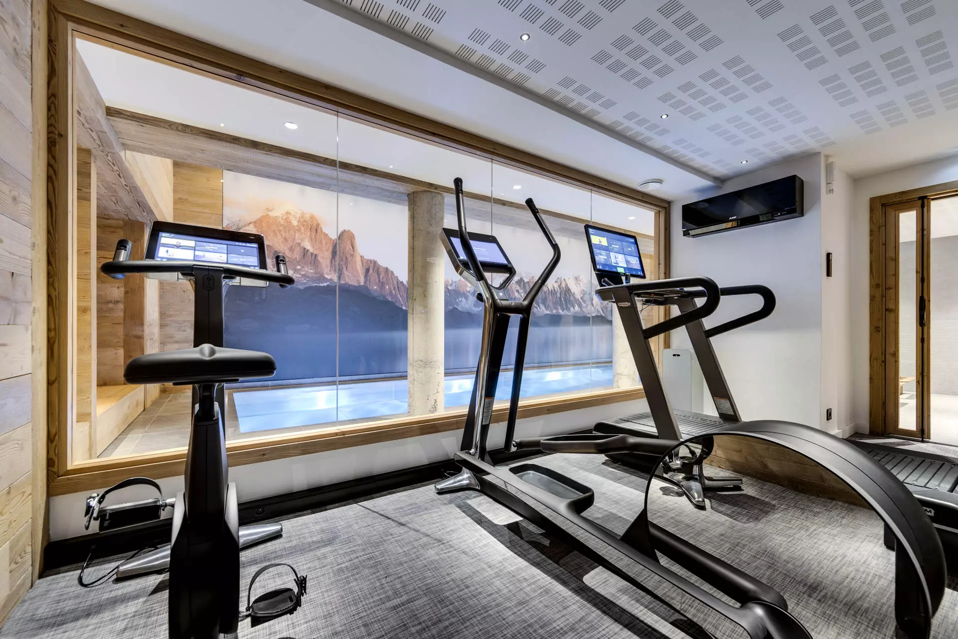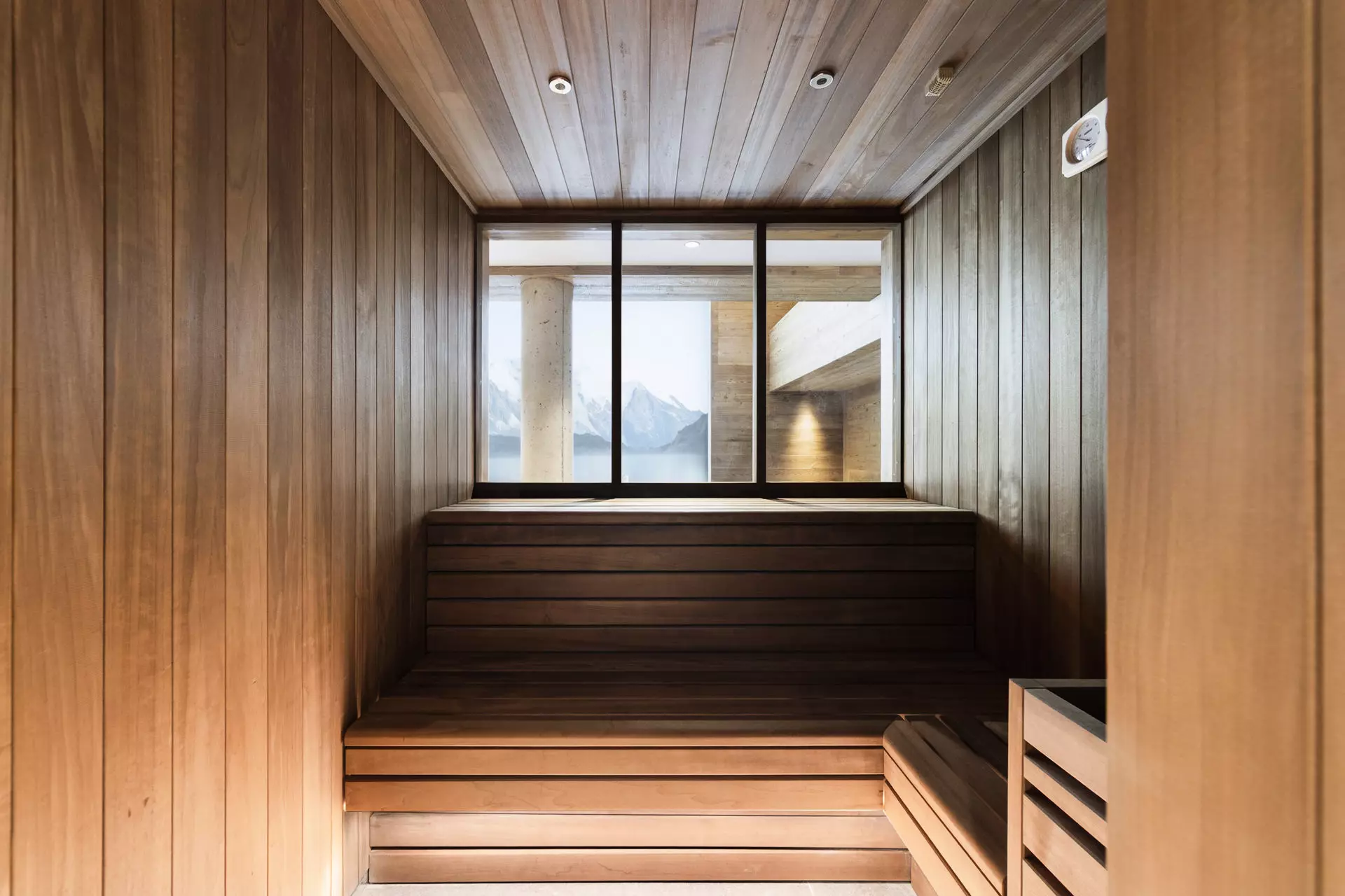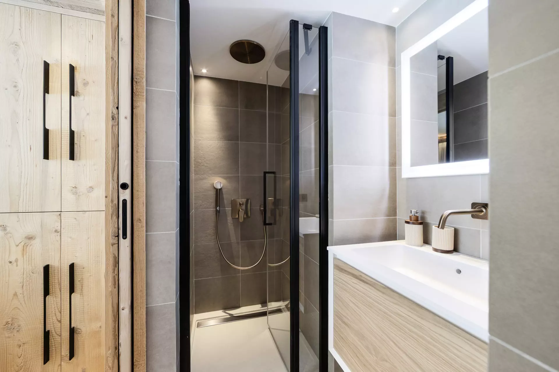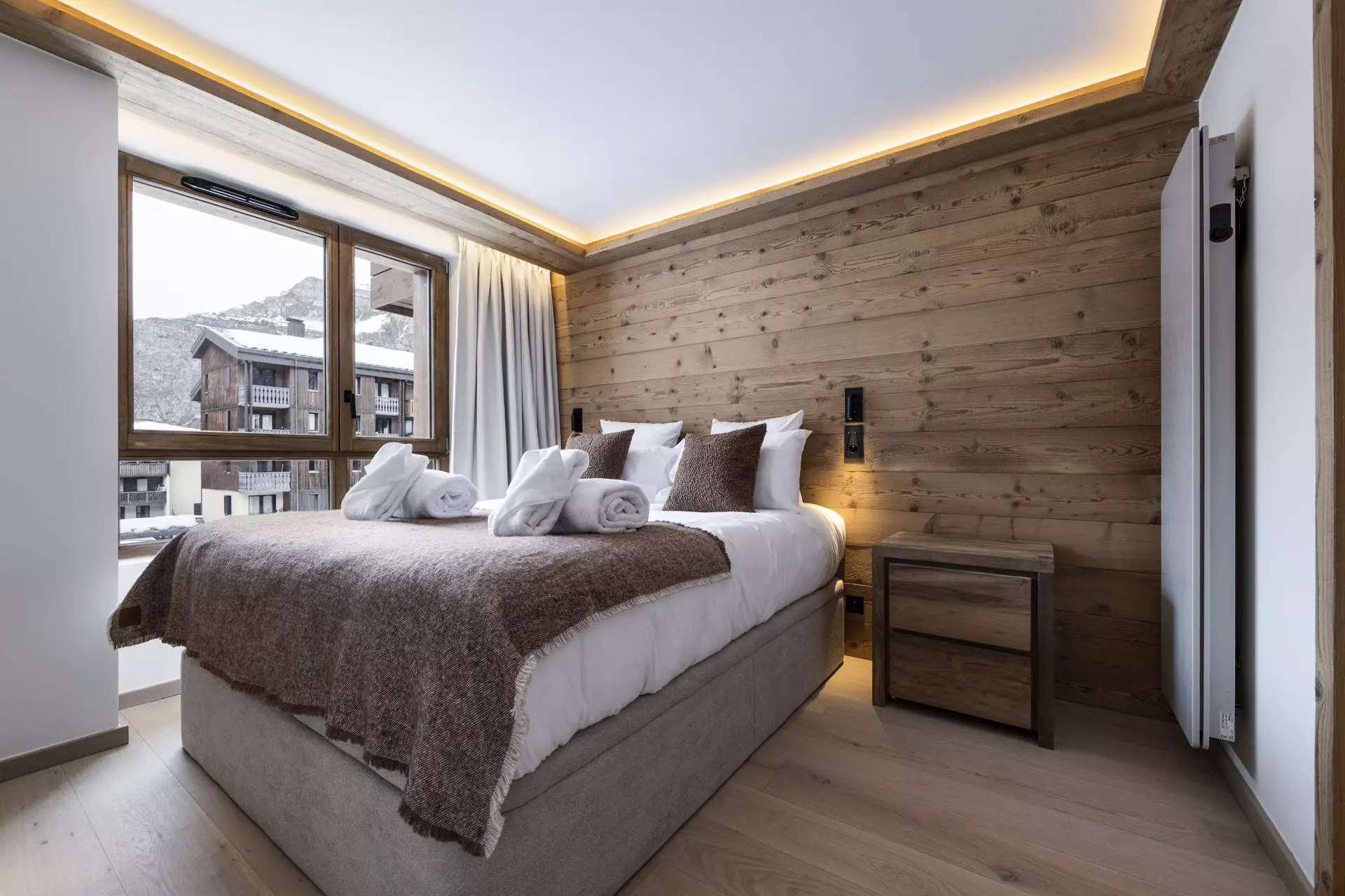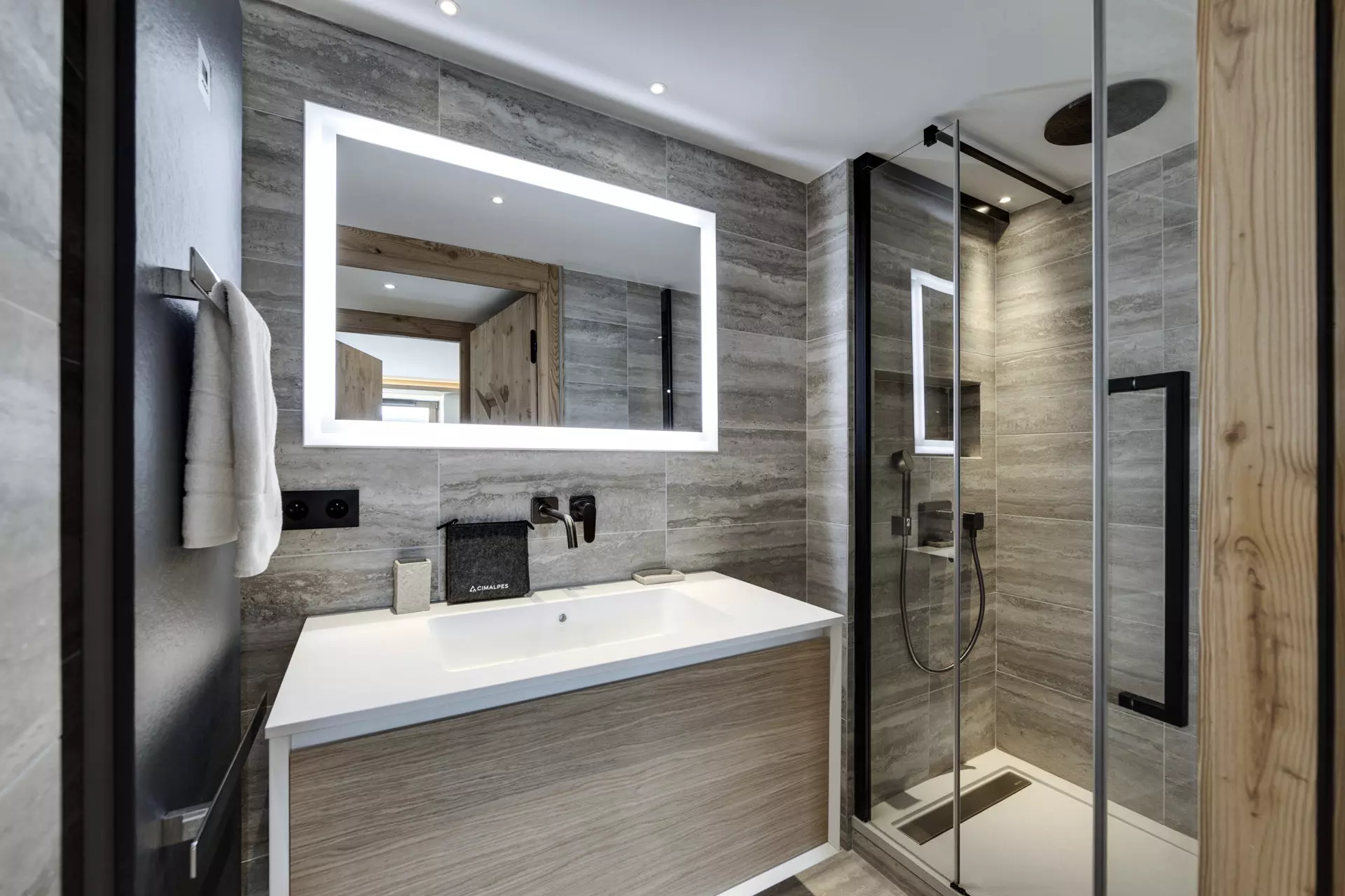 La décoration haut de gamme, au style contemporain et à l'ambiance traditionnelle mélange les matériaux alpins tels que le métal, le vieux bois, la pierre, etc.