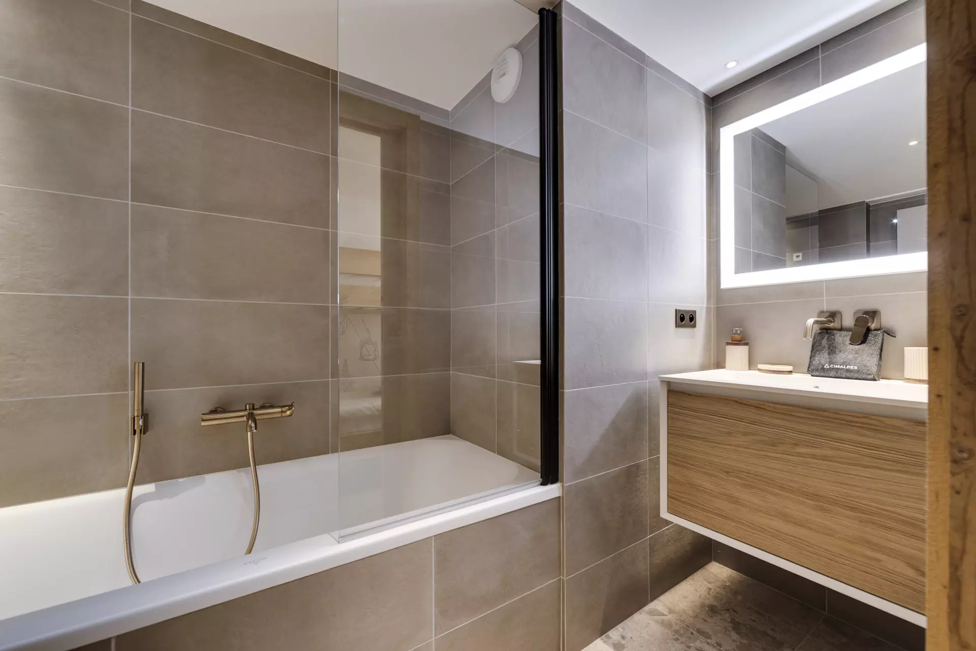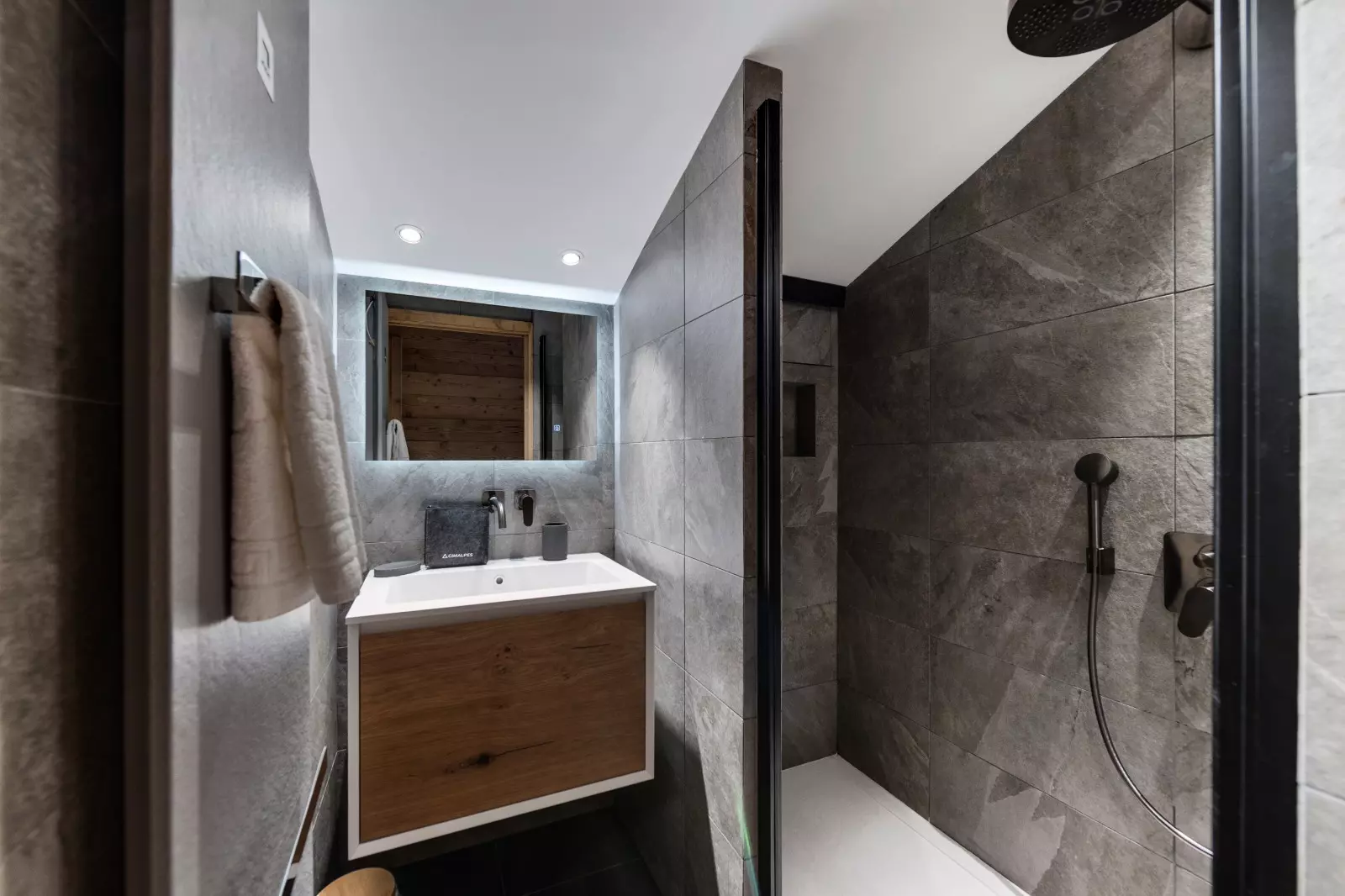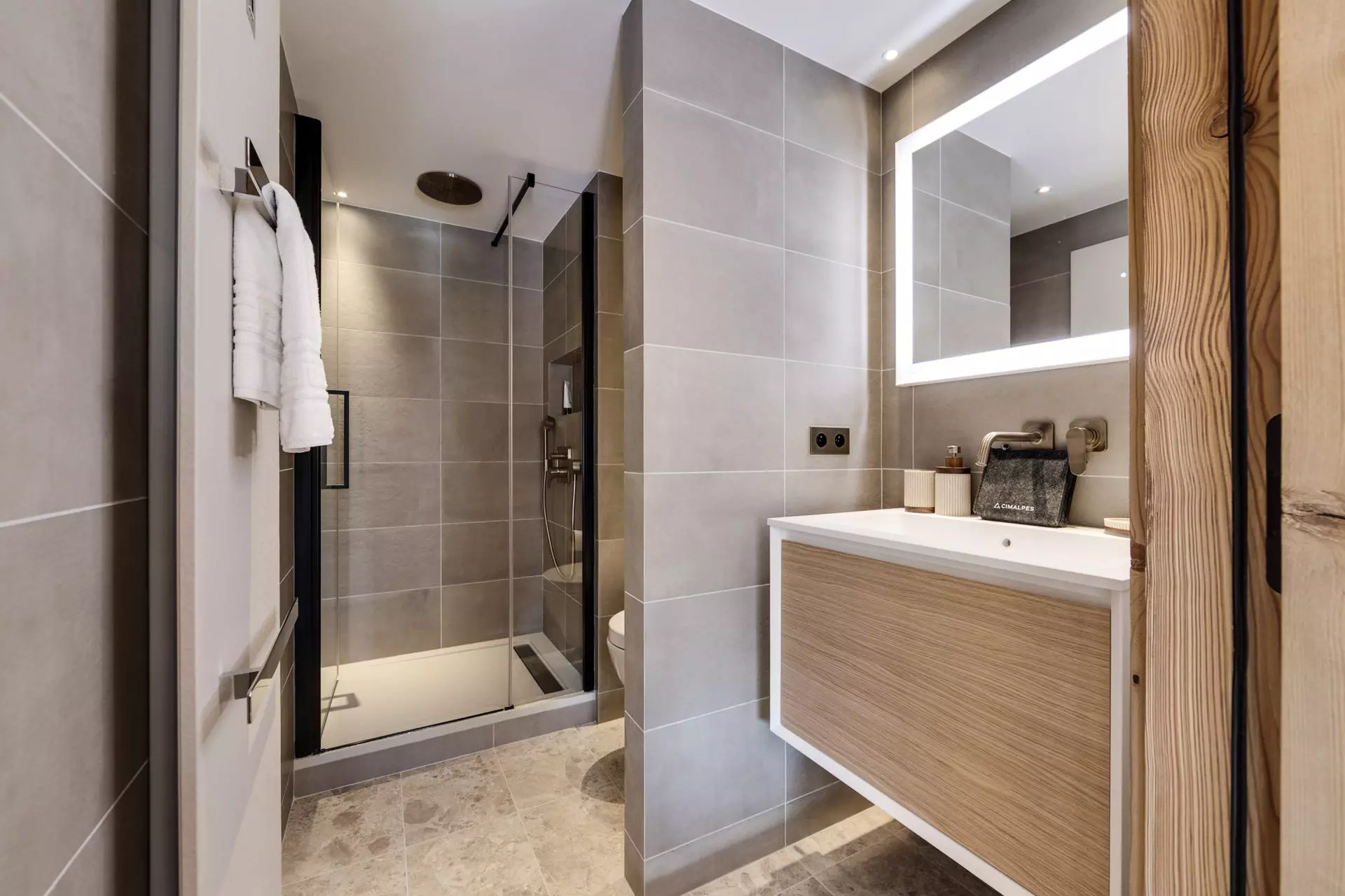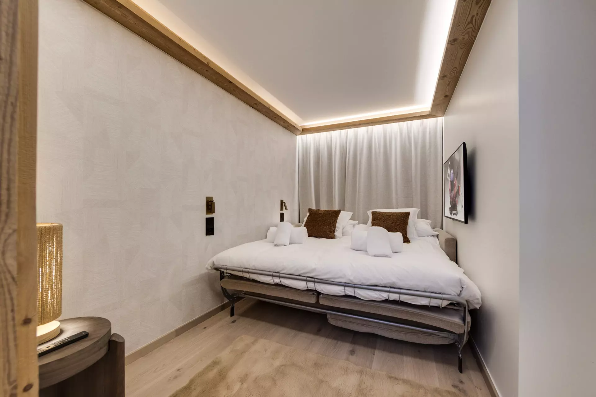 La décoration haut de gamme, au style contemporain et à l'ambiance traditionnelle mélange les matériaux alpins tels que le métal, le vieux bois, la pierre, etc.