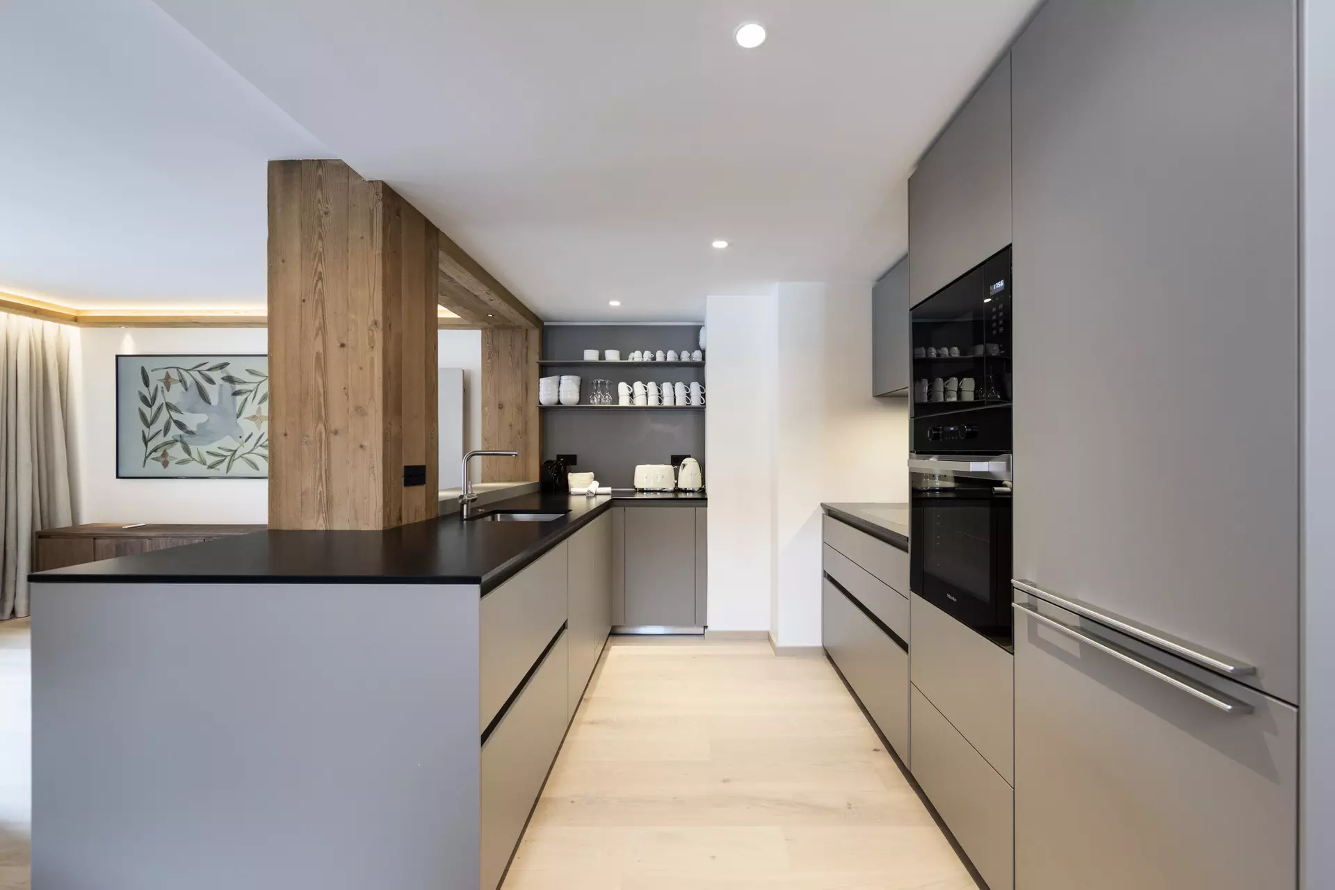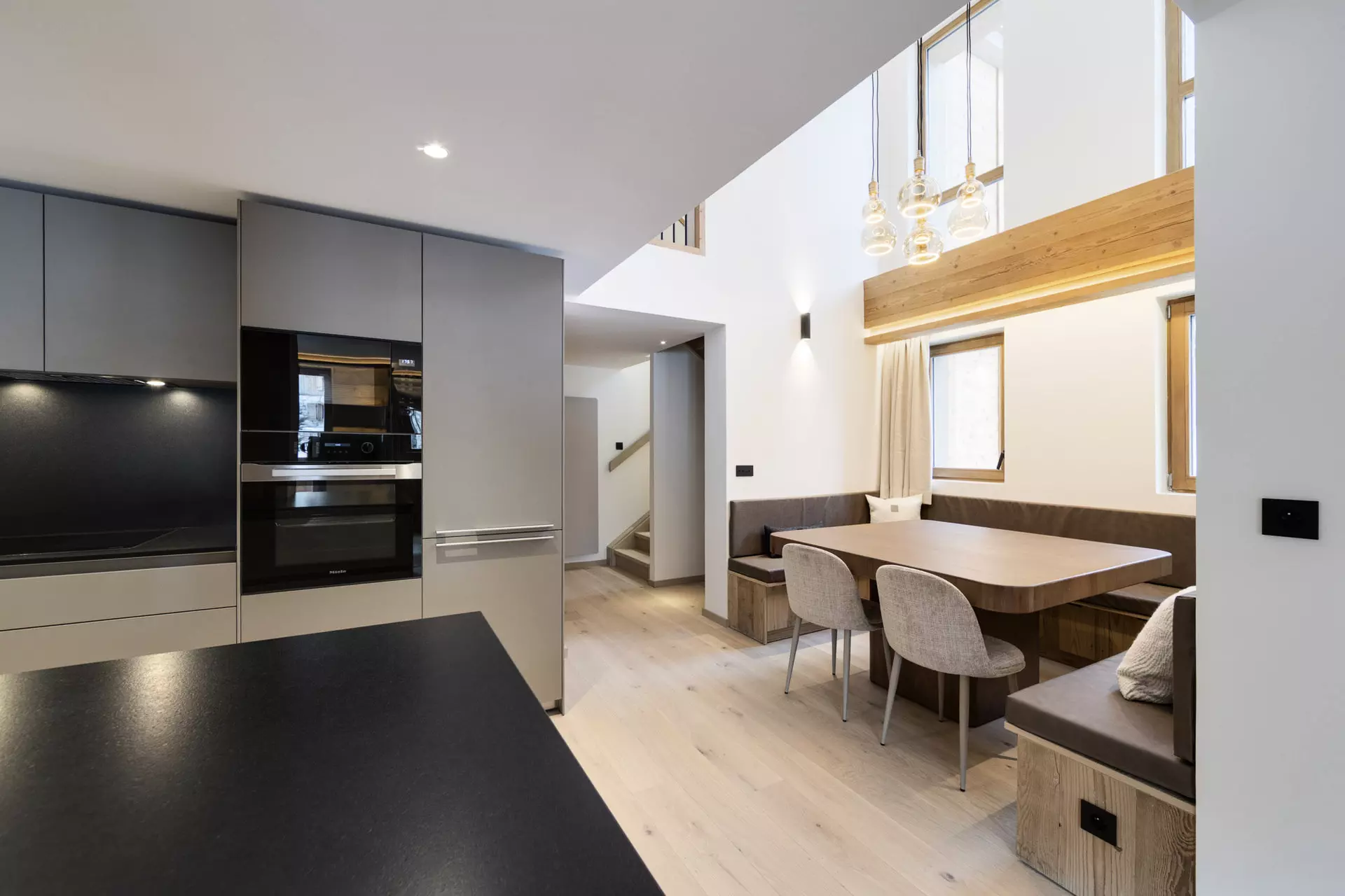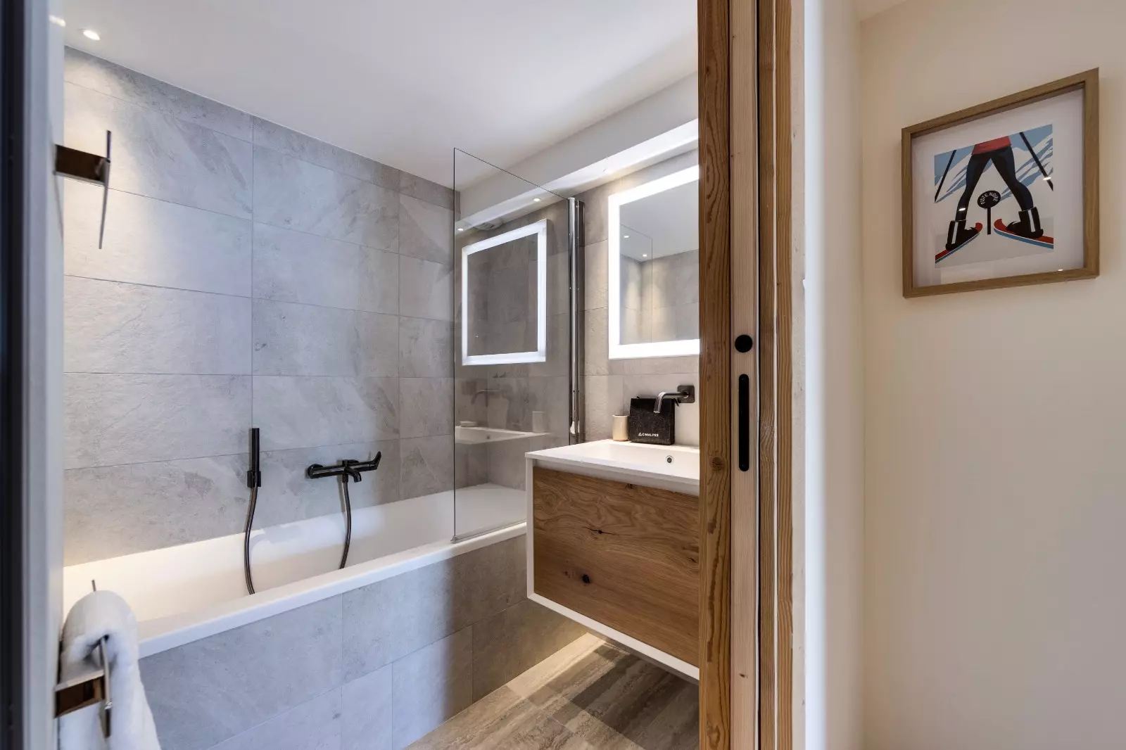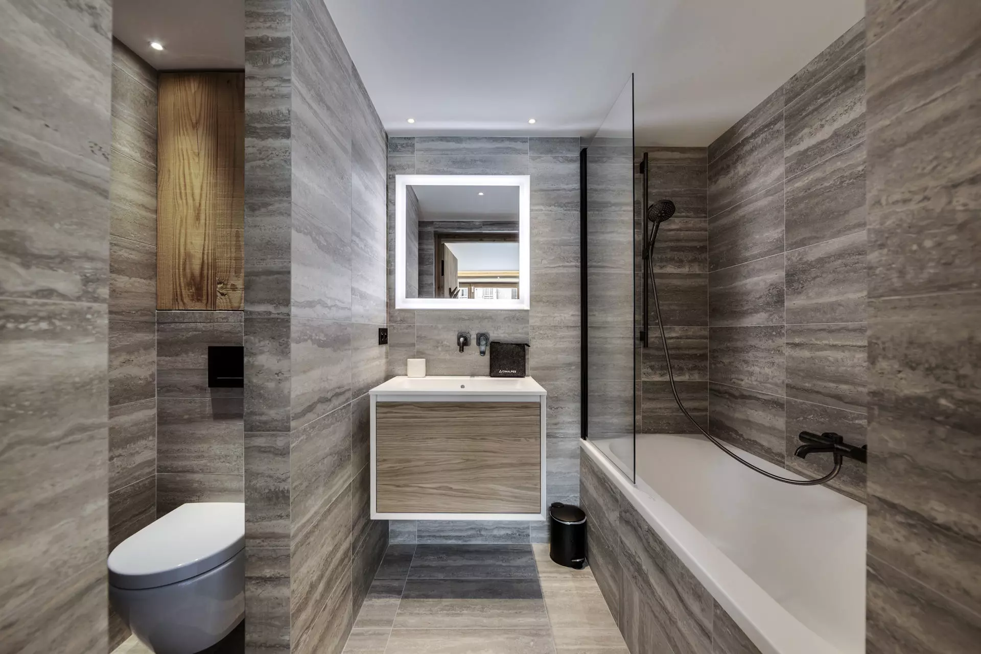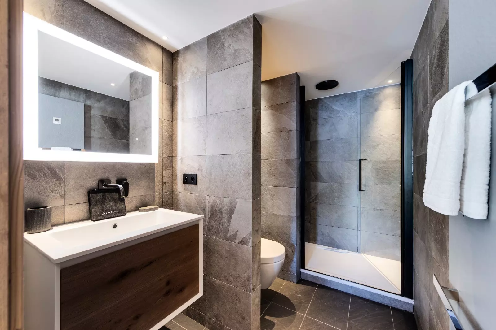 La décoration haut de gamme, au style contemporain et à l'ambiance traditionnelle mélange les matériaux alpins tels que le métal, le vieux bois, la pierre, etc.