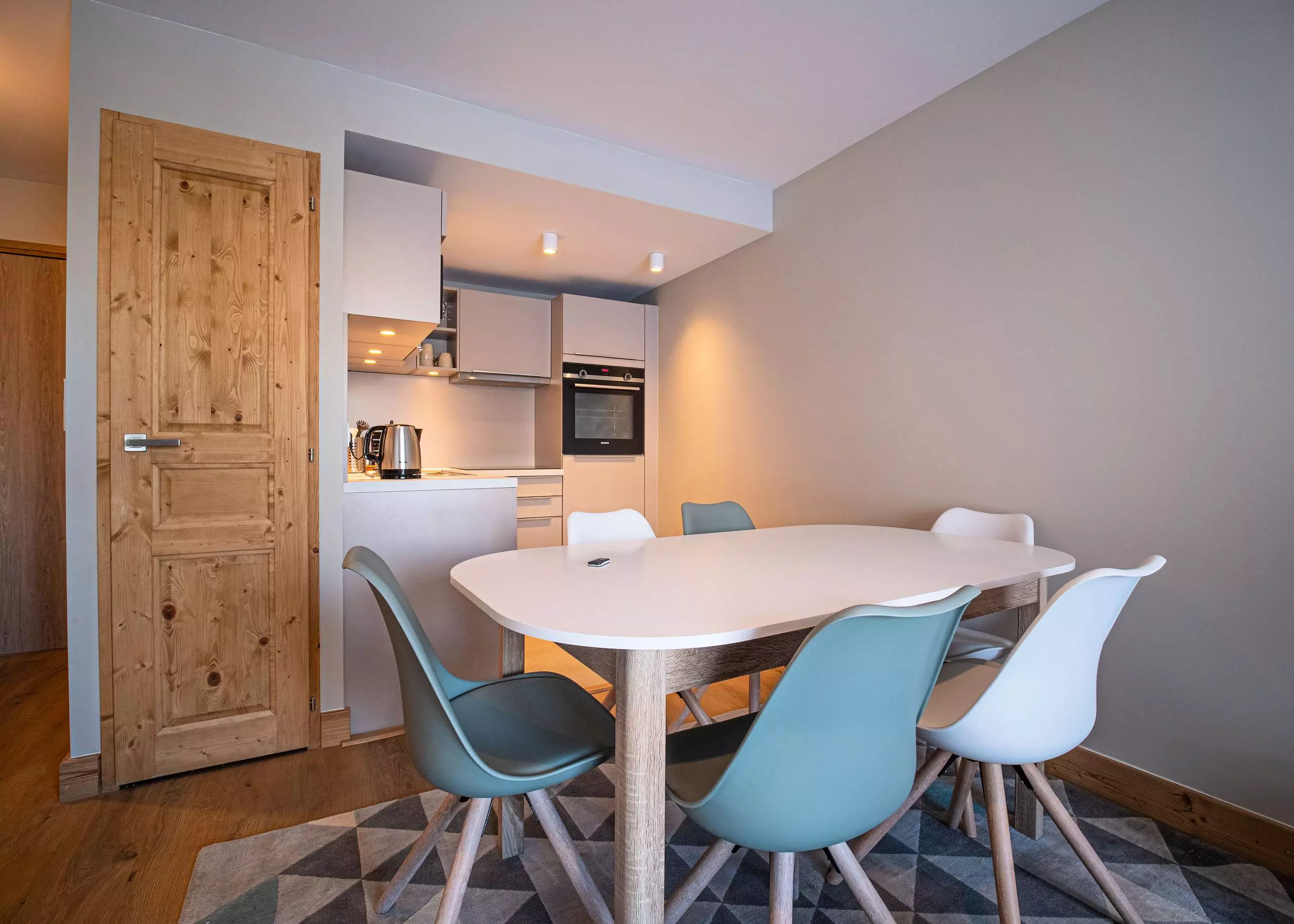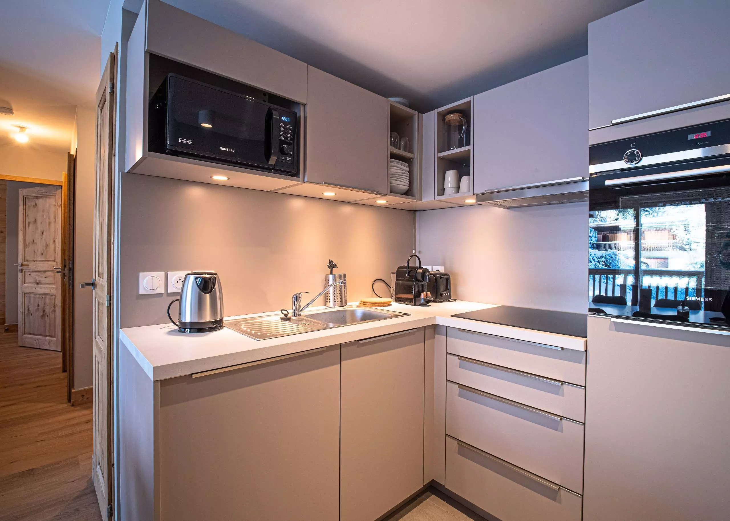 - Cuisine ouverte sur le séjour, parfaitement équipée avec lave-vaisselle, plaques vitrocéramiques, four micro-ondes, réfrigérateur avec freezer, cafetière Nespresso, bouilloire électrique, grille-pain, appareils à raclette et à fondue