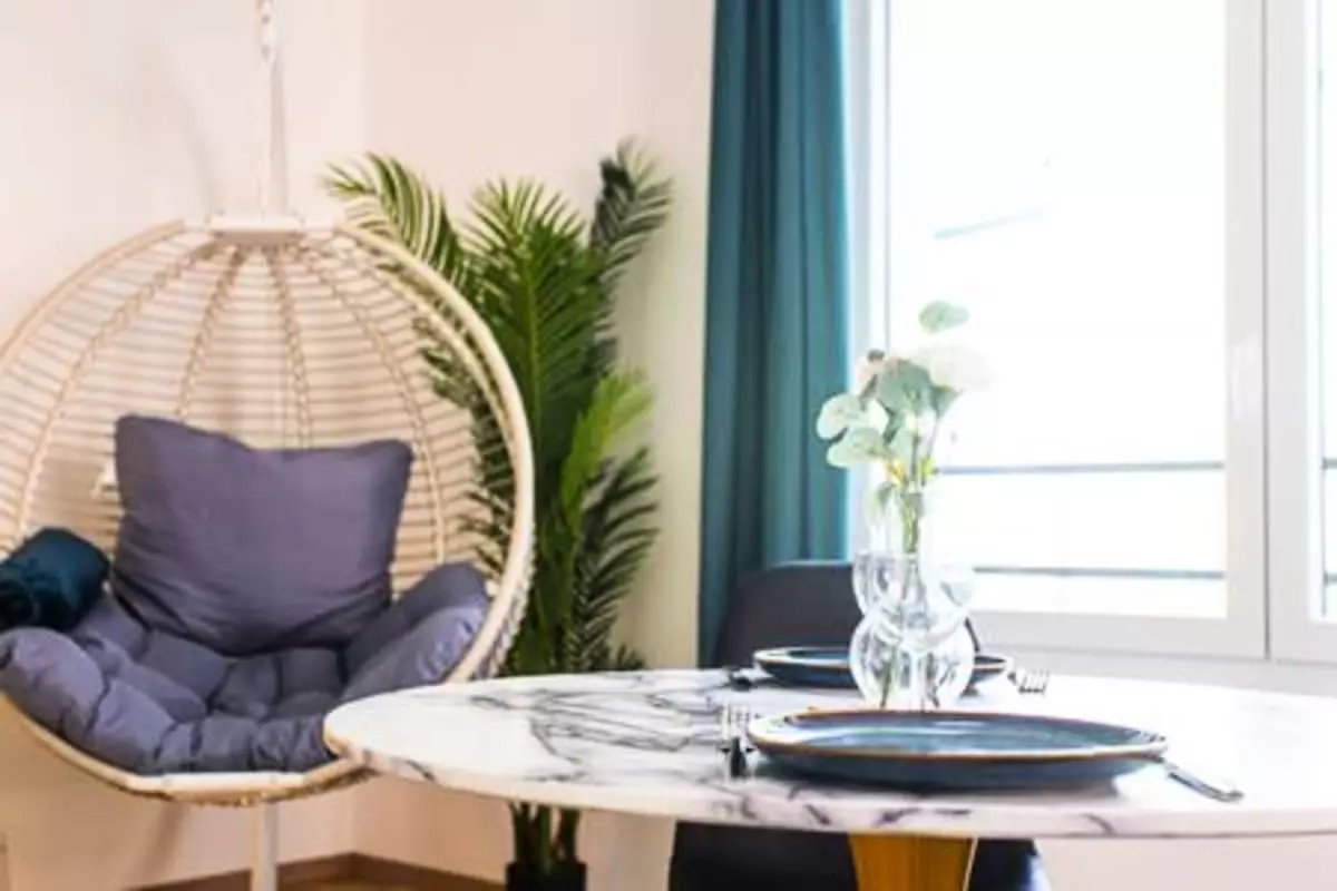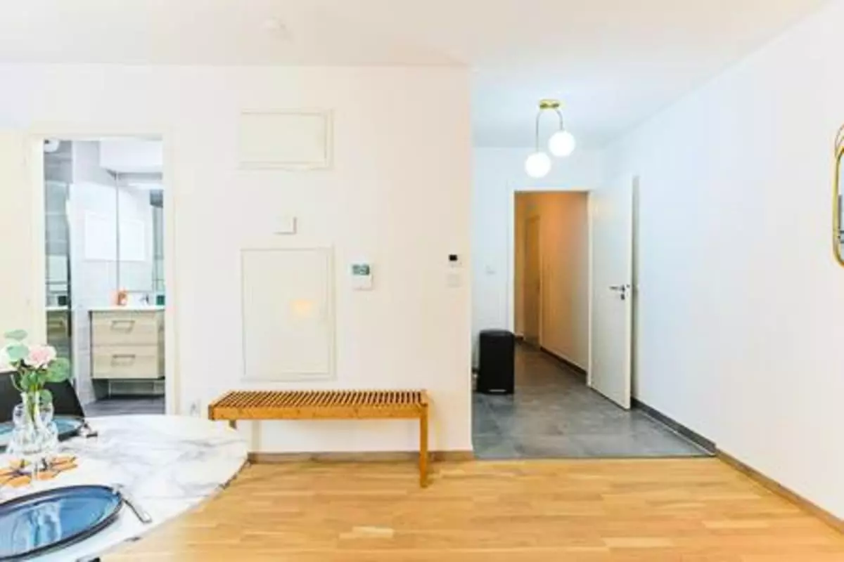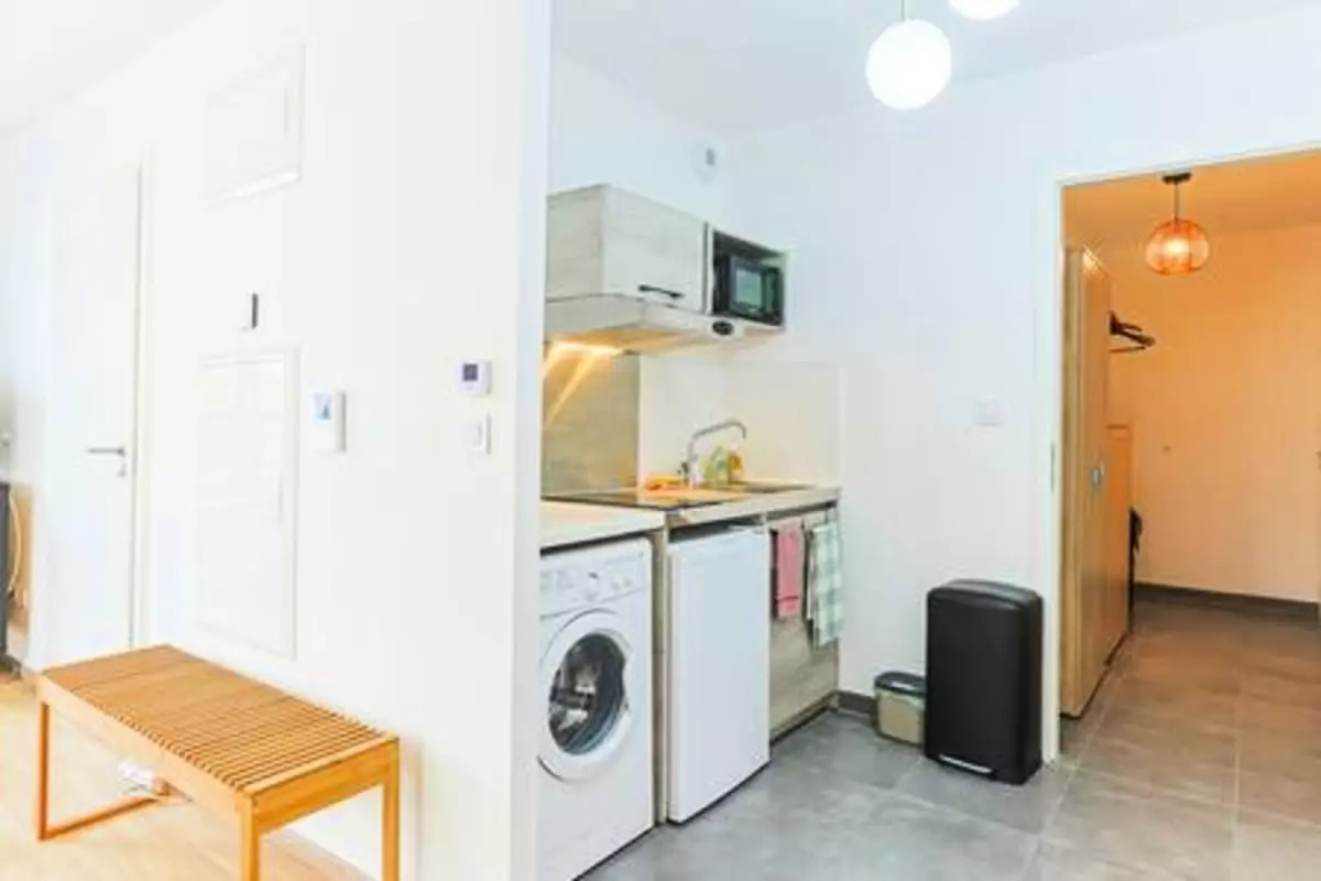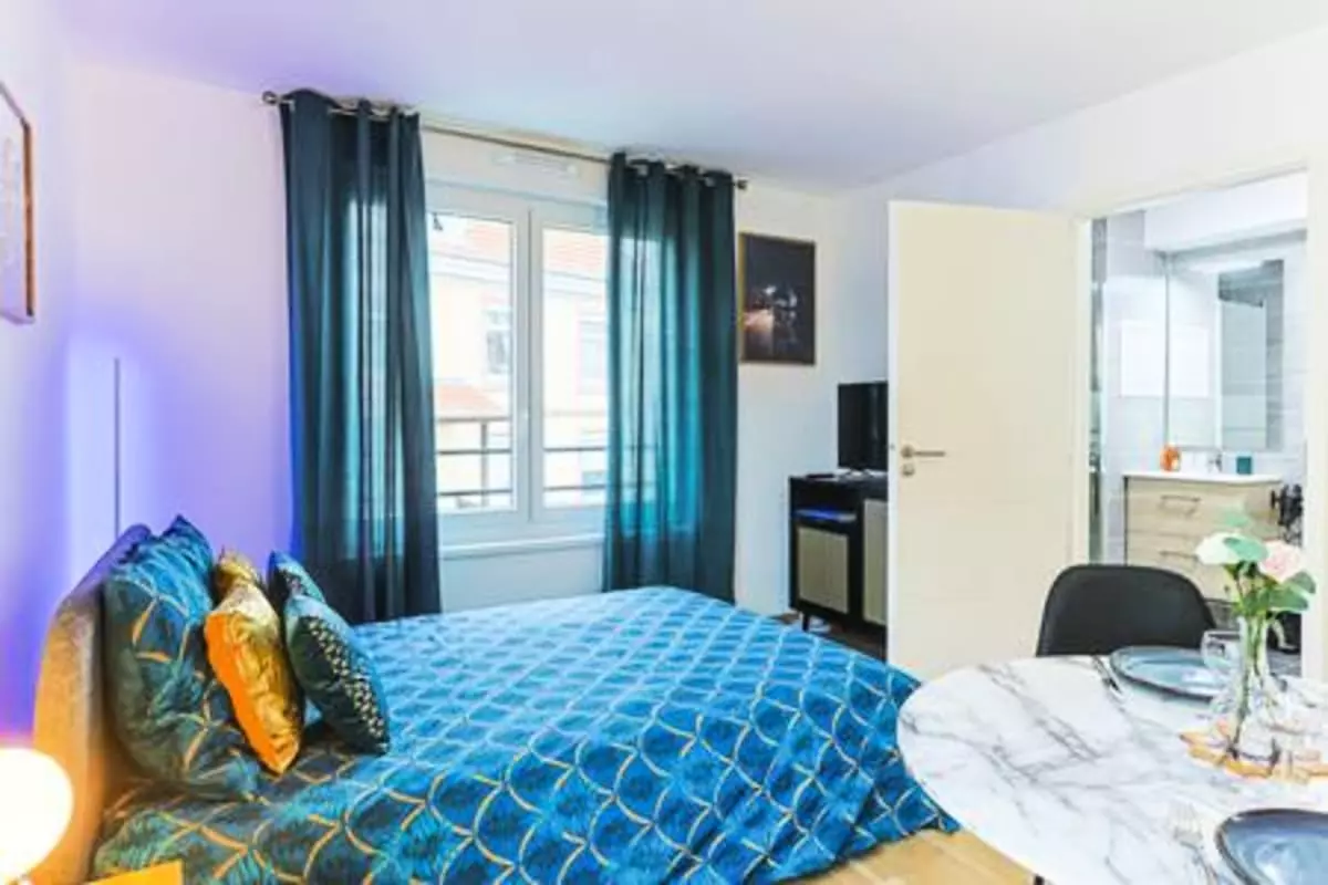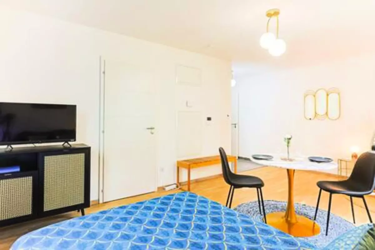 À peine entré dans la pièce principale, vous découvrez un espace lumineux et cosy. Les grandes fenêtres laissent entrer une lumière agréable, et le canapé confortable invite à la détente après vos visites. Une Smart TV 32 pouces est à votre disposition pour vos soirées cinéma ou moments de relaxation.