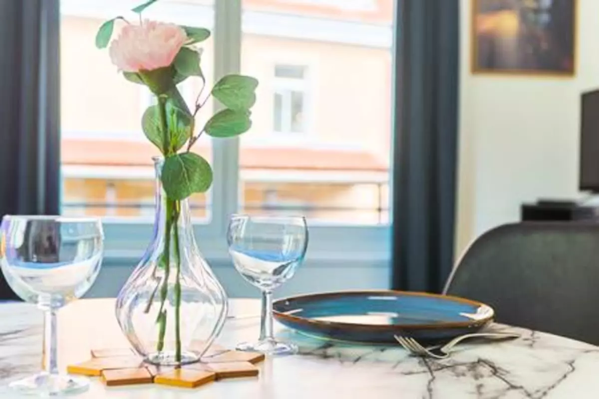Juste à côté, un espace repas vous attend avec table et chaises confortables, pour des petits-déjeuners ou des dîners conviviaux. Vaisselle et couverts sont à portée de main pour que vous vous sentiez comme chez vous.