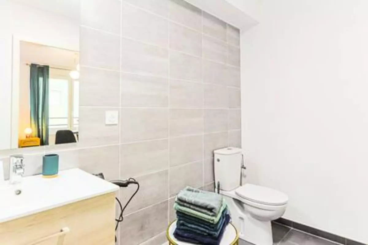 La salle d’eau moderne est pensée pour votre confort, avec une douche spacieuse, linge de toilette fourni et grand miroir. Vous pourrez vous détendre et vous préparer en toute facilité après une journée bien remplie.