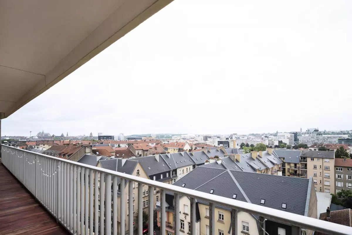 Appartement lumineux avec vue panoramique sur Metz, 2 chambres, balcon, parking privatif et accès direct au centre-ville.