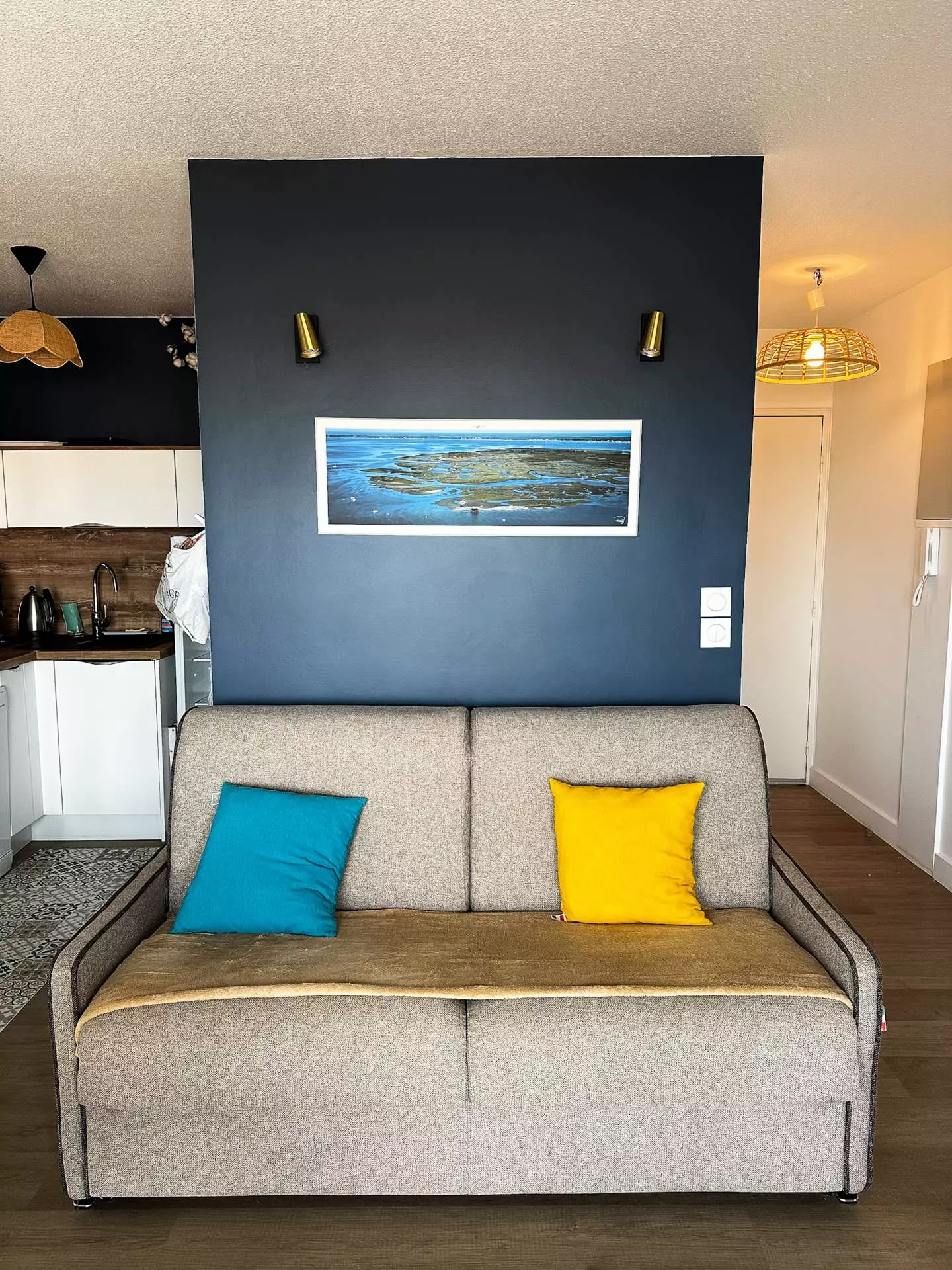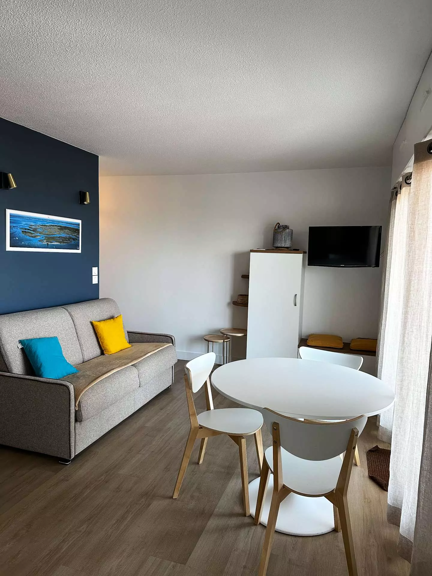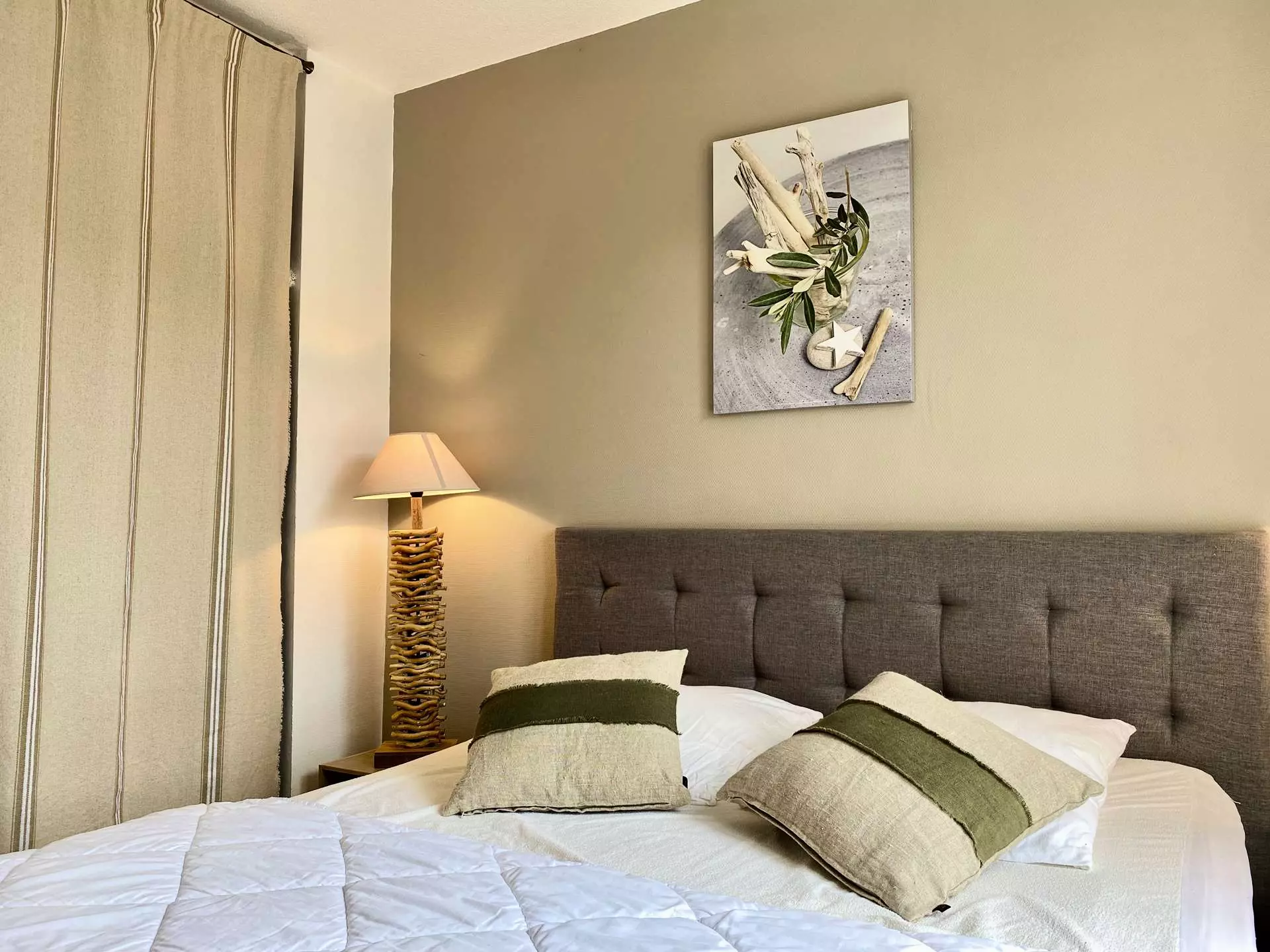 Cet appartement T2 est conçu pour accueillir jusqu'à 4 personnes dans un cadre fonctionnel et agréable. Il dispose d'une entrée menant à une cuisine entièrement équipée et séparée, idéale pour préparer vos repas en toute tranquillité. Le salon/salle à manger est lumineux et confortable, avec un canapé convertible pour une capacité d'accueil supplémentaire, ainsi qu'un coin repas pour vos moments conviviaux. La chambre, spacieuse et bien aménagée, est équipée d'un lit double de 160 cm et de rangements pratiques pour vos effets personnels. La salle de bain est moderne, et les WC sont indépendants, offrant davantage de confort.