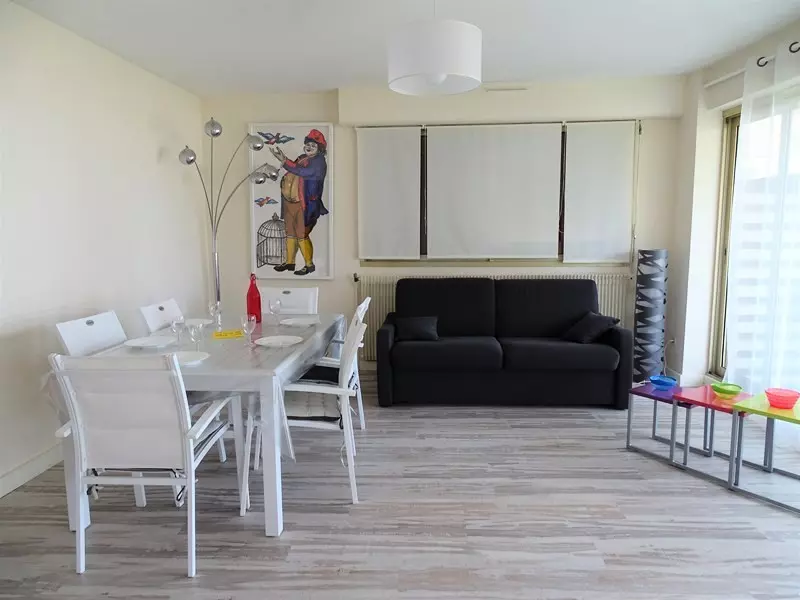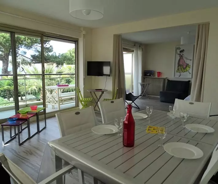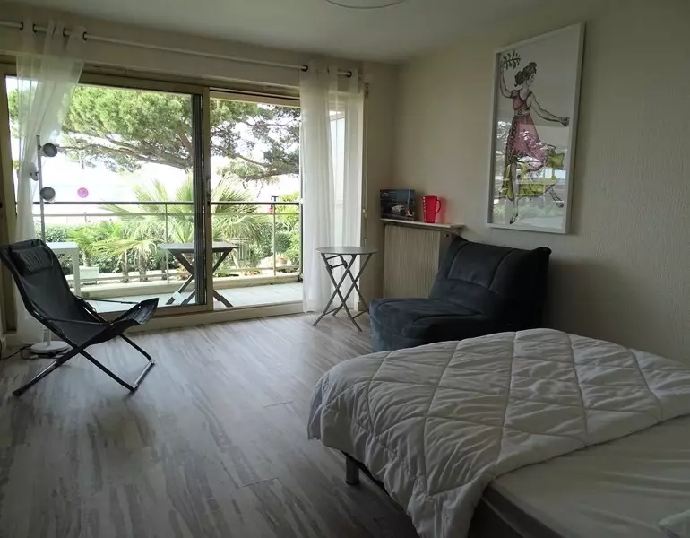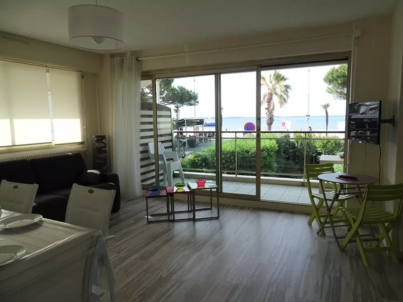 Cet appartement se compose d'une entrée avec placard qui mène à un séjour lumineux offrant une vue imprenable sur le bassin. Le séjour est aménagé avec un canapé-lit pour 2 personnes et une chauffeuse pour plus de confort. La chambre, séparée du séjour par un rideau occultant, dispose d'un lit double en 140 cm.