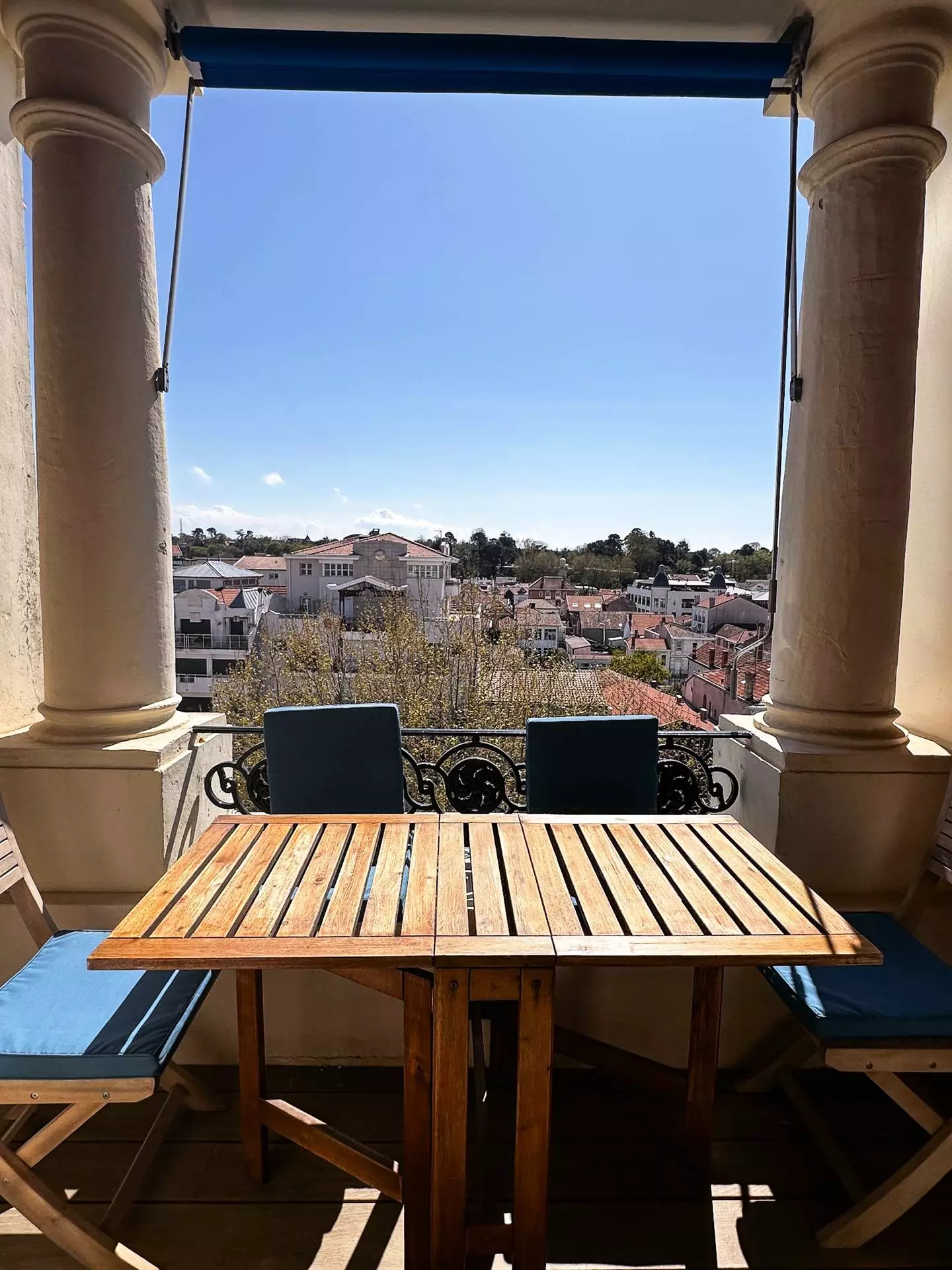 L'appartement offre un accès au balcon depuis la chambre et le salon (exposition sud). Le balcon, aménagé avec une table pliante, des chaises et deux stores bannes, permet de profiter du soleil.