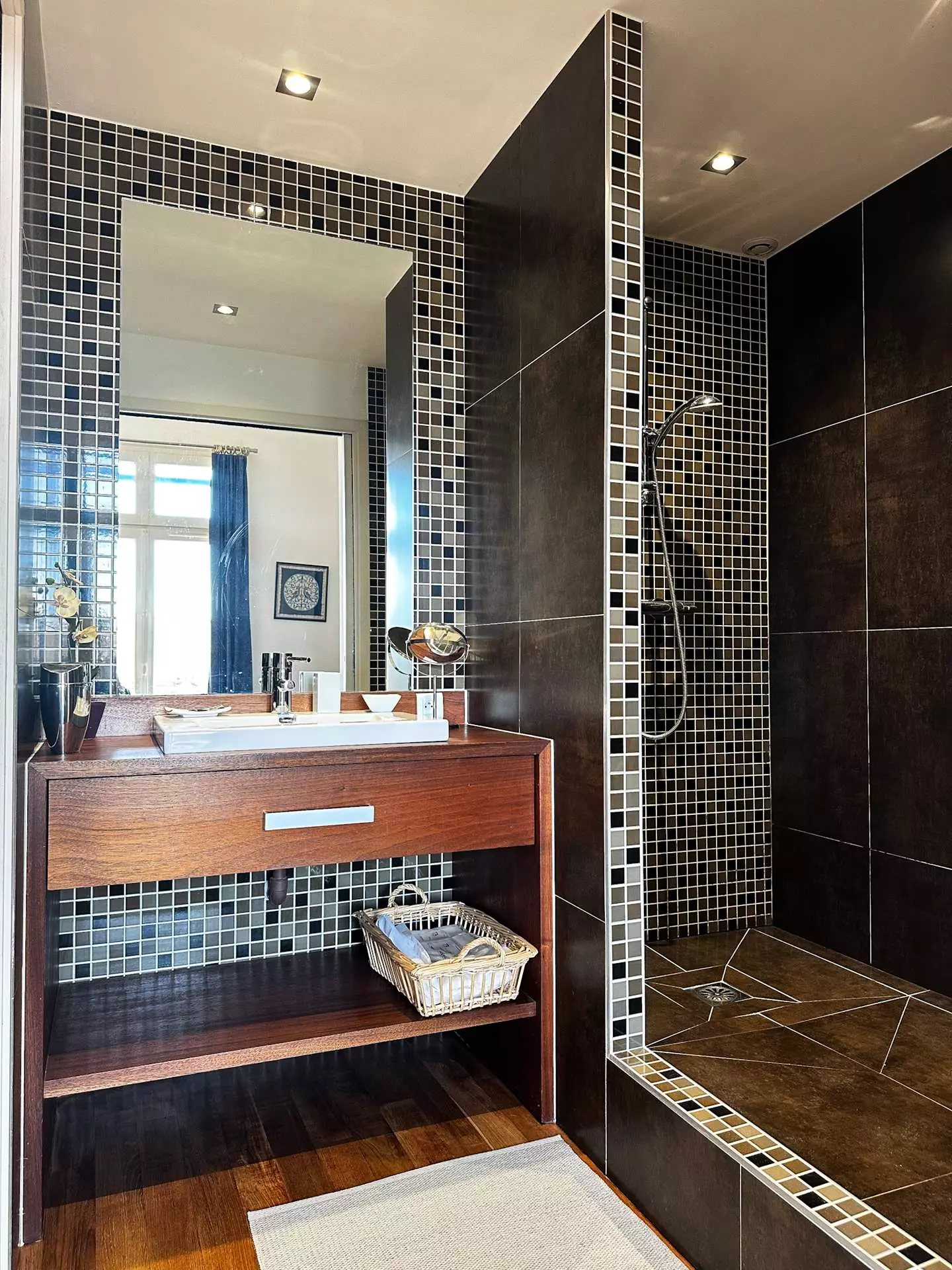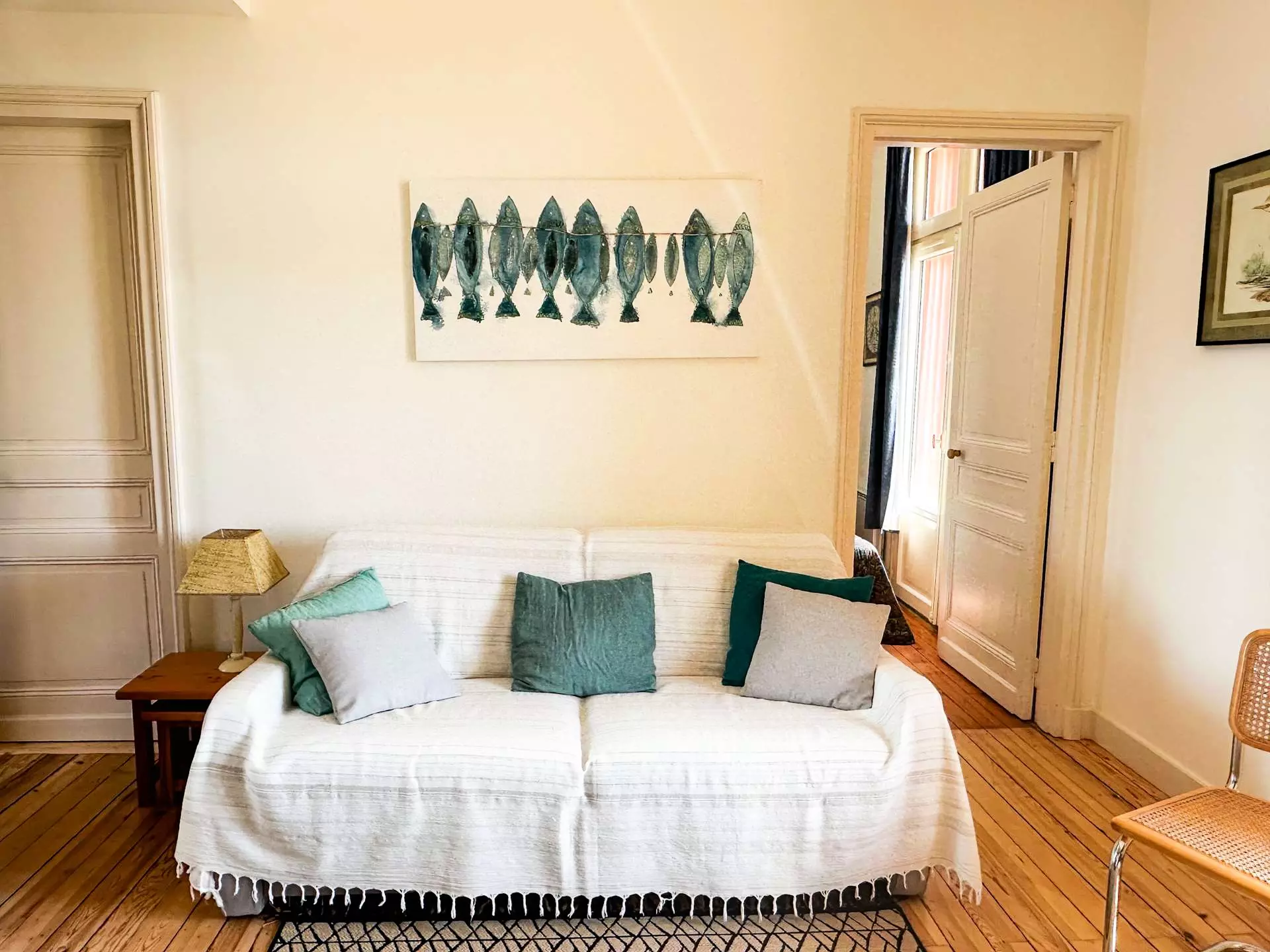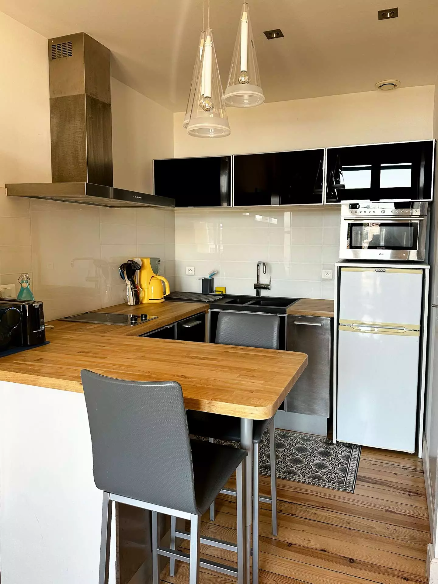 Avec son parquet authentique, cet appartement lumineux se compose d'une entrée avec placard, d'un séjour confortable avec canapé, table basse, télévision et accès Wi-Fi. La cuisine entièrement équipée, avec un comptoir, permet de prendre les repas à deux dans un espace convivial. La suite parentale, dotée de deux placards et de deux lits de 80 cm (à rapprocher ou séparer selon vos préférences), dispose également d'une belle salle d'eau avec douche à l'italienne et un grand meuble vasque. Les WC sont séparés.