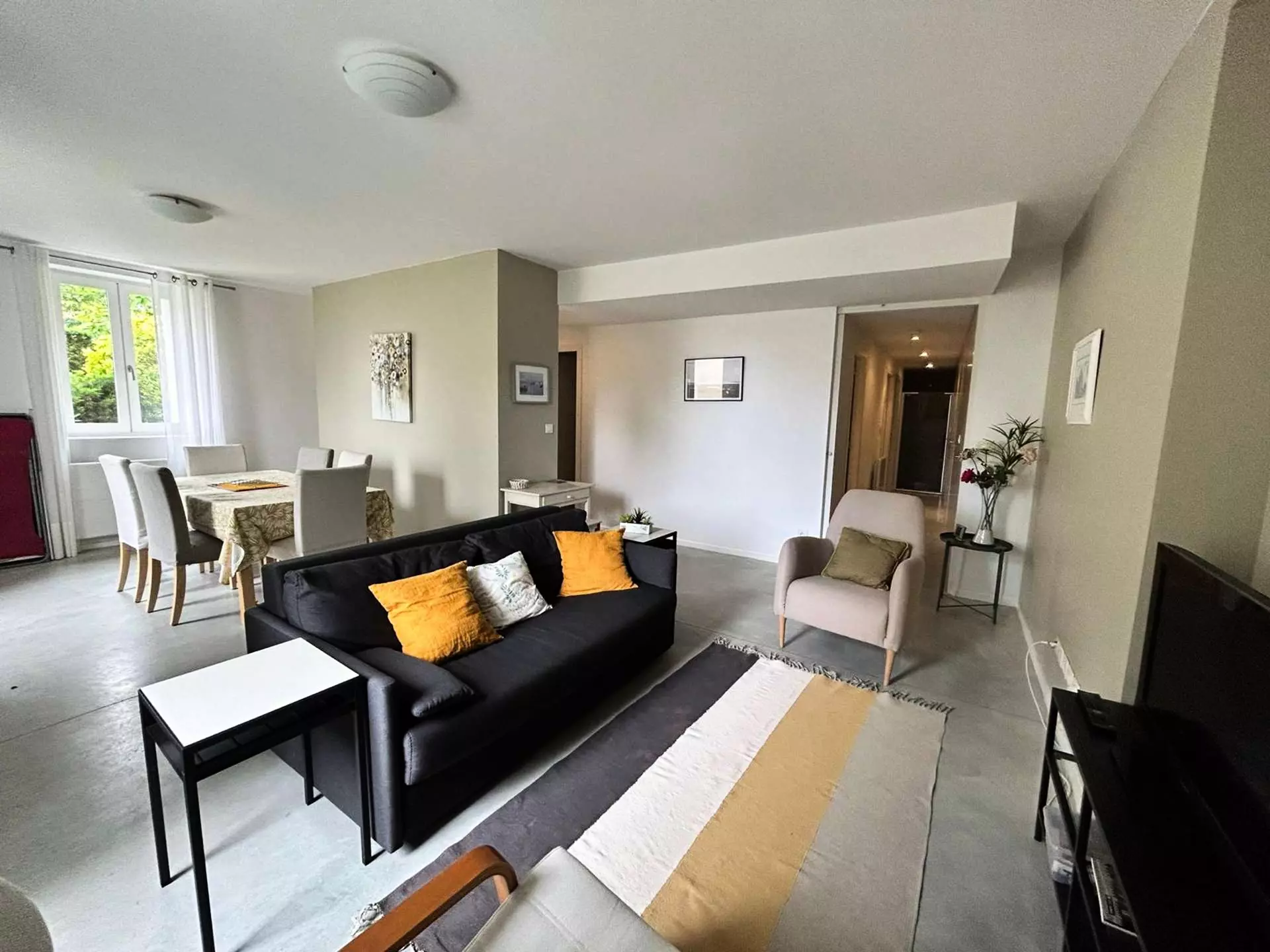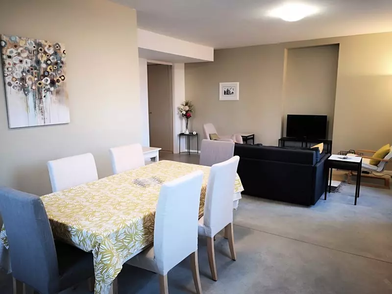 Cet appartement spacieux de 74 m² offre un cadre moderne et confortable pour un séjour agréable. Il se compose d'une belle pièce de vie avec une cuisine semi-ouverte entièrement équipée (réfrigérateur américain, lave-vaisselle, four encastré, plaques à induction 3 foyers, micro-ondes, machine à café traditionnelle et grille-pain). Un cellier abrite la machine à laver. La salle à manger dispose d'une table pour 6 personnes, et le salon, lumineux et accueillant, est équipé d'un canapé convertible de qualité (couchage 140 cm), de fauteuils et d'une télévision.