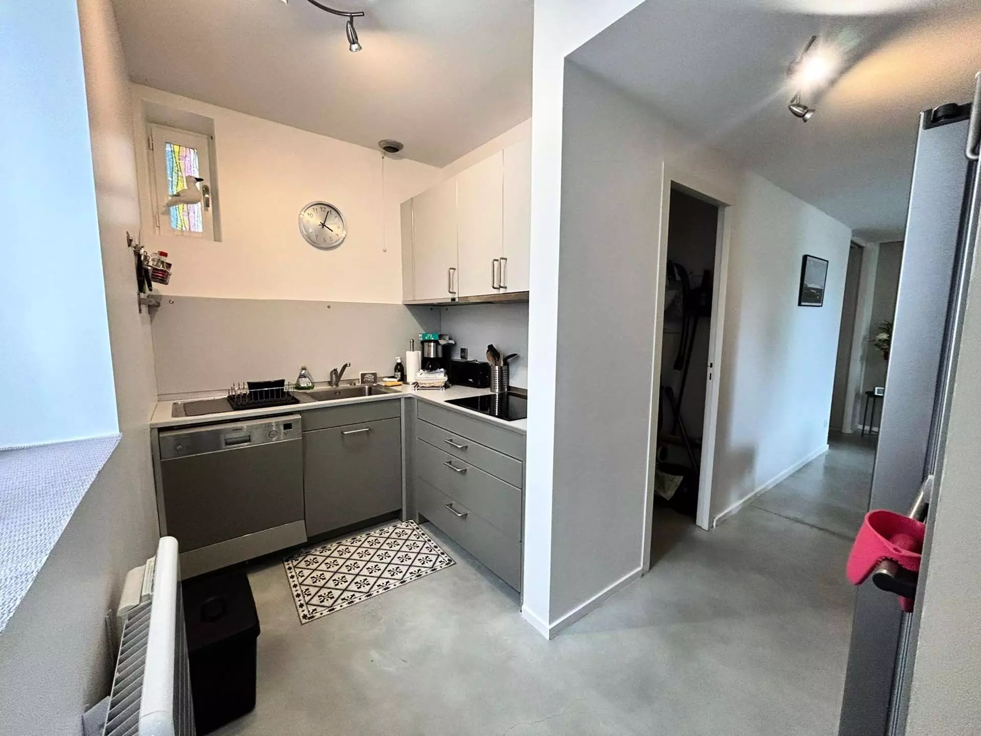 Un couloir mène à des placards spacieux avec penderie et étagères pour un rangement optimal. La salle de bain moderne comprend une baignoire, un plan vasque, un miroir et des rangements pratiques. La chambre 1 offre deux lits de 90 cm de qualité ainsi qu'une commode, tandis que la chambre 2 dispose d'un lit double de 140 cm, également de qualité, d'une commode et d'un lit bébé pliant à disposition. Une douche à l'italienne et des WC indépendants avec lavabo complètent l'espace.