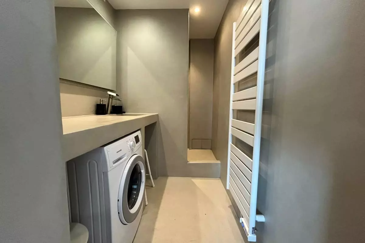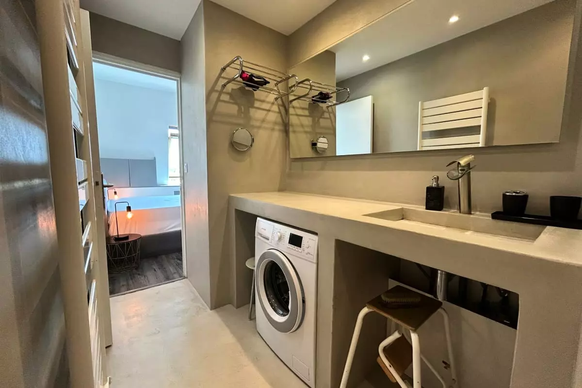 L’appartement dispose d’une chambre avec sa salle de douche privative, à la fois simple et raffinée, idéale pour se détendre après une journée à la plage.