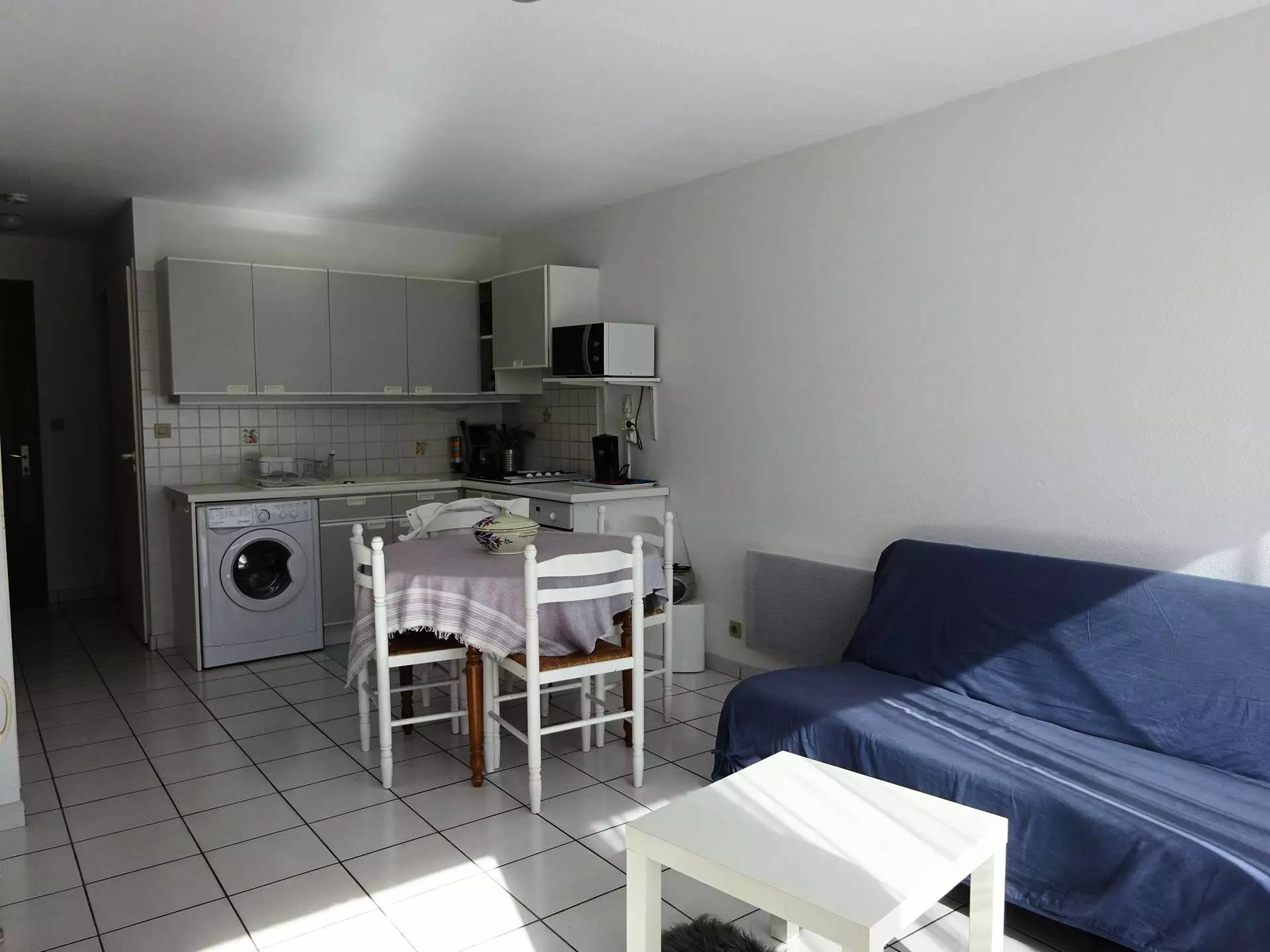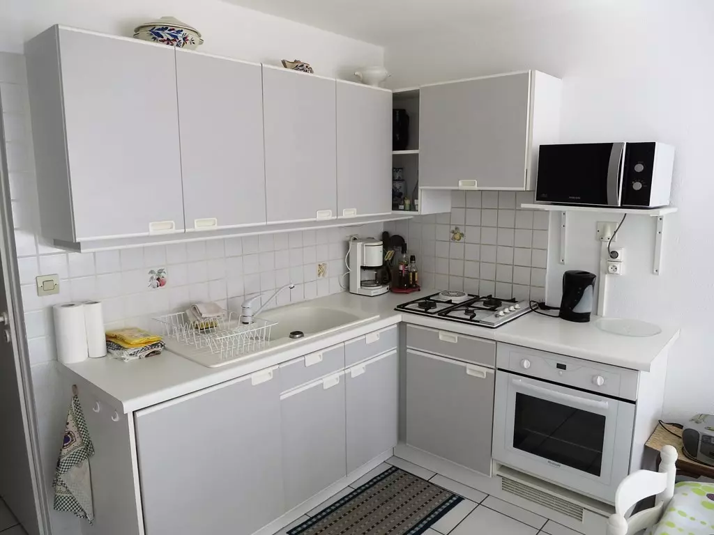 1 CUISINE OUVERTE : 3 feux gaz + 1 feu électrique, four, micro-onde, frigo congélateur, lave-linge, rangements, cafetière filtre, bouilloire