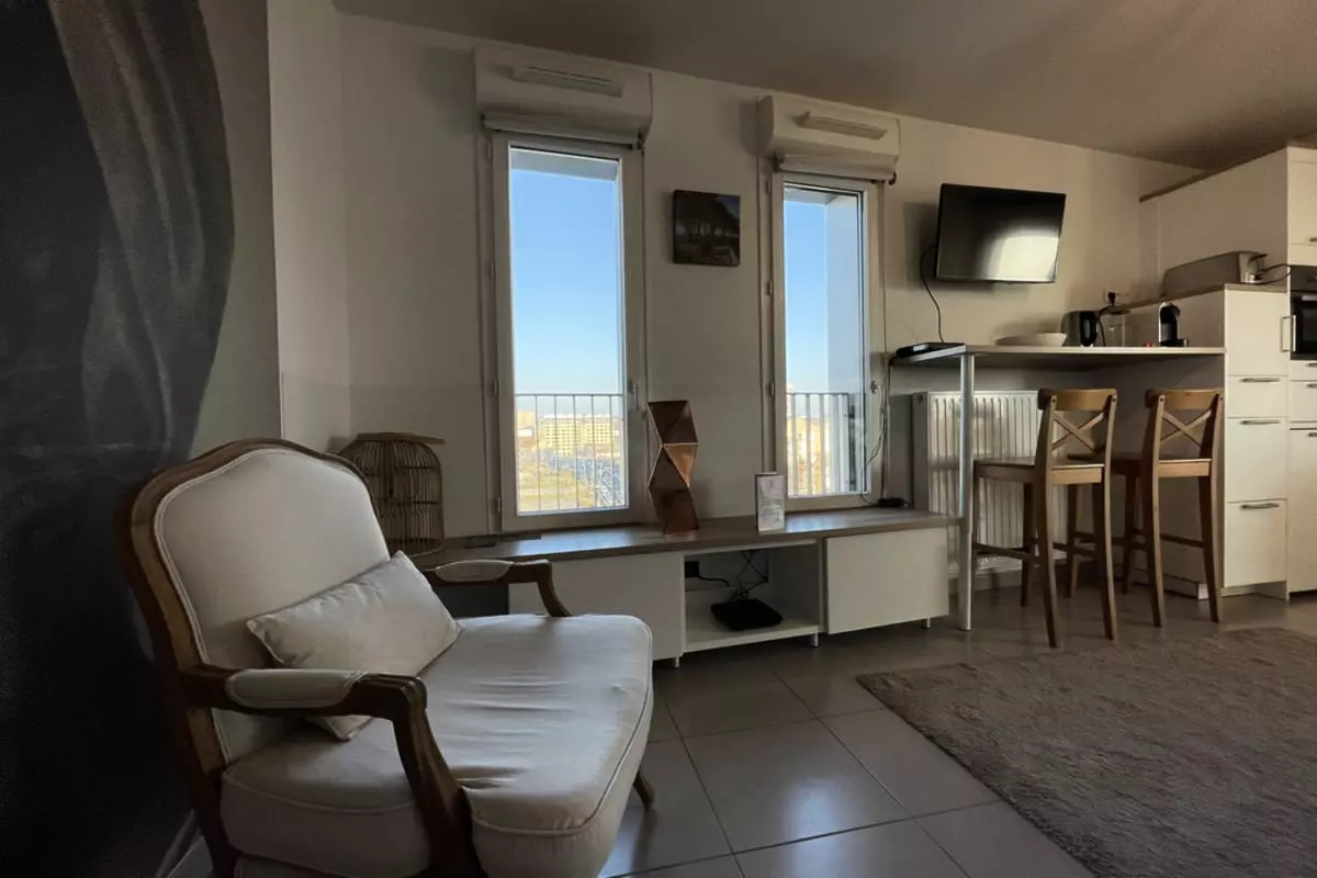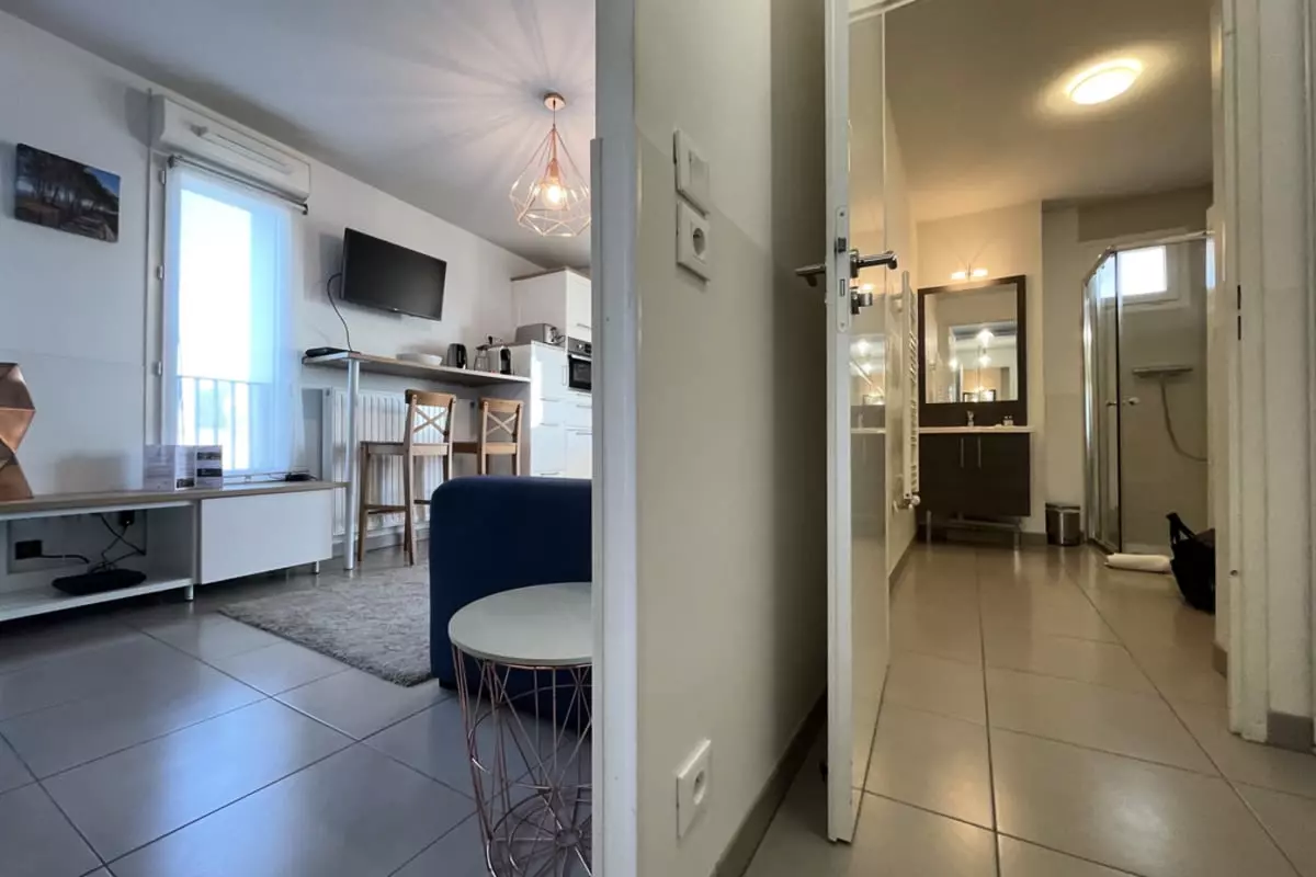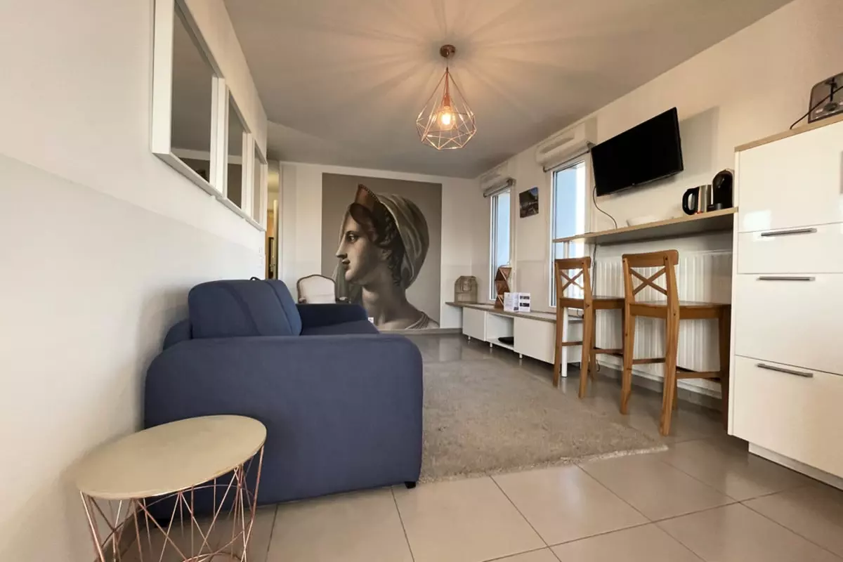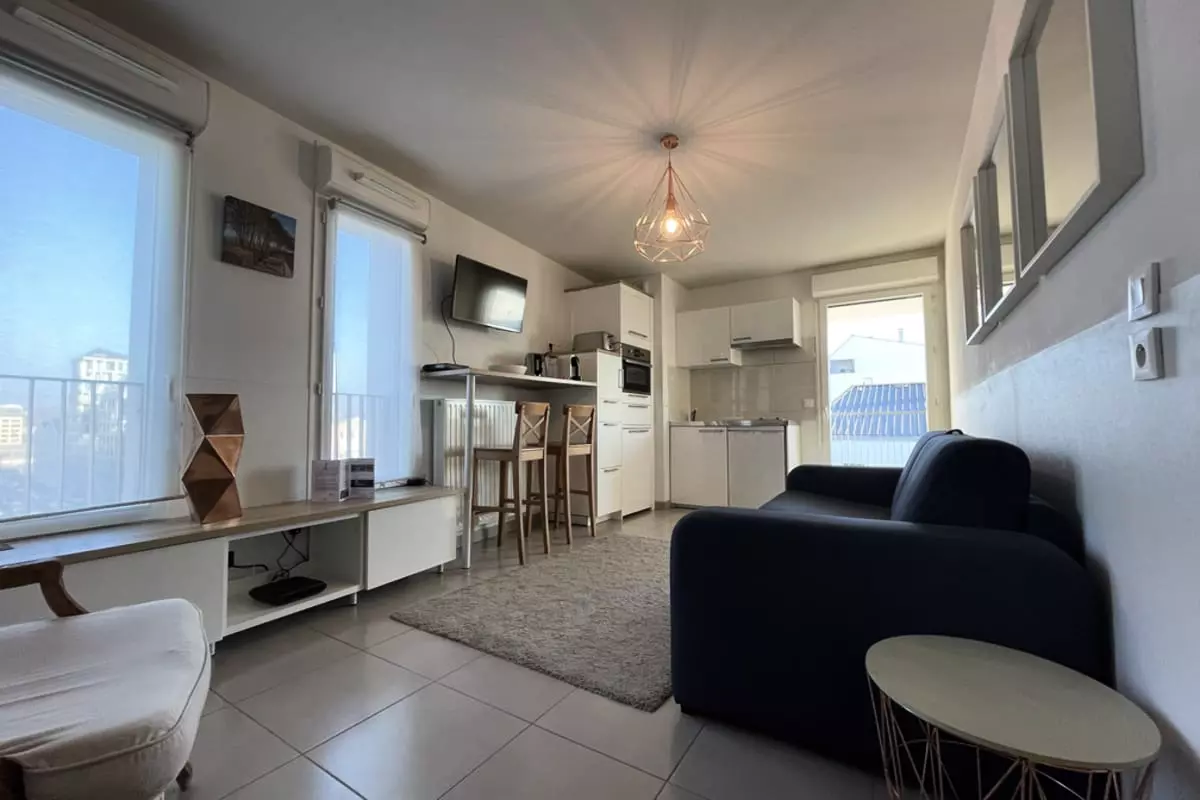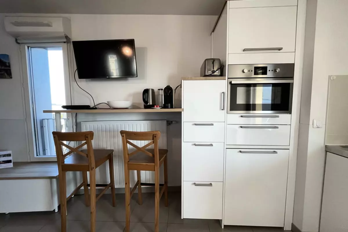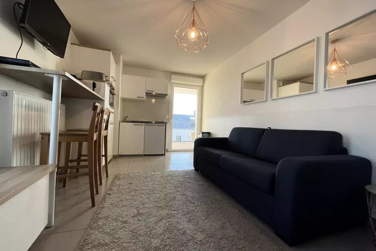 Ce studio moderne, avec son salon accueillant équipé d'un canapé-lit, d'une table basse et d'une TV, crée un espace chaleureux. La cuisine toute équipée ouvre sur le salon, permettant de préparer et de déguster des repas dans une ambiance conviviale. L’espace est optimisé pour offrir un confort maximal avec un espace de vie harmonieusement aménagé.