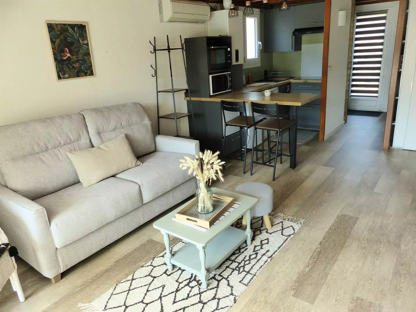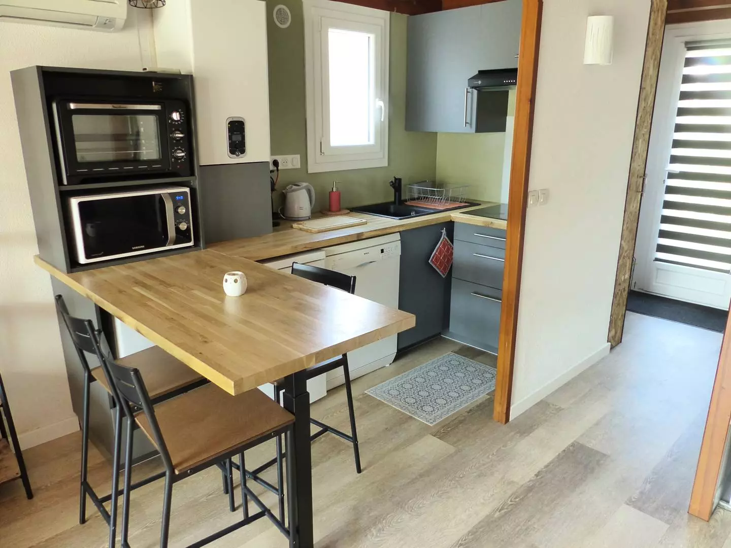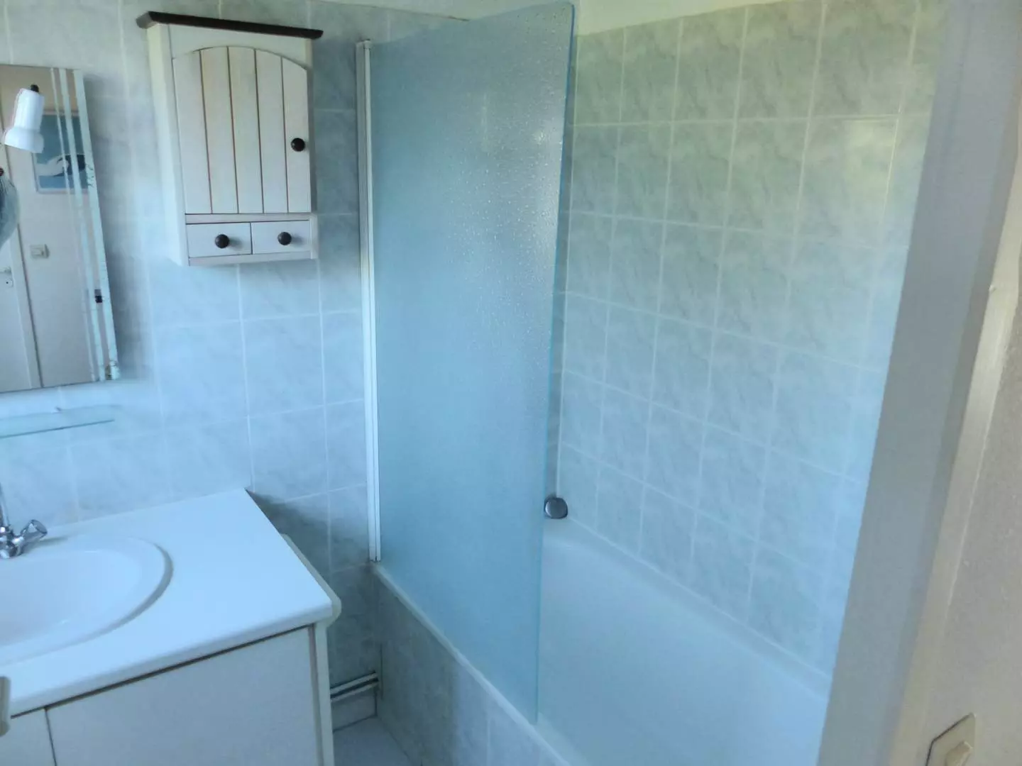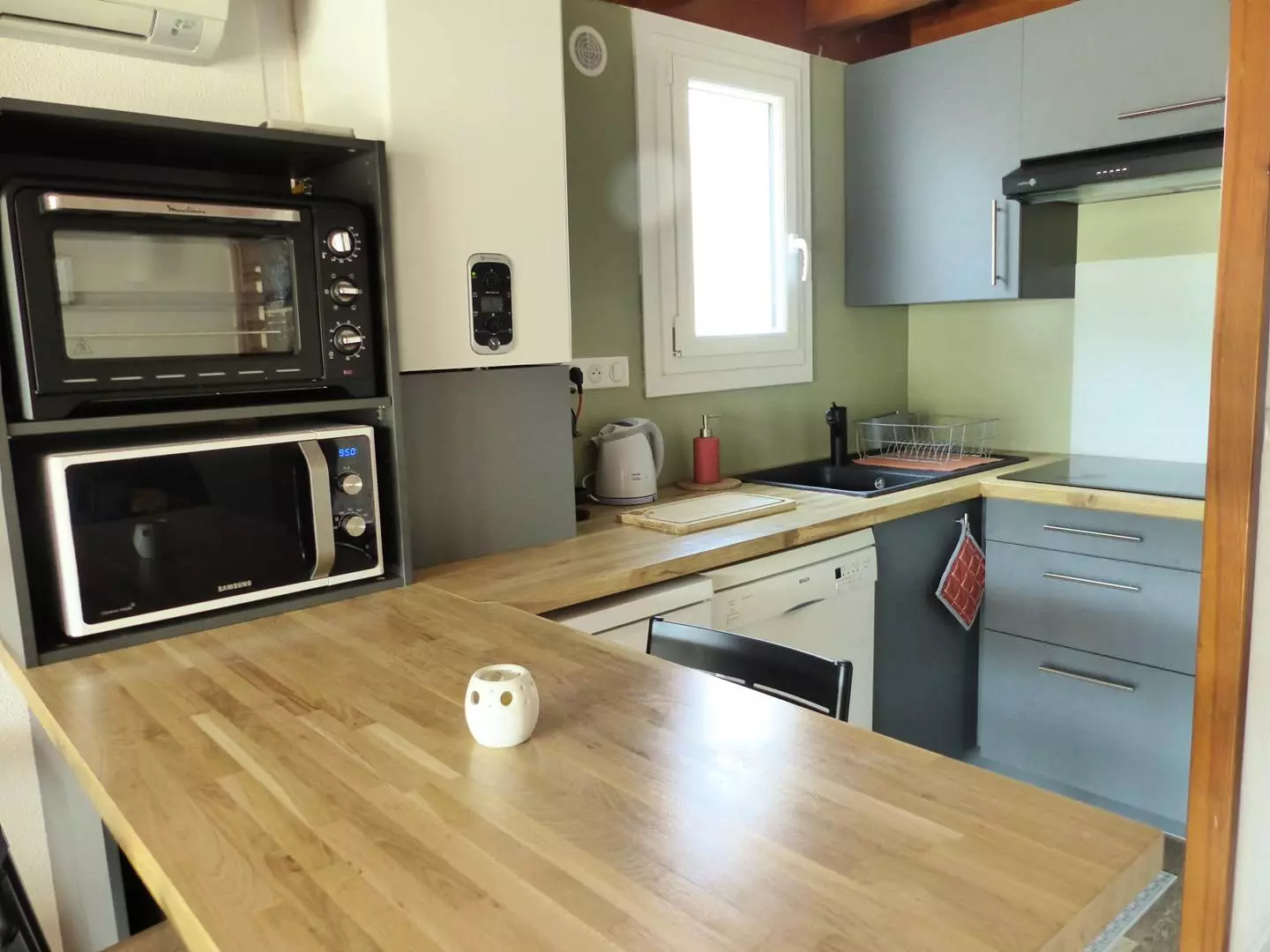 Coin cuisine: plaque induction, hotte, lave-vaisselle réfrigérateur top, mini congélateur, micro-ondes et four électrique. Salle de bains ( 2.17 x1.59) : baignoire, vasque et lave-linge. WC séparé