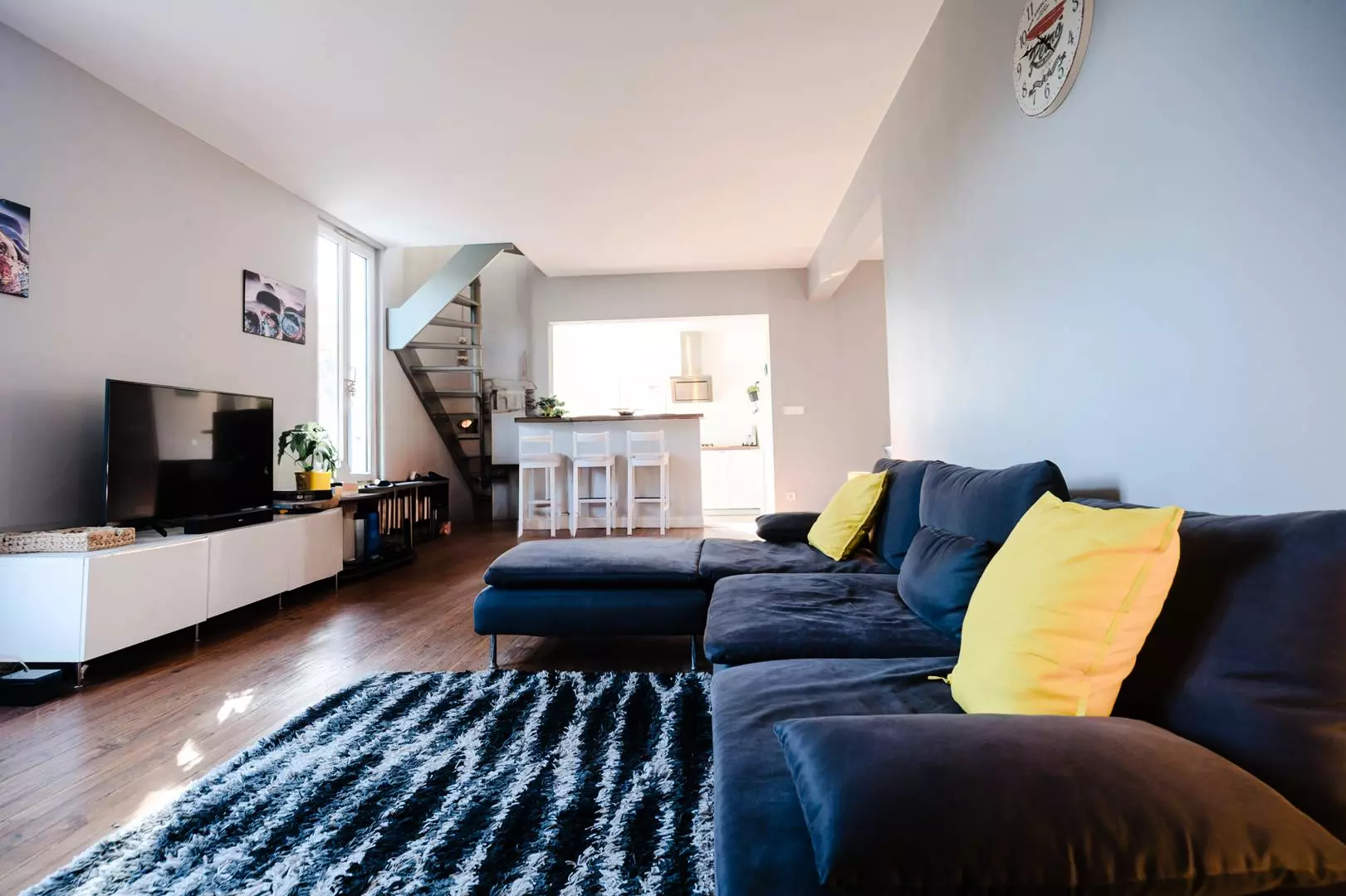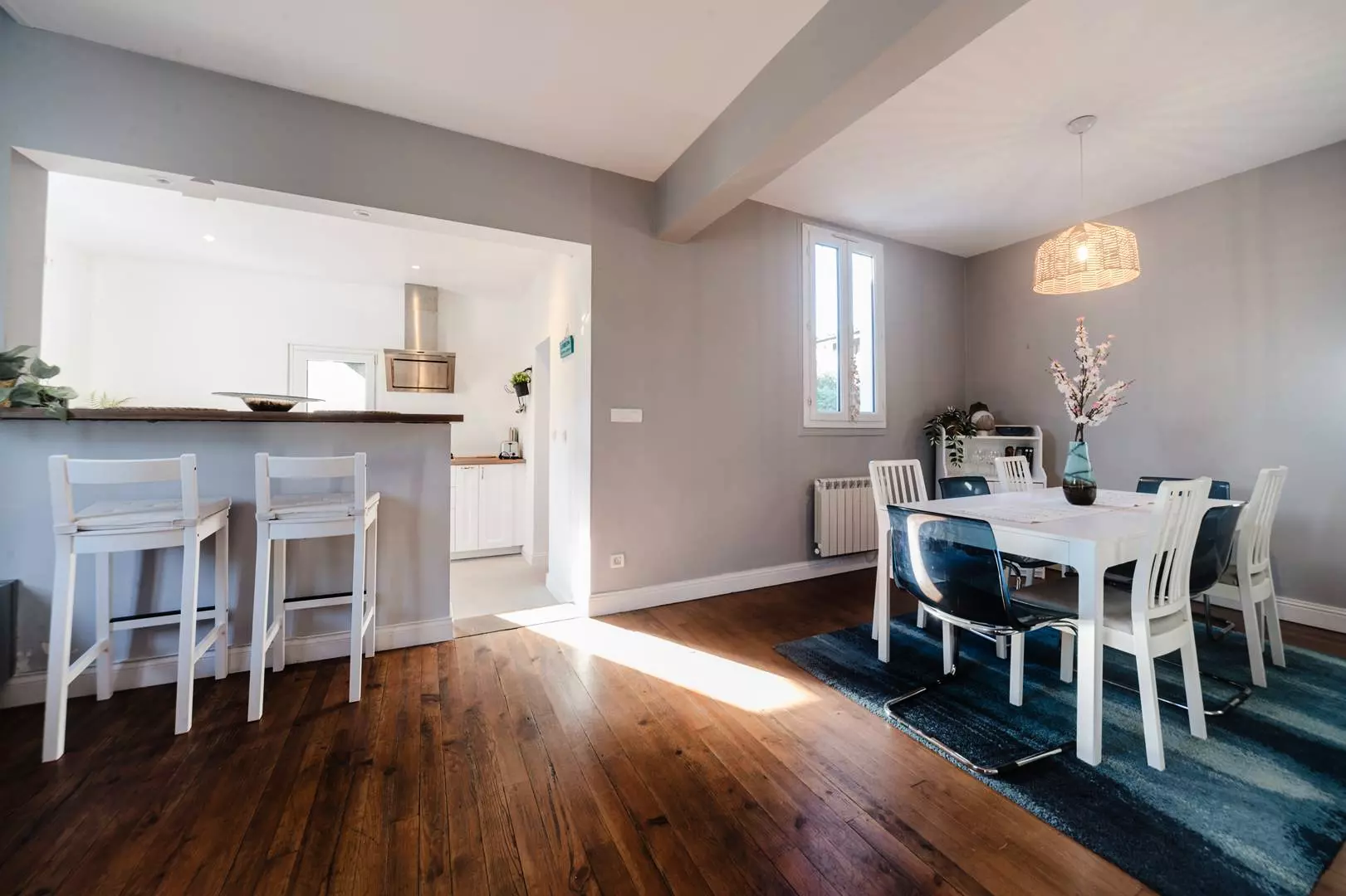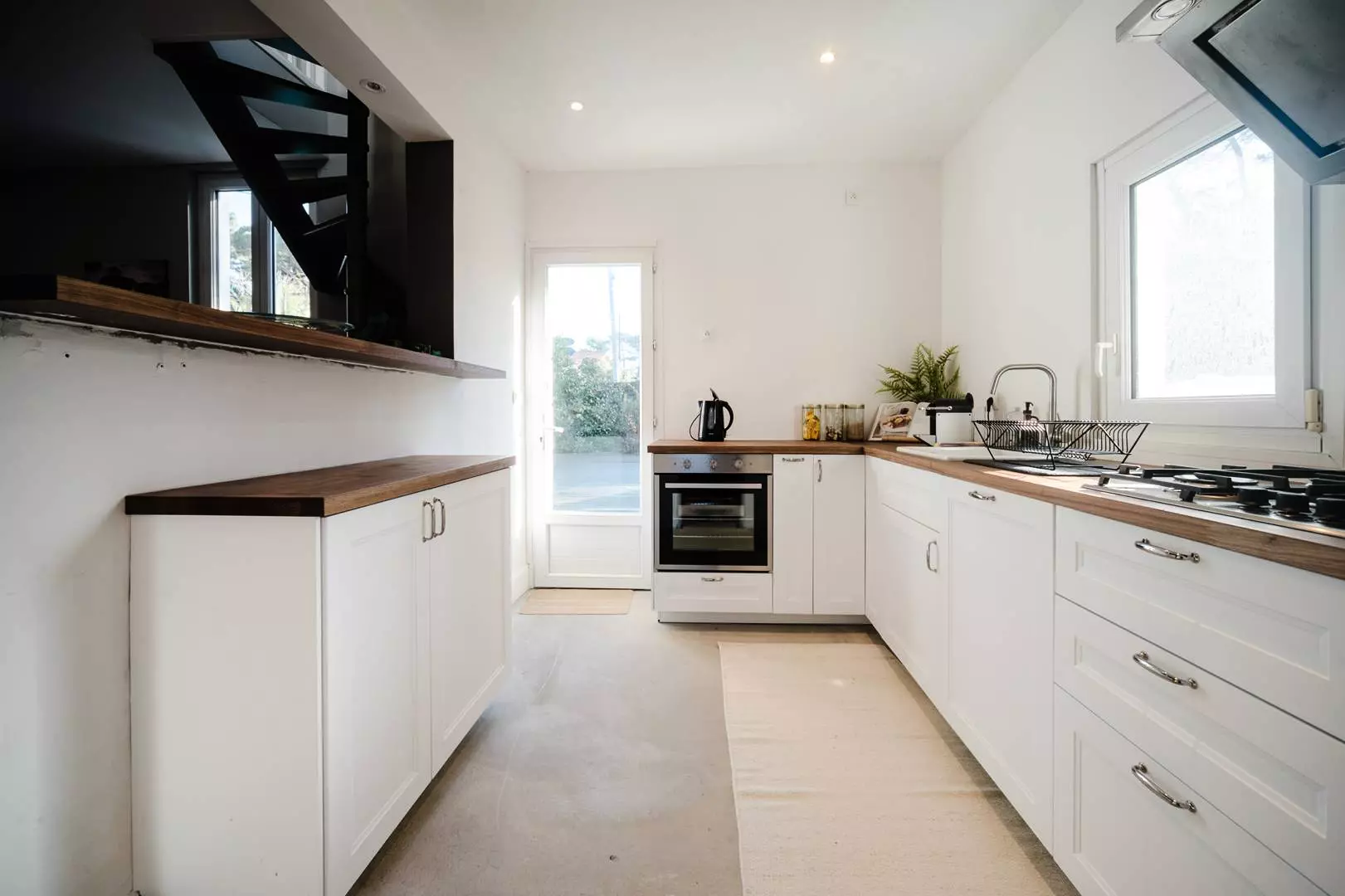 Au rez-de-chaussée, la villa propose un salon/salle à manger en L d'environ 40 m², ouvrant directement sur la terrasse et l'espace piscine. La cuisine ouverte, fonctionnelle, est équipée d'une plaque gaz quatre feux, d'un four électrique, d'un réfrigérateur-congélateur, d'un lave-vaisselle et d'un lave-linge.