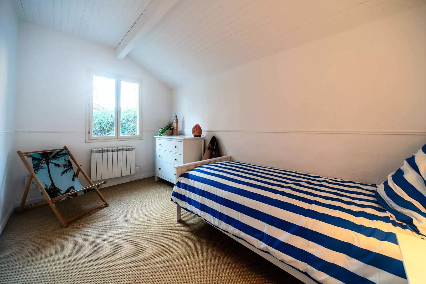 L'étage, accessible par un petit escalier en colimaçon, dessert un sas ouvrant sur une terrasse avec accès indépendant. Il comprend une chambre avec deux lits simples, une petite salle de douche avec lavabo et WC, ainsi qu'une chambre avec un lit double en 160.