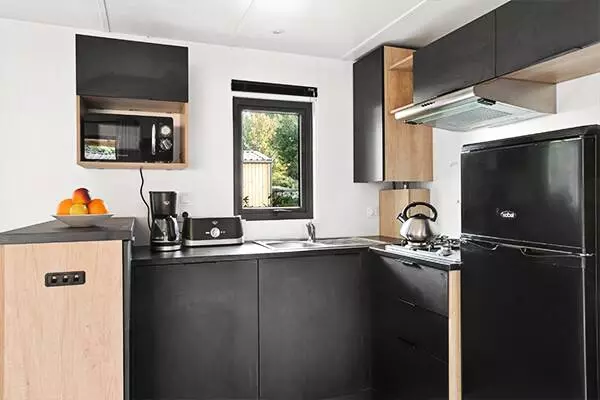 Séjour / coin cuisine : Banquette, Bouilloire, Cafetière électrique (filtre), Cuisine équipée, Evier, Lave-vaisselle, Micro-ondes, Plaque de cuisson 4 feux gaz, Réfrigérateur avec freezer, Table et chaises