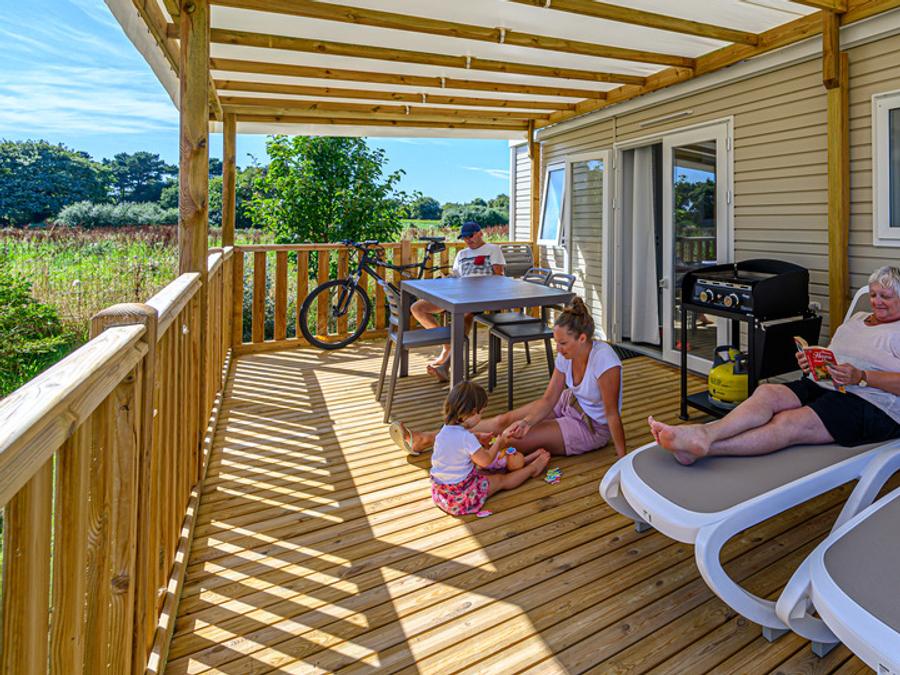 - Réservez le Homeflower Premium de 32 m² pour un séjour en Bretagne au camping Kerleyou à Douarnenez ! Avec trois chambres, une grande terrasse couverte de 21 m², la climatisation, et une télévision, cet hébergement offre tout le confort nécessaire pour une escapade en famille ou entre amis. Idéal pour jusqu'à 6 personnes, ce mobil-home est conçu pour des vacances en plein air, avec draps et serviettes inclus pour un séjour sans souci. Profitez de l'air marin et détendez-vous à proximité des plages bretonnes et des sentiers côtiers de Douarnenez pour des vacances inoubliables