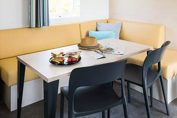 Séjour / coin cuisine : Banquette, Bouilloire, Cafetière électrique (filtre), Cuisine équipée, Evier, Micro-ondes, Plaques de cuisson 4 feux électriques ou gaz, Réfrigérateur avec freezer, Table et chaises