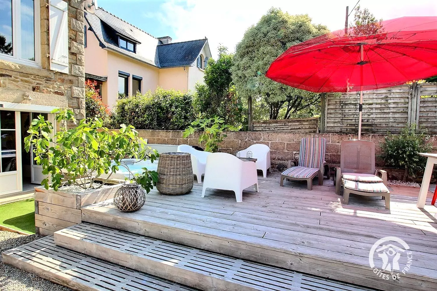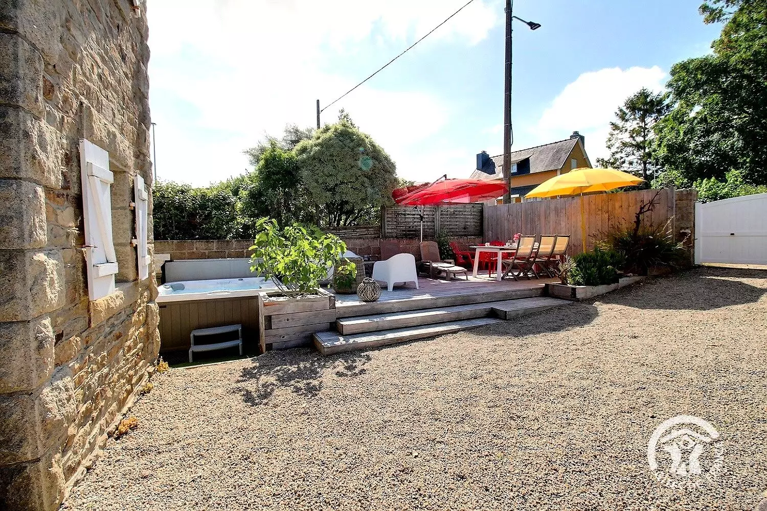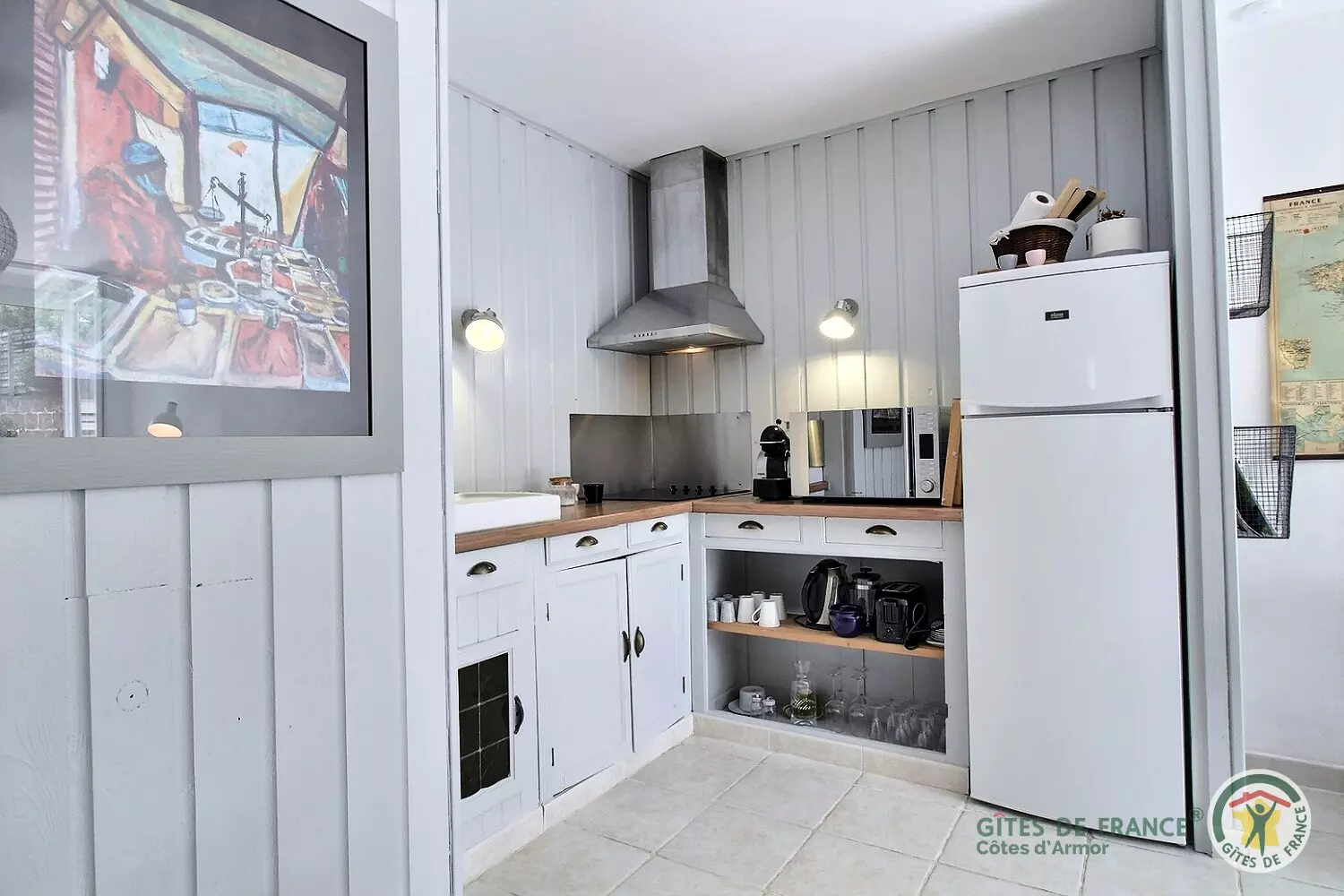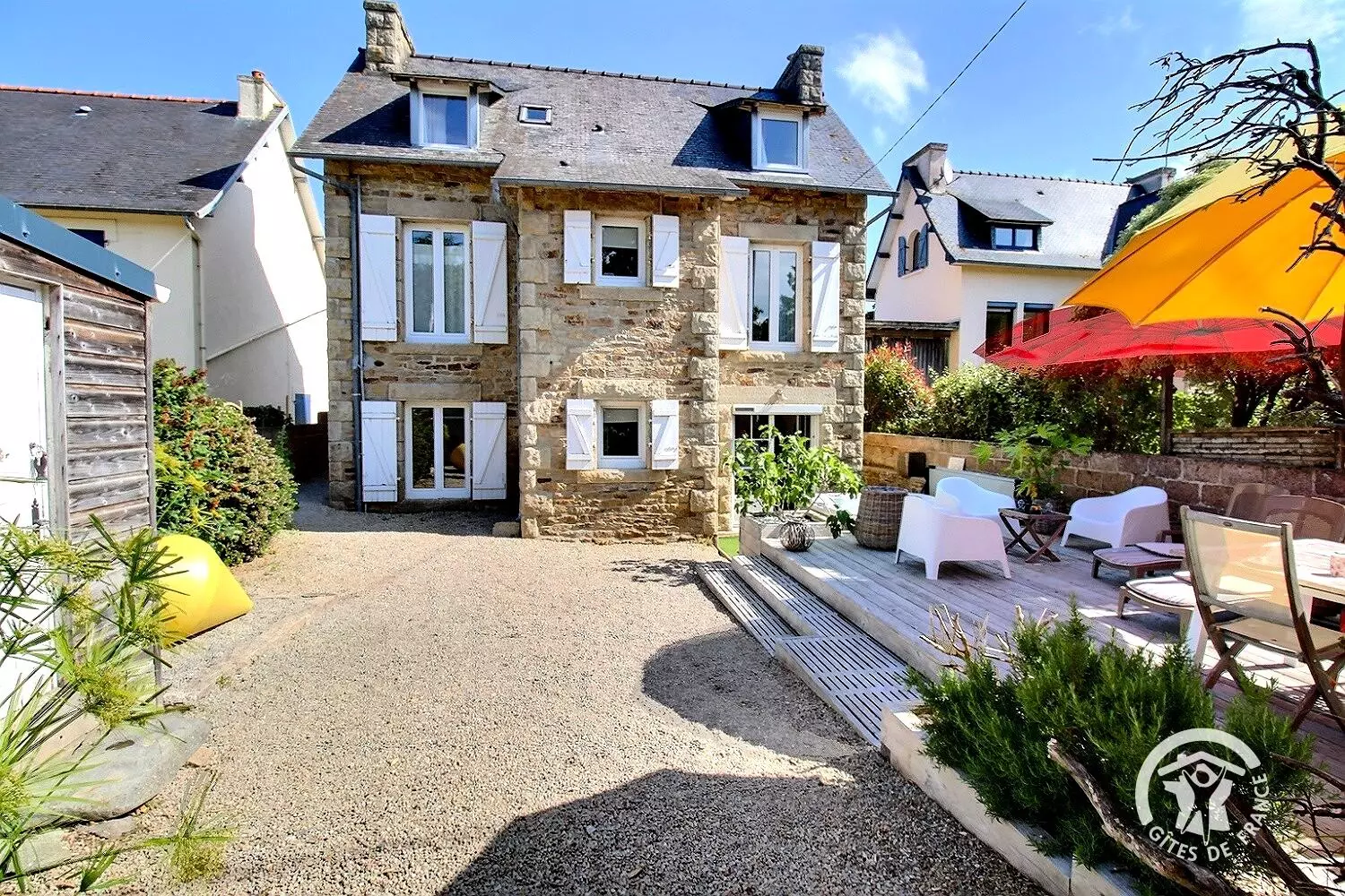 Cour gravillonnée pouvant accueillir 2 voitures. Possibilité de stationner dans la rue et sur un petit parking public juste à côté. Lave-linge dans cellier extérieur. En baie de Lannion, dans la station de Plestin Les Grèves, en bordure de la D786 conduisant à Lannion (15km) et Morlaix (23 km), la Villa la Lieue de Grève sera l'adresse rêvée pour des vacances à la mer : vous n'aurez que la route à traverser et à vous les plaisirs de la plage... Si vous souhaitez des vacances toniques et sportives, vous pourrez vous rendre au centre nautique juste en face de la maison. Mais ce que vous apprécierez avant tout, c'est de vous retrouver dans un intérieur chaleureux où se conjuguent subtilement parquets anciens et décoration tendance. Le plus de cette villa ? ses grands volumes, ses 2 séjours salon permettant si besoin de s'isoler, la grande terrasse exposée plein sud. A 3.5 km du centre de Plestin les Grèves (tous commerces).