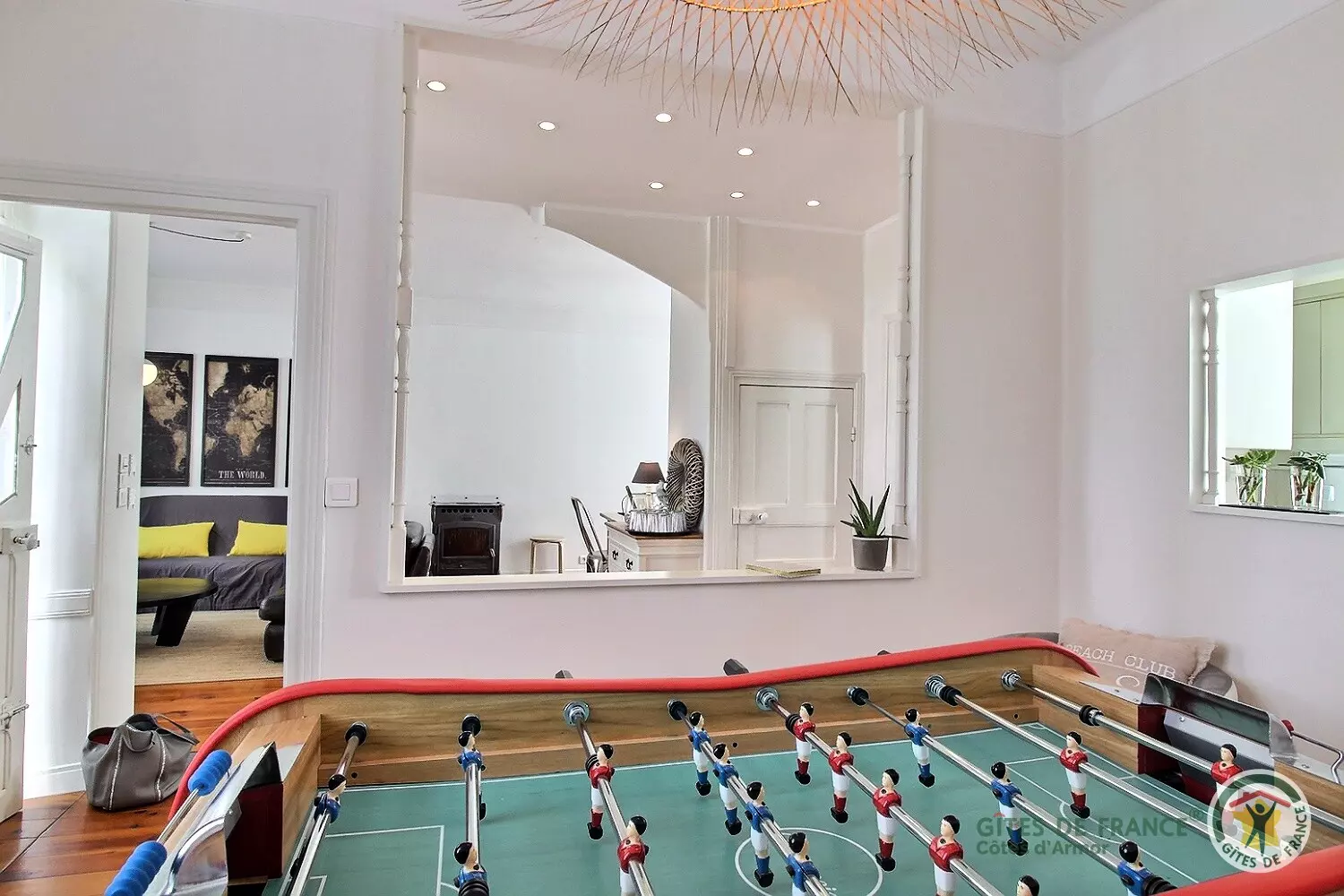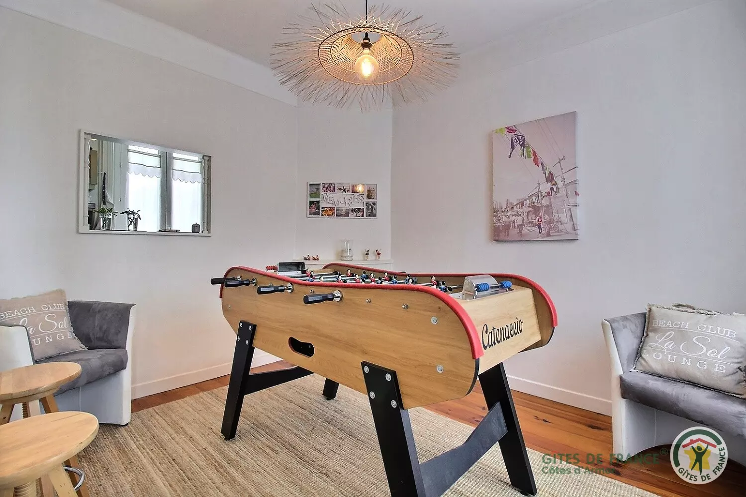 - hall d'entrée, grand séjour-salon, espace foot sur table, cuisine aménagée, petite salle d'eau (douche et wc)