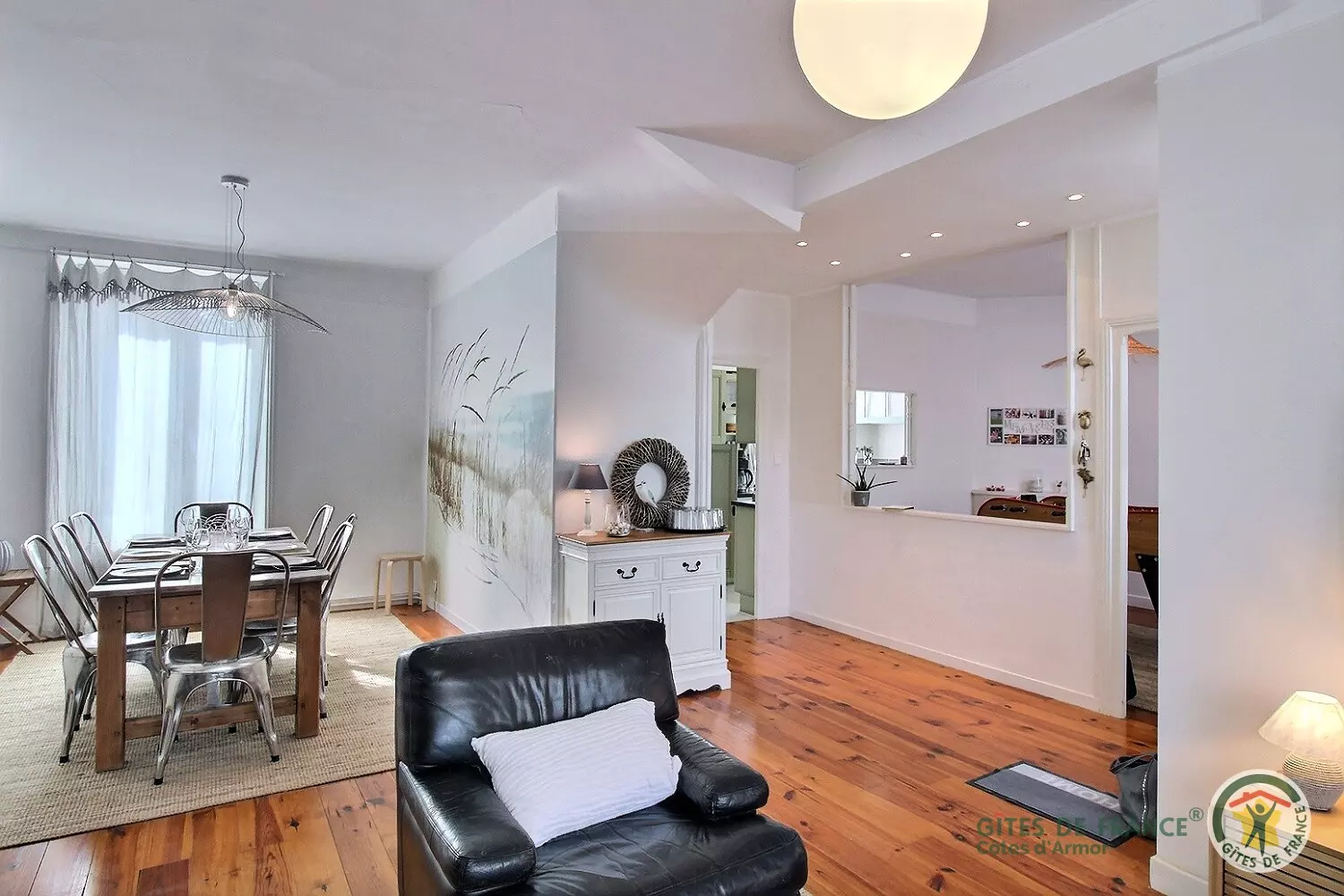 En baie de Lannion, dans la station de Plestin Les Grèves, en bordure de la D786 conduisant à Lannion (15km) et Morlaix (23 km), la Villa la Lieue de Grève sera l'adresse rêvée pour des vacances à la mer : vous n'aurez que la route à traverser et à vous les plaisirs de la plage... Si vous souhaitez des vacances toniques et sportives, vous pourrez vous rendre au centre nautique juste en face de la maison. Mais ce que vous apprécierez avant tout, c'est de vous retrouver dans un intérieur chaleureux où se conjuguent subtilement parquets anciens et décoration tendance. Le plus de cette villa ? ses grands volumes, ses 2 séjours salon permettant si besoin de s'isoler, la grande terrasse exposée plein sud. A 3.5 km du centre de Plestin les Grèves (tous commerces).