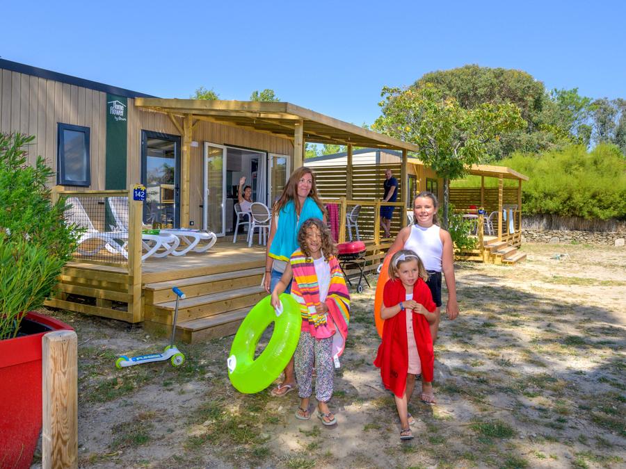 Mobilhome 6 personnes - Homeflower Premium 35m² (3 chambres) + CLIM + terrasse semi-couverte + TV + draps + serviettes 6 pers.