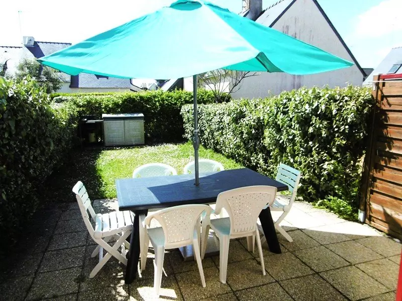 - Un petit jardin clos avec une terrasse équipée d'un salon de jardin, parasol et barbecue