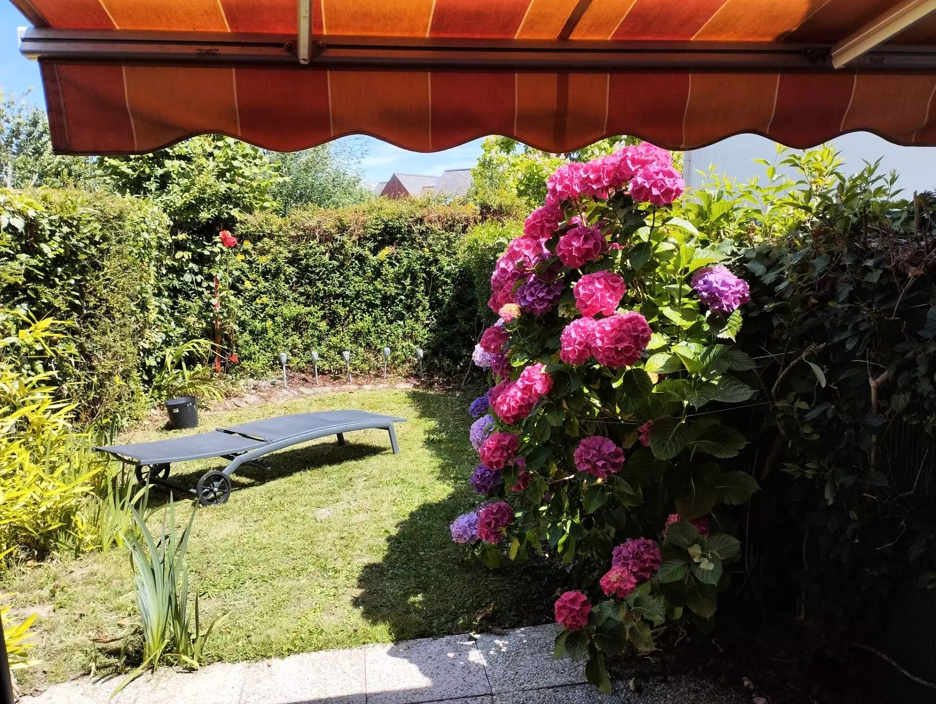- Un petit jardin clos avec une terrasse équipée d'un salon de jardin, d'un barbecue au charbon et d'un store manuel.