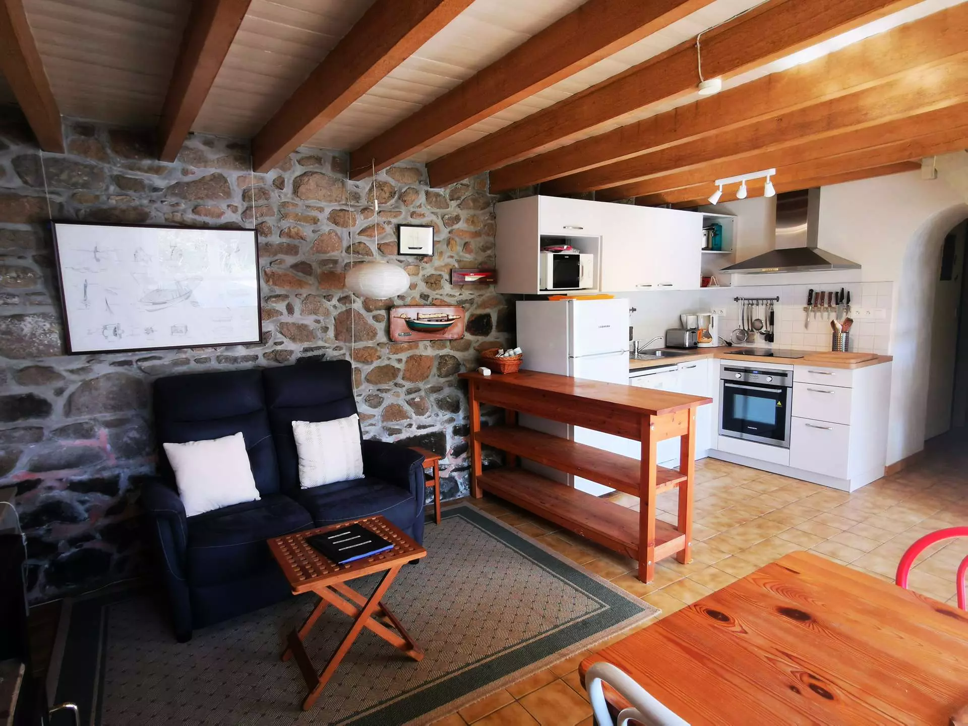 Run Rouz maison de pêcheur classée 2 ** pour 2 personnes à Trégastel. 32 m², intérieur typique, entrée sur séjour, poêle à bois, cuisine et espace repas, salle d'eau avec douche, WC séparé. Chambre à l'étage, accès par un petit escalier droit. Grand terrain privatif clos de haies et de talus sans portail, parking privé. Animaux acceptés sans supplément. Ménage final inclus. Linge de maison en option.