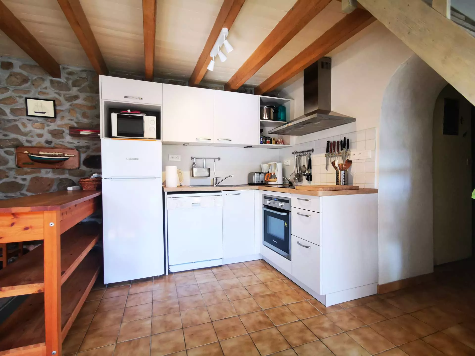 Table de cuisson, four électrique, four micro-onde, réfrigérateur, cafetière, bouilloire, grille-pain, lave-vaisselle et lave-linge. Fauteuils, poêle à bois, téléviseur, box Internet Wifi, lave-linge, fer et table à repasser. Douche, radiateur sèche-serviettes. Lit double (2 matelas 90X200), oreillers et couette. Jardin, salon de jardin, barbecue, parasol et chaises longues.