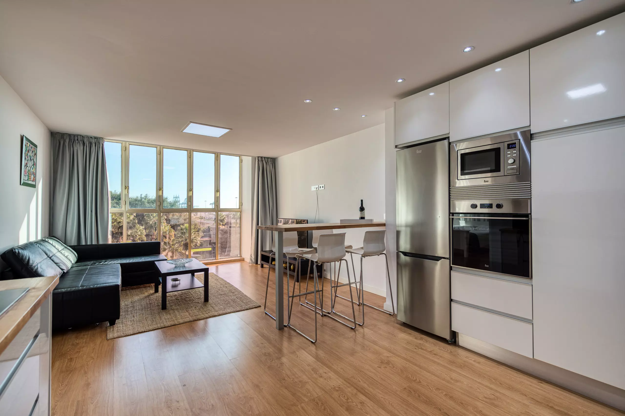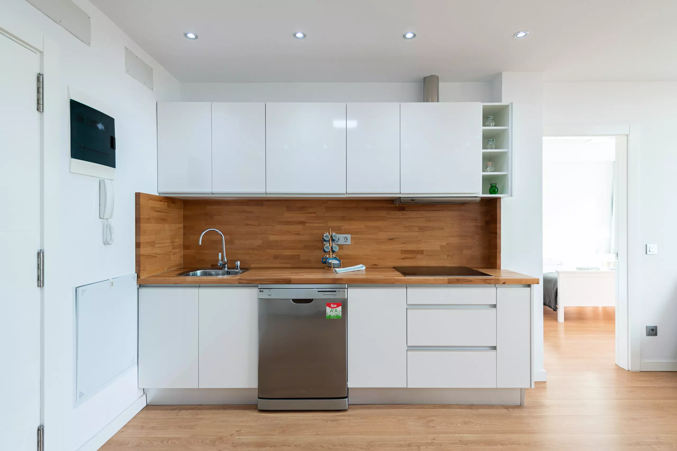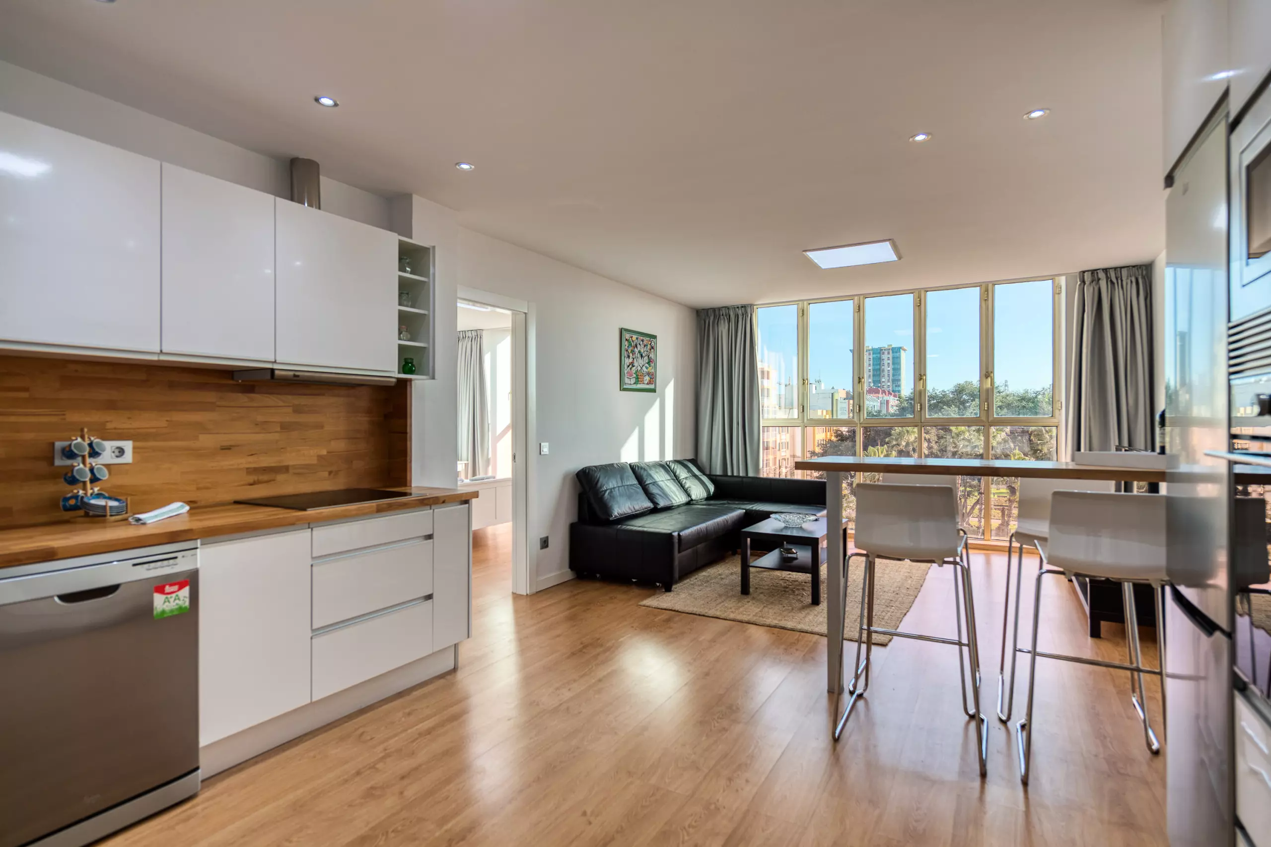 Kitchenette avec plaque vitrocéramique, réfrigérateur, micro-ondes, four, congélateur, lave-linge, sèche-linge, lave-vaisselle, vaisselle, couverts, ustensiles de cuisine, cafetière, grille-pain, bouilloire et presse-agrumes. Il dispose également d'un ascenseur, d'un fer à repasser, d'une connexion Wi-Fi, d'une télévision et de la climatisation.
