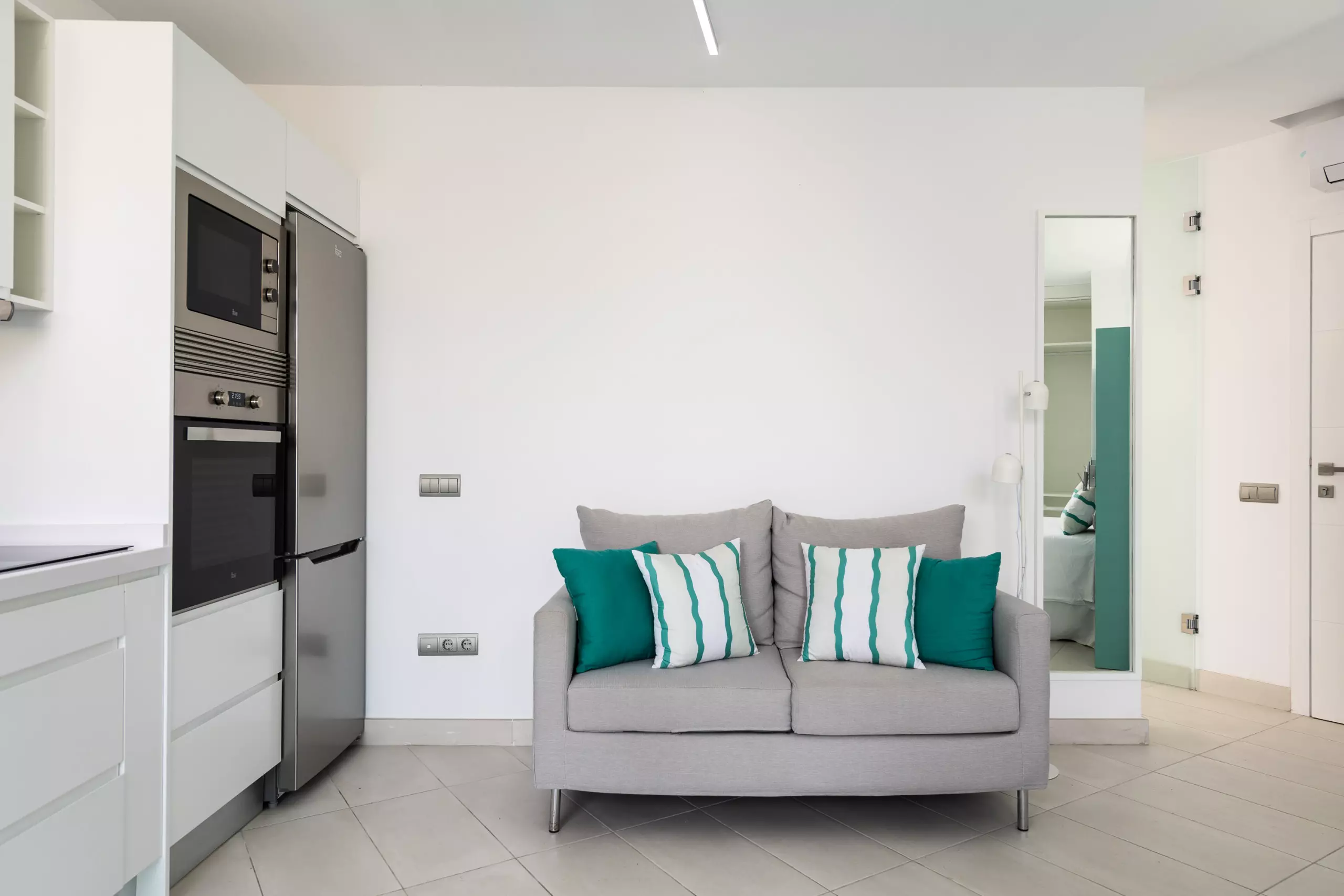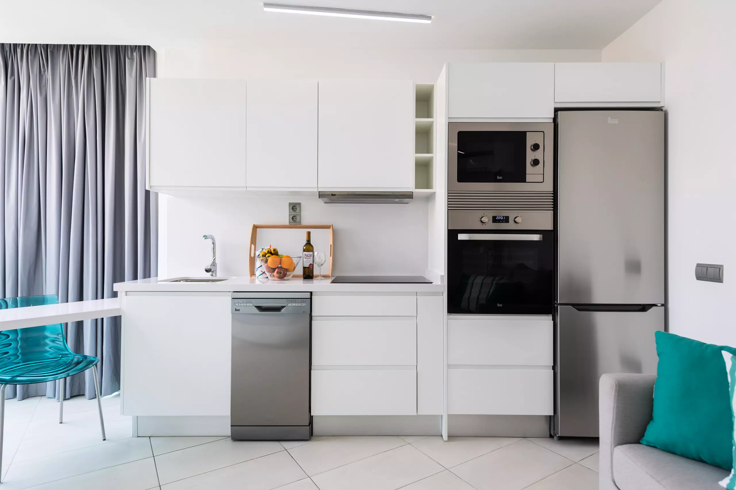 Logement de 25 m2 avec kitchenette entièrement équipée avec plaque vitrocéramique, réfrigérateur, micro-ondes, four, congélateur, lave-linge, sèche-linge, lave-vaisselle, vaisselle, couverts, ustensiles de cuisine, cafetière, grille-pain, bouilloire et presse-agrumes. Il dispose également d'un ascenseur, d'un fer à repasser et d'une télévision à écran plat.