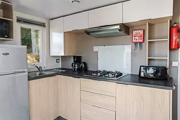 Séjour / coin cuisine : Banquette, Bouilloire, Cafetière électrique (filtre), Cuisine équipée, Evier, Grille-pain, Lave-vaisselle, Micro-ondes, Plaque de cuisson 4 feux gaz, Réfrigérateur avec freezer, Table et chaises, Télévision