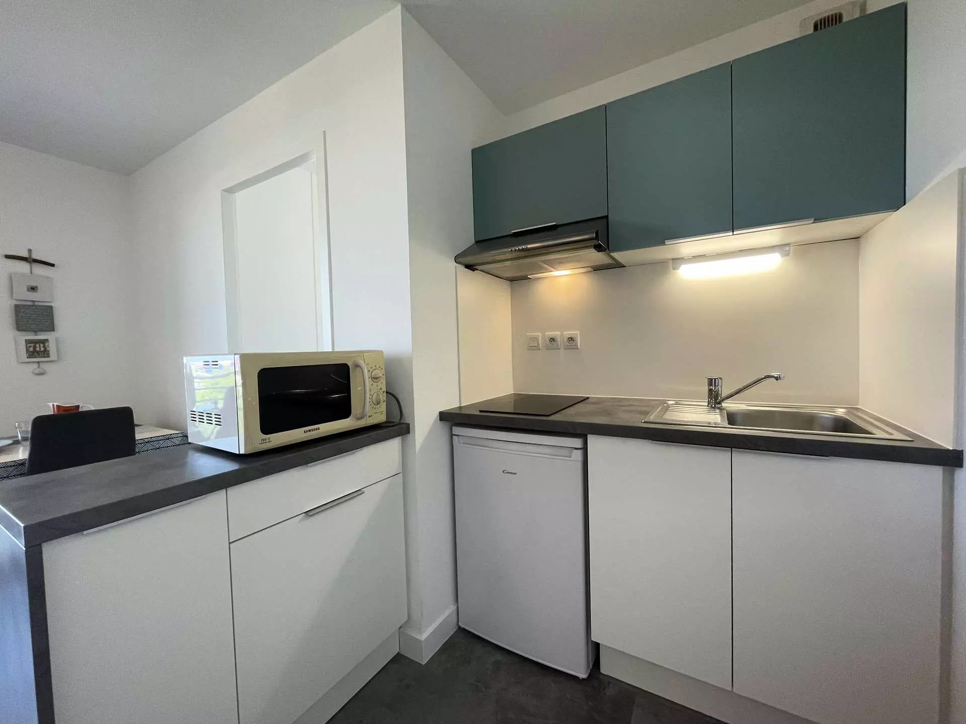 En rez de chaussée de la résidence, il se compose d'un séjour avec convertible 2 places, un coin tv, un coin cuisine équipée, une salle d'eau avec WC.