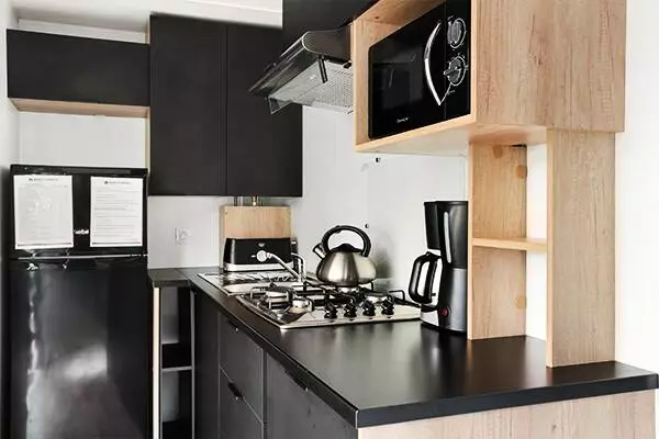 Séjour / coin cuisine : Banquette, Bouilloire, Cafetière électrique (filtre), Cuisine équipée, Evier, Grille-pain, Lave-vaisselle, Micro-ondes, Plaques de cuisson 4 feux électriques ou gaz, Réfrigérateur avec freezer, Table et chaises, Télévision