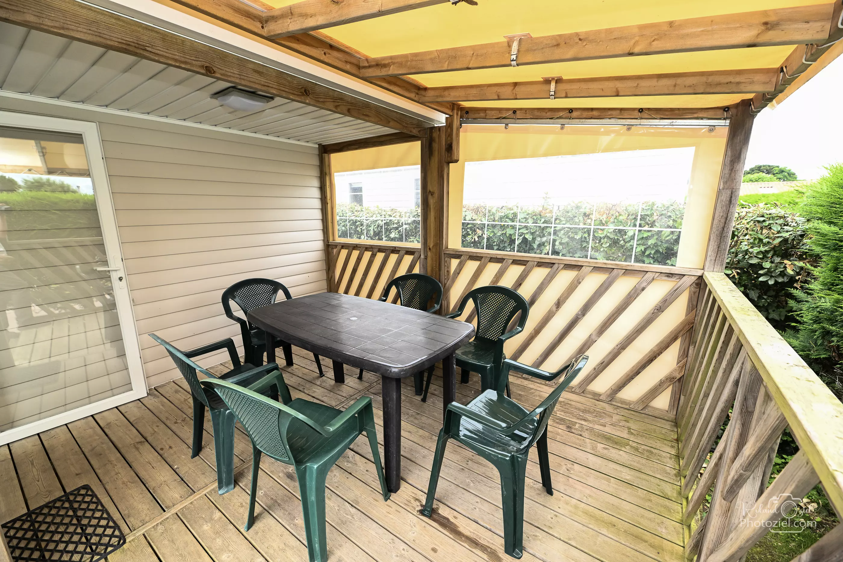 - Extérieur : Terrasse en bois couverte avec salon de jardin