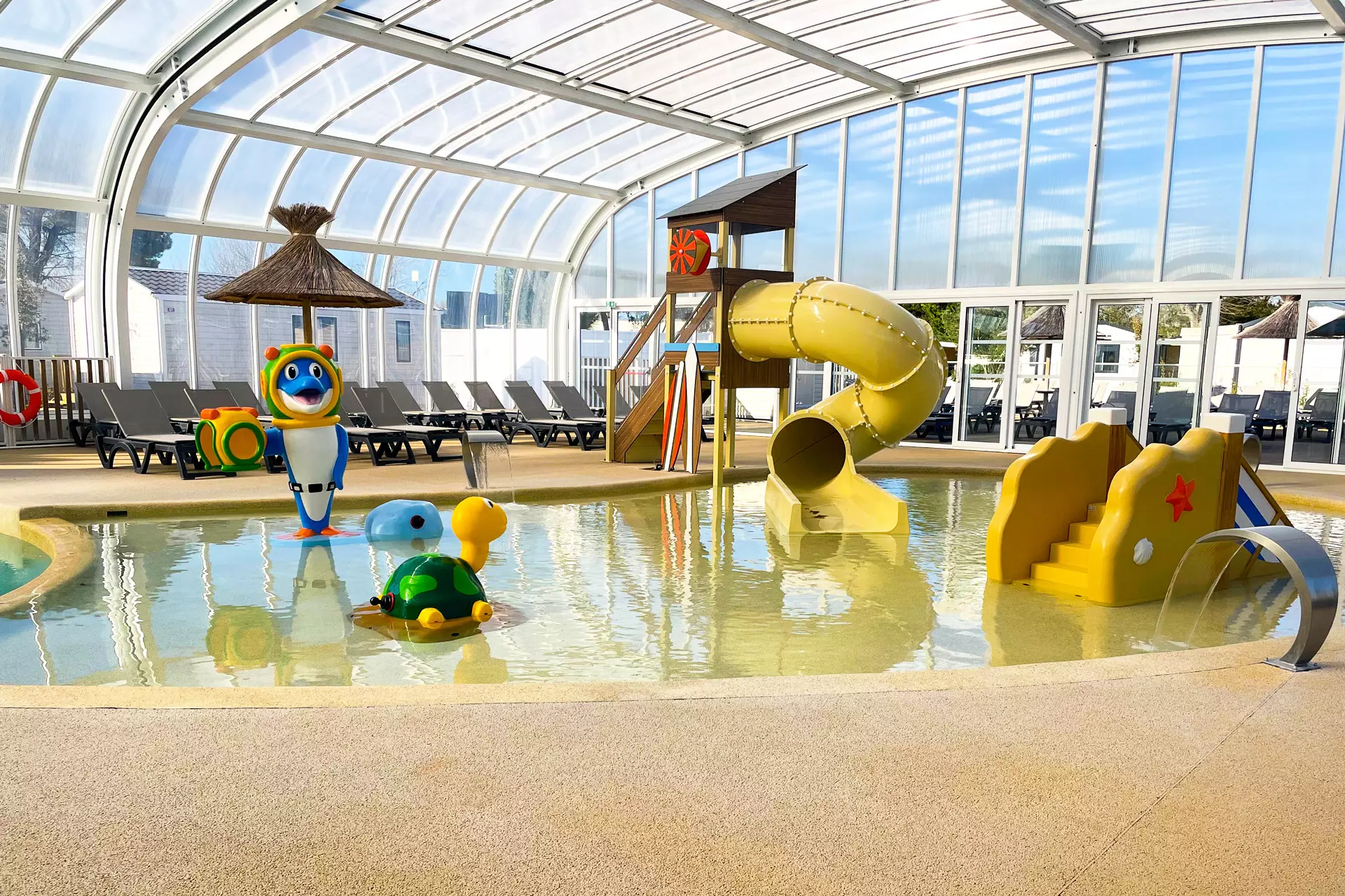- Espace aquatique avec piscine chauffée et pataugeoire avec toit amovible, bassins à jets, jardins d'eau et toboggans (aquatube et bouée)