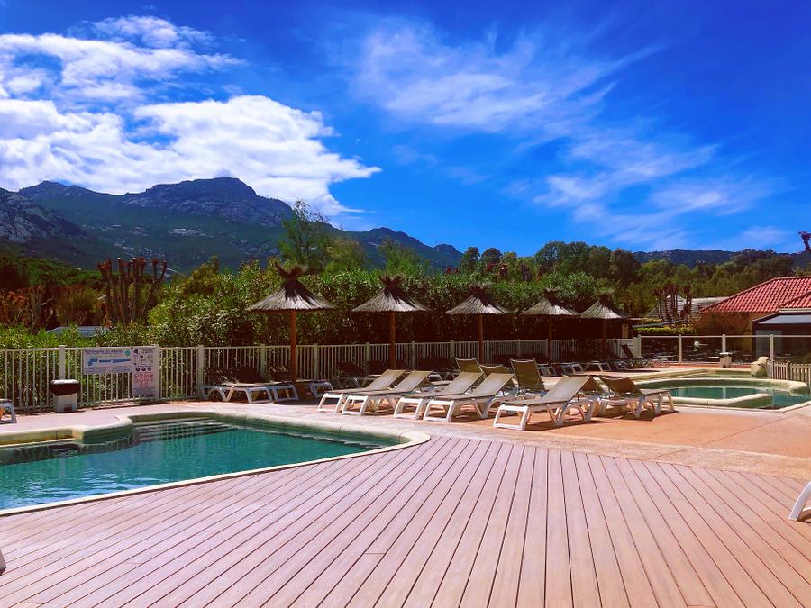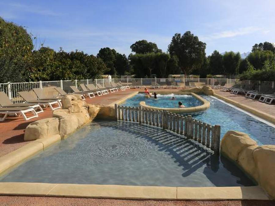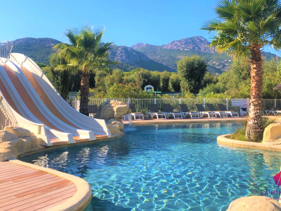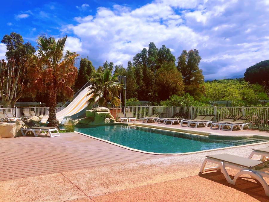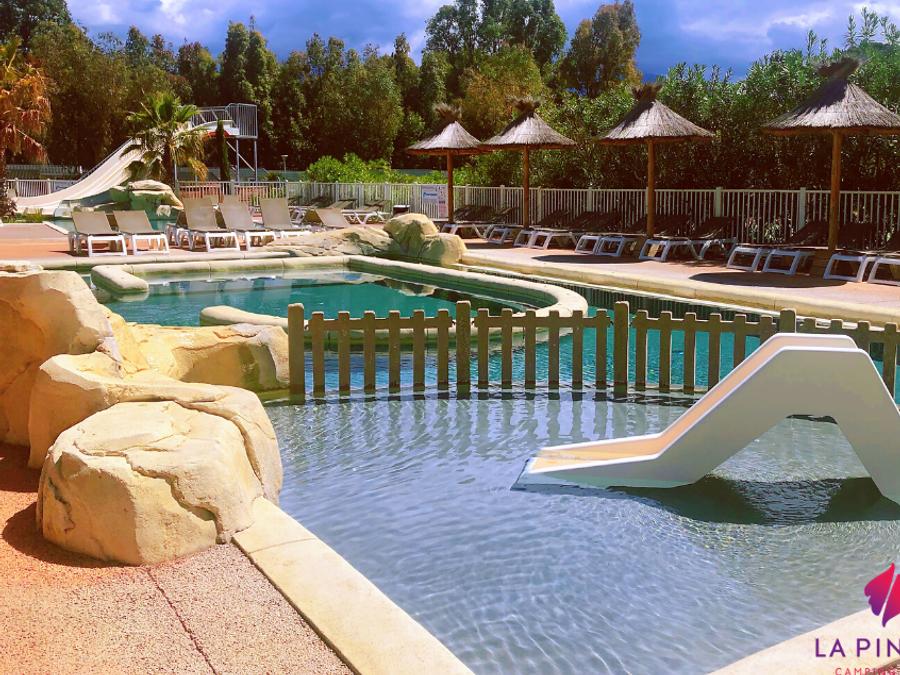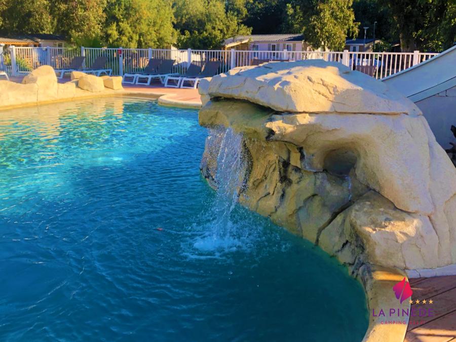 - Description : Profitez sur place de la piscine extérieure chauffée du camping et de deux toboggans aquatiques. Vous aurez également un accès au "Chalet Spa" avec sauna, hammam et bain à remous moyennant un supplément à régler sur place.