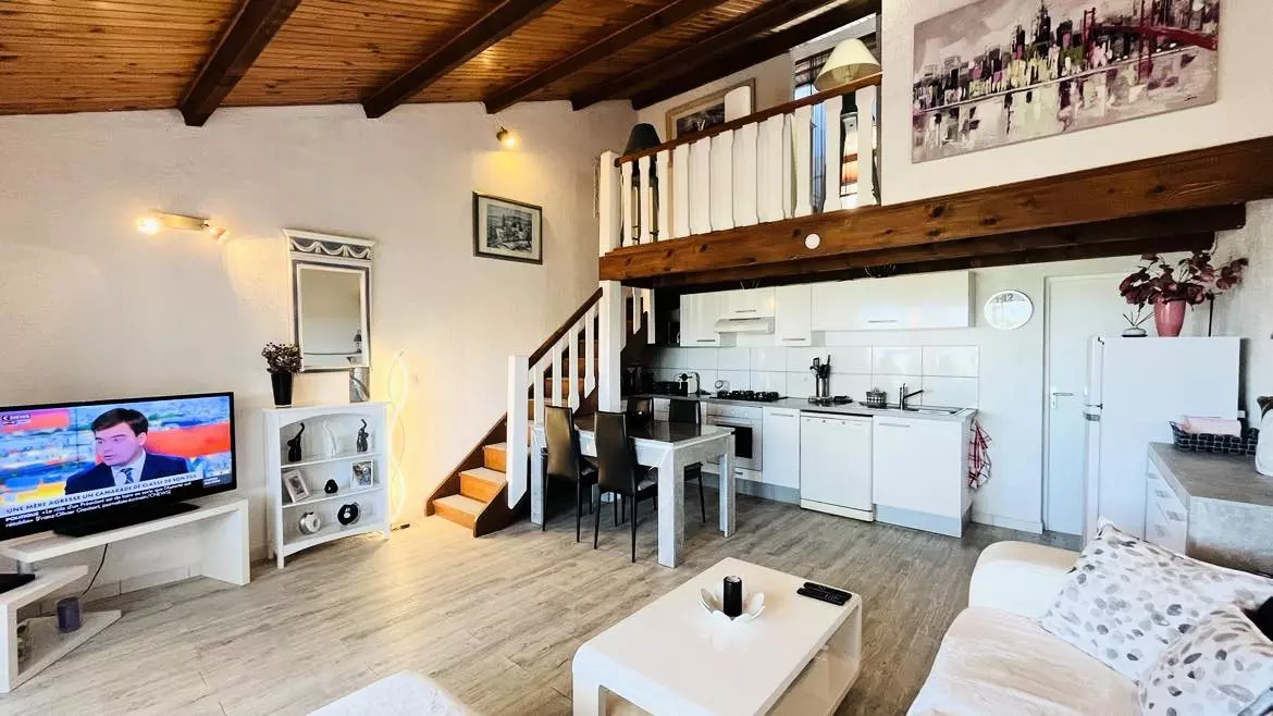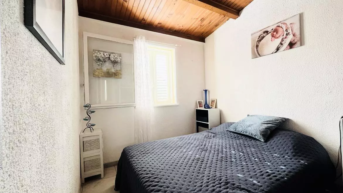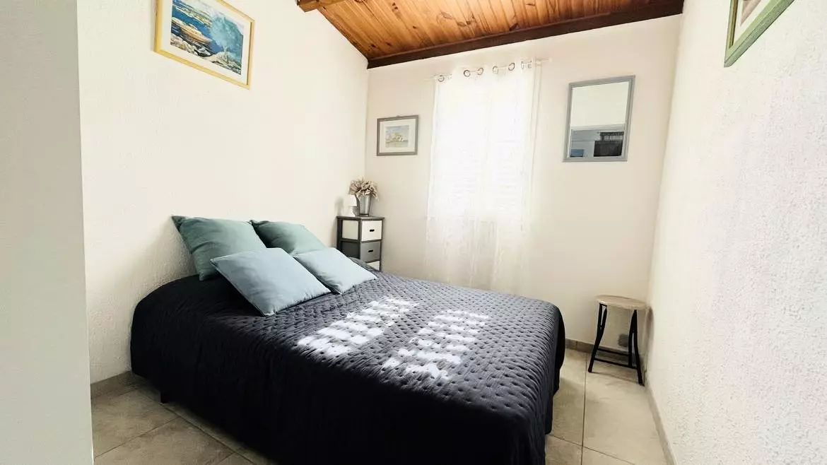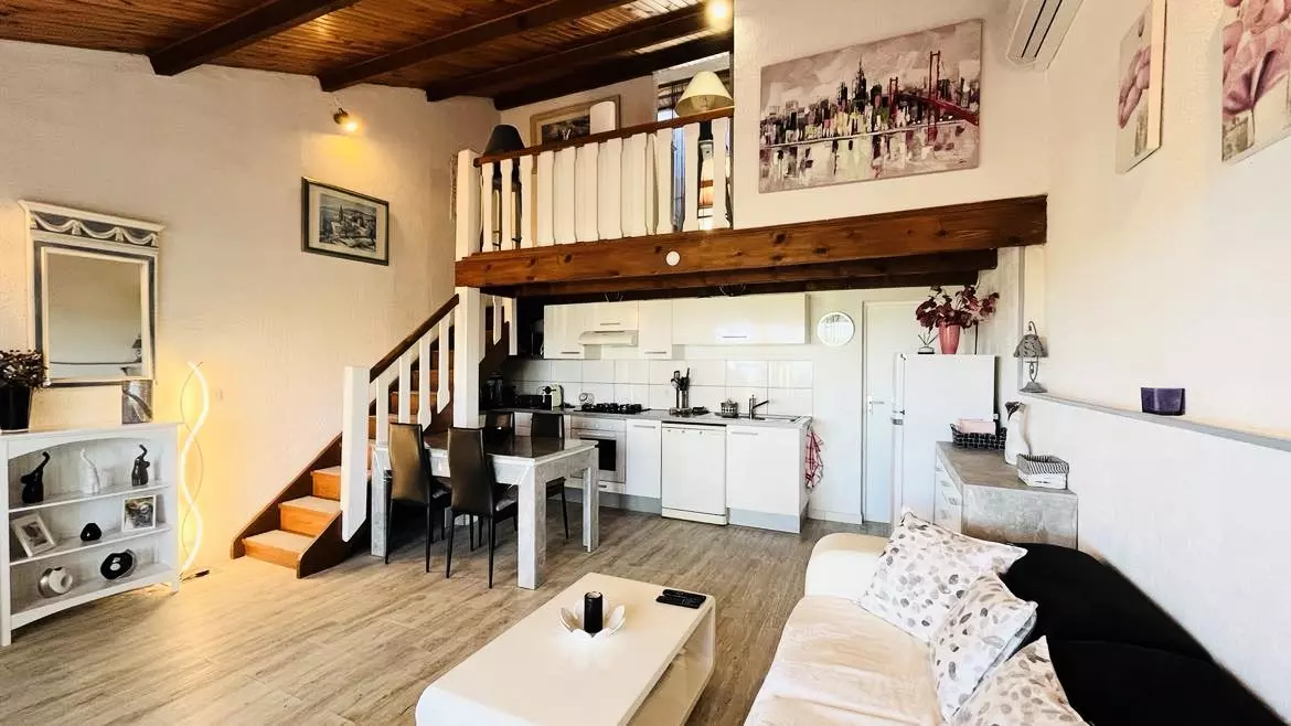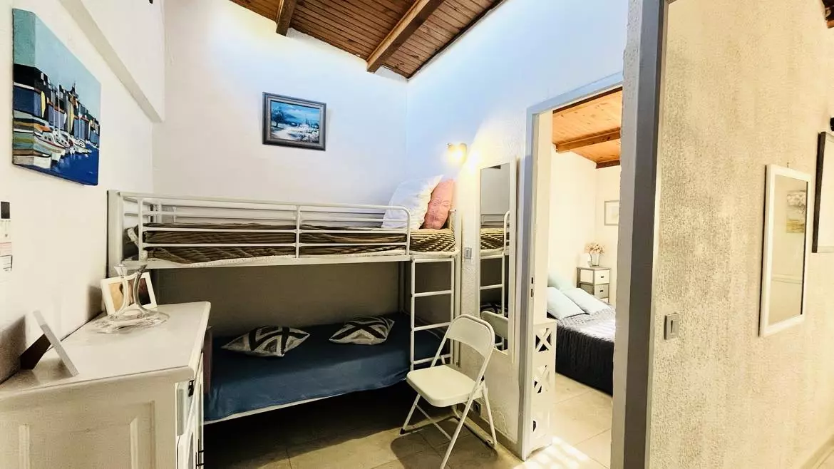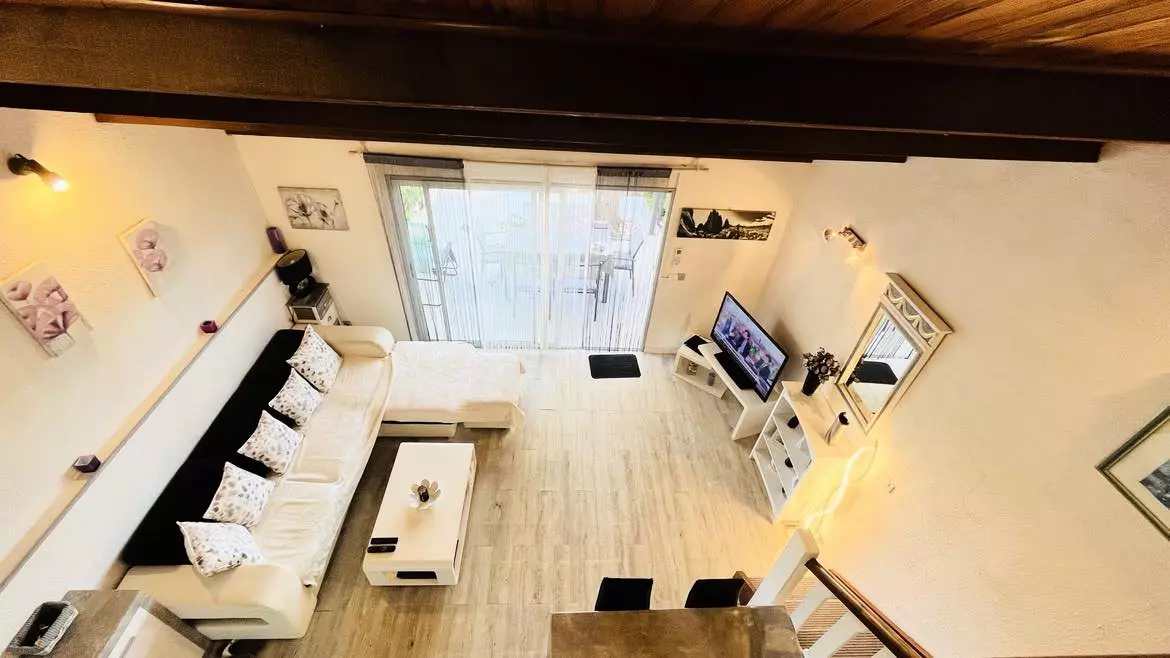L' appartement, au rez-de-chaussée est composé d'une cuisine équipée, d'un salon, d'une salle d'eau, d'un WC indépendant, d'une mezzanine avec coin nuit et deux lits simples, d'une première chambre avec un lit double et climatisation, d'une deuxième chambre avec un lit double et climatisation.