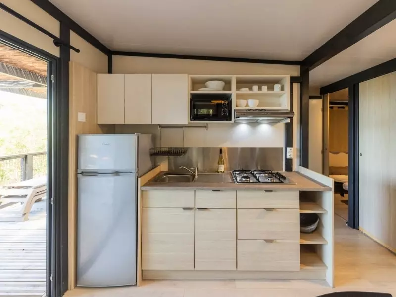 - Coin repas et cuisine équipée avec grand réfrigérateur/congélateur, 4 feux à gaz, micro-ondes, cafetière filtre électrique, bouilloire, grille-pain, ustensiles de cuisine, vaisselle.
