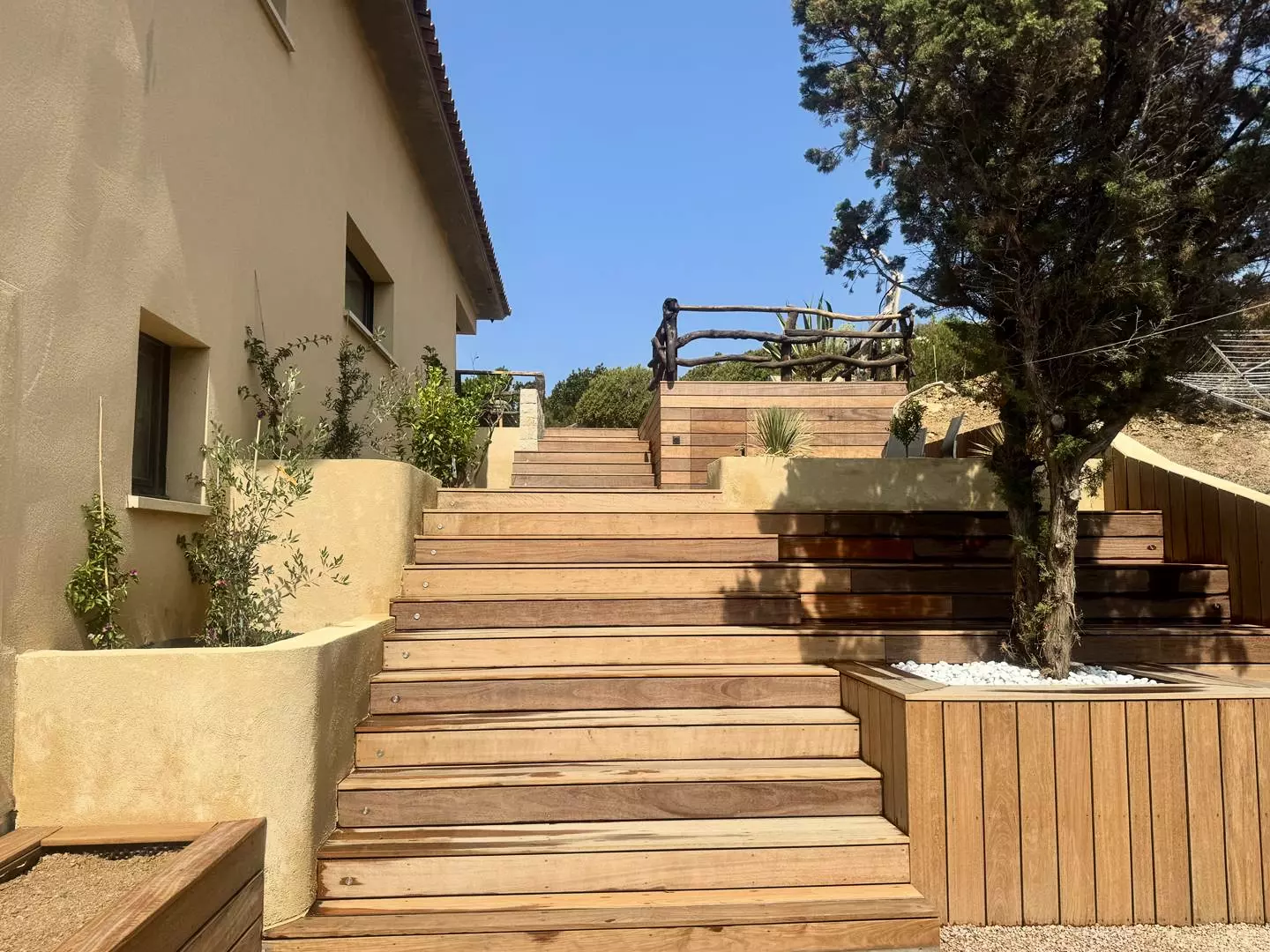 Le véritable atout de cette villa réside dans son majestueux escalier d'architecte réalisé tout en bois qui s'illumine délicatement à la tombée de la nuit et apporte une ambiance chaleureuse et unique à l'ensemble de la maison
