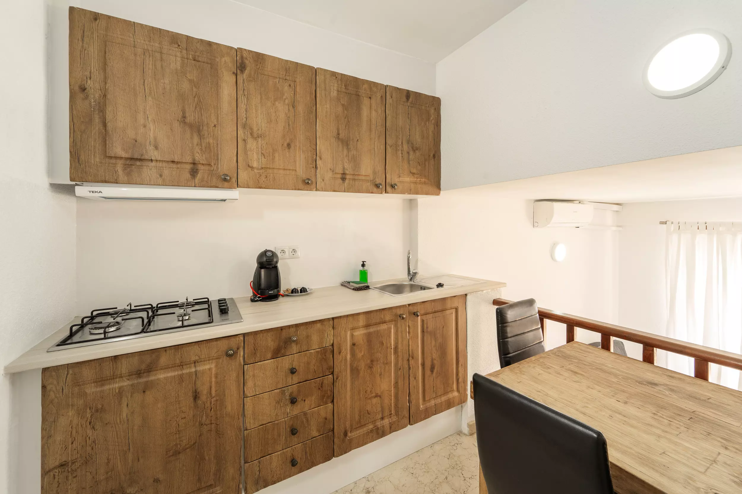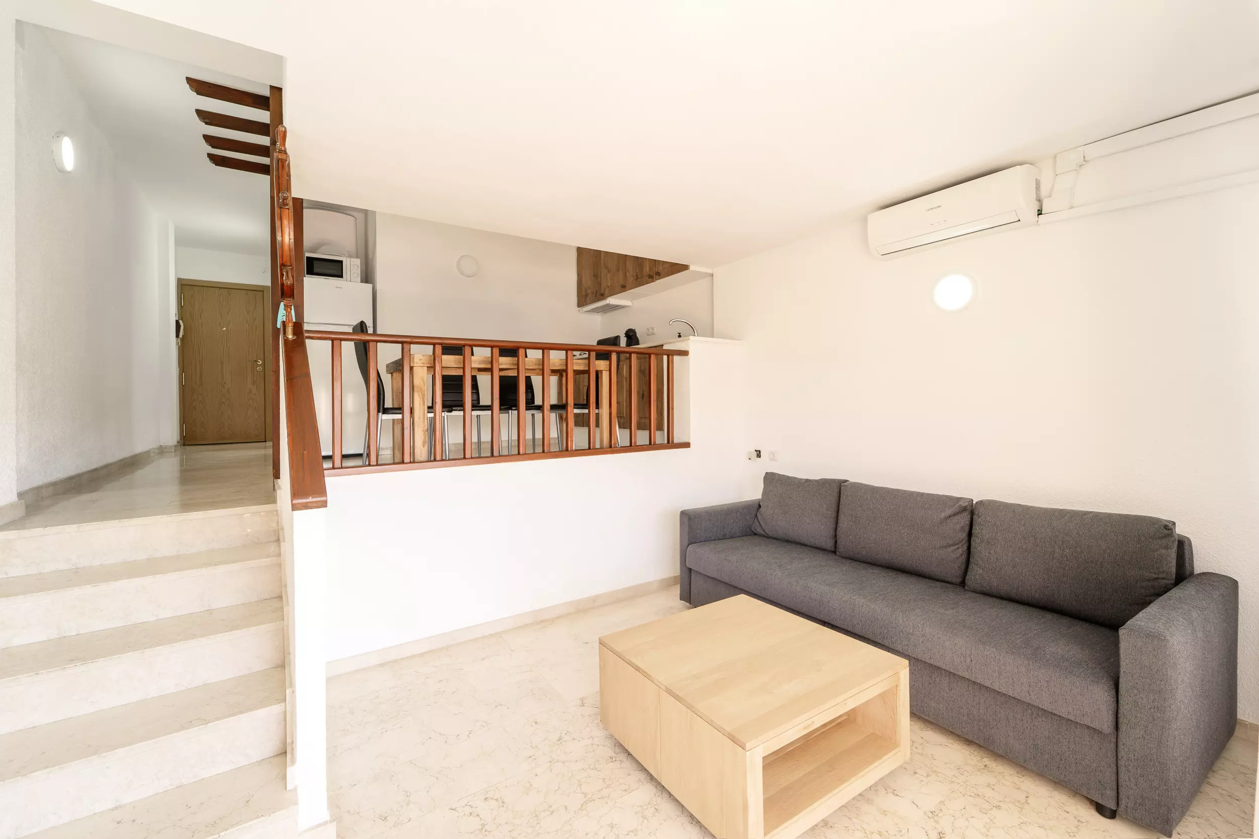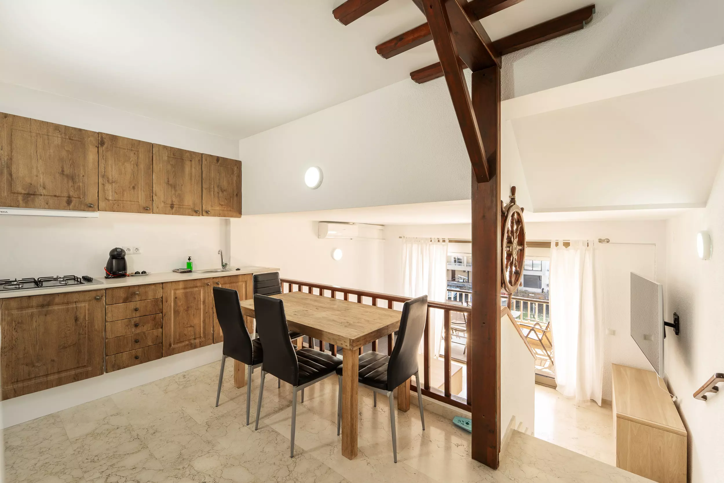 La lumineuse zone de séjour comprend un canapé-lit, une télévision intelligente et un accès à une terrasse meublée avec vue, idéale pour profiter d'un café relaxant. La chambre dispose d'un lit double. L'appartement est équipé de la climatisation et d'une machine à laver.
