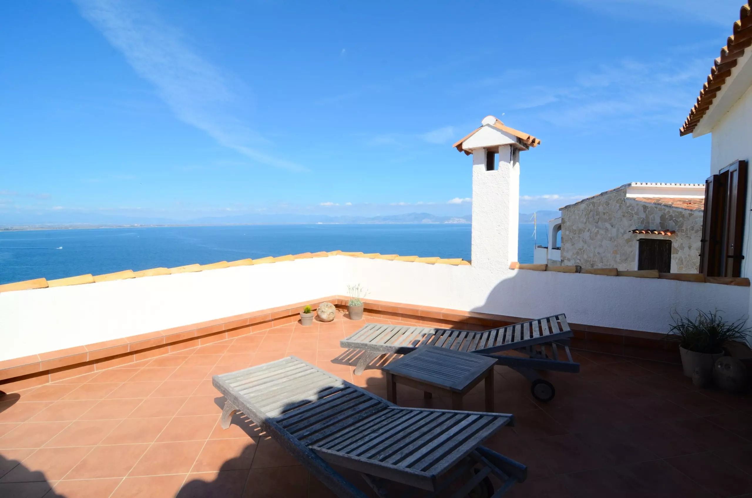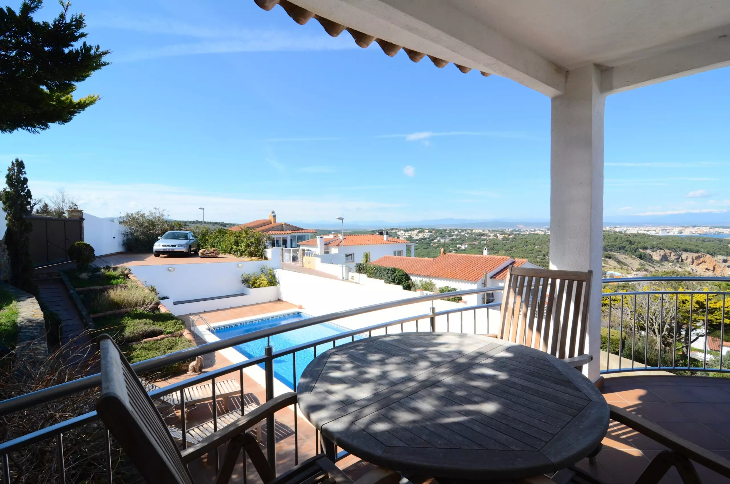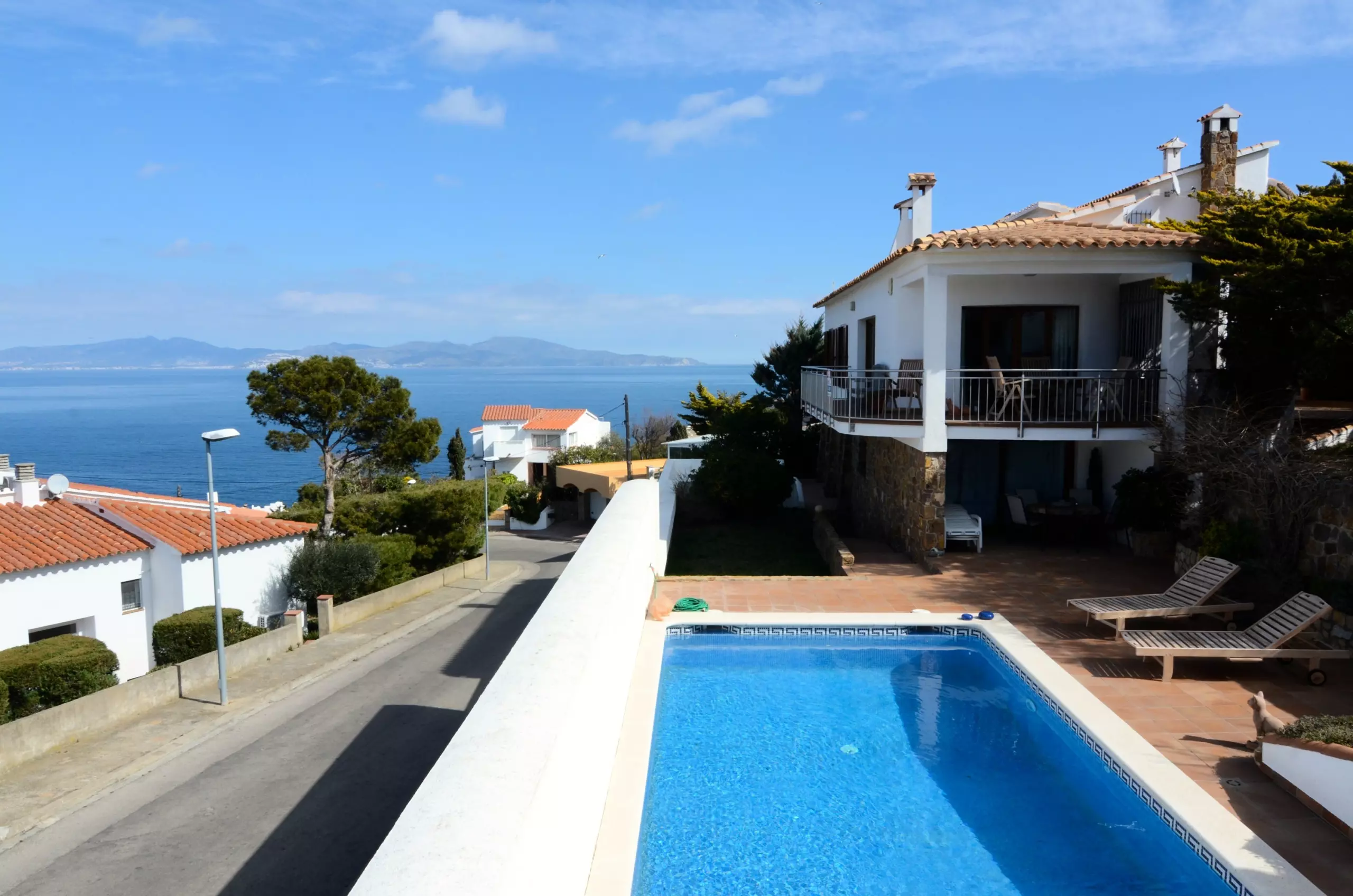 L'extérieur de la maison, entièrement clôturé, dispose d'un parking pour 2 voitures, un petit jardin, une piscine privée, un barbecue, une salle à manger extérieure et divers porches et terrasses où se détendre et profiter de la vue sur la mer vers le Golfe de Roses et les Pyrénées.