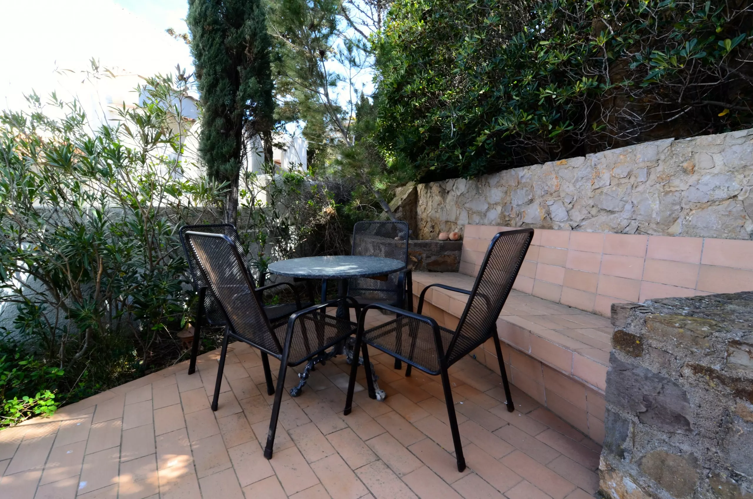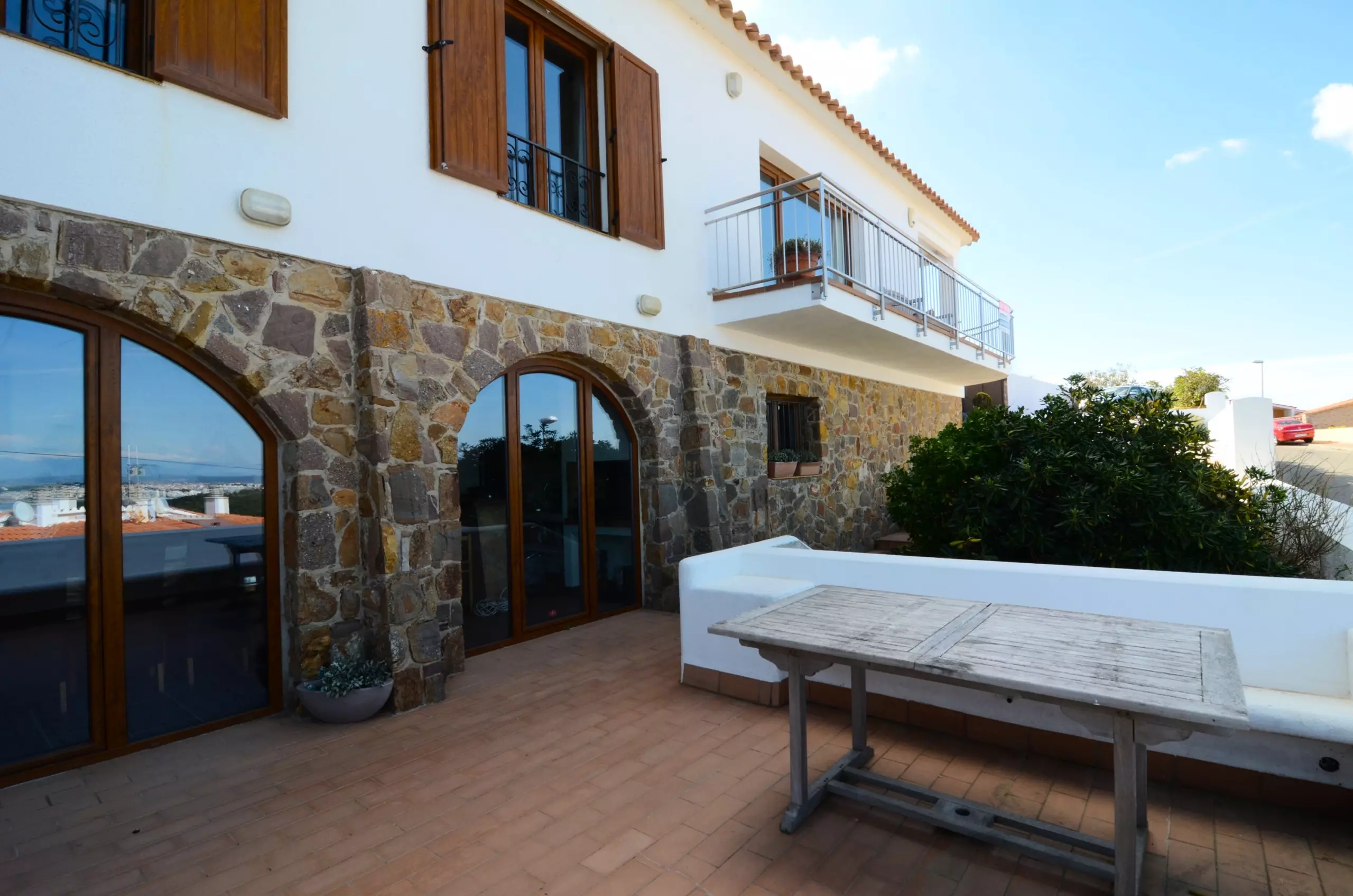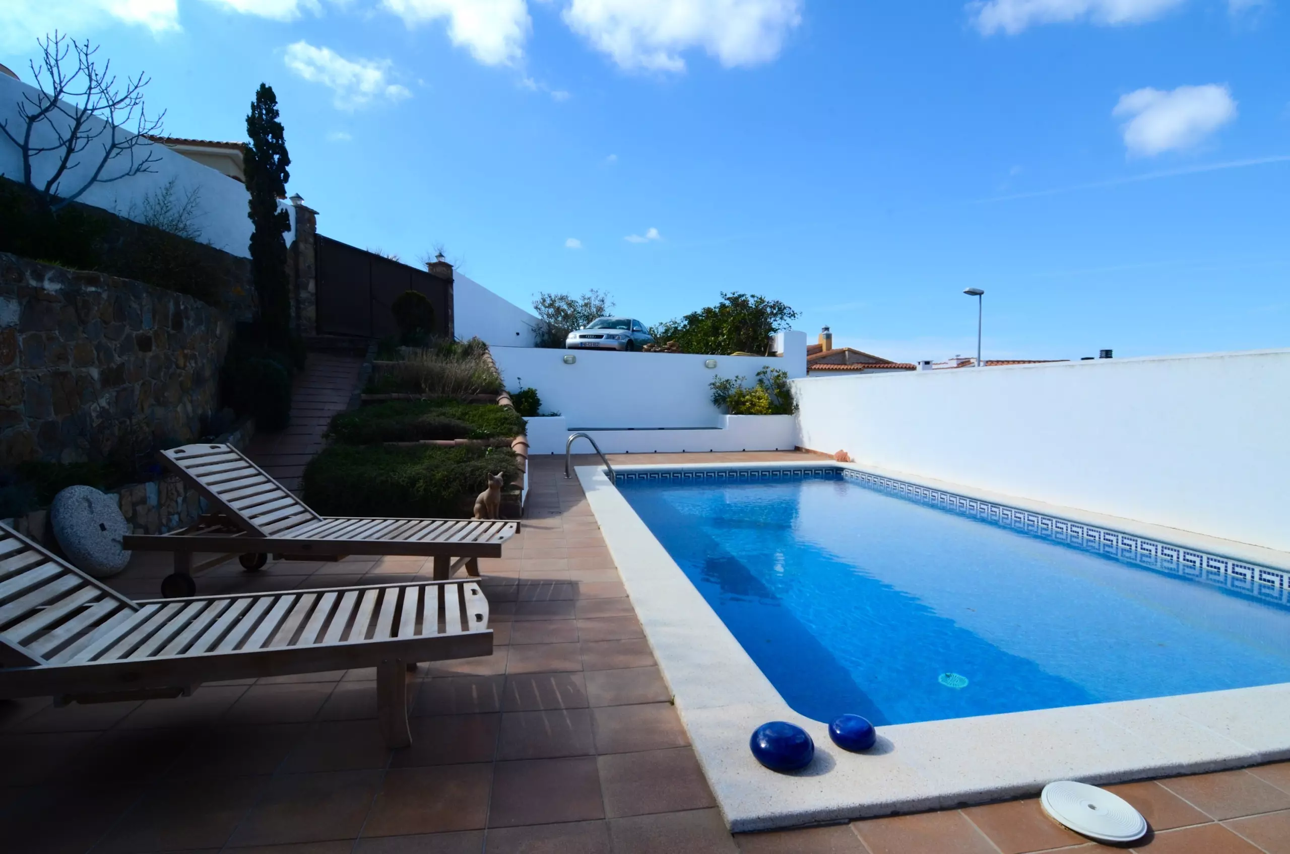 L'extérieur de la maison, entièrement clôturé, dispose d'un parking pour 2 voitures, un petit jardin, une piscine privée, un barbecue, une salle à manger extérieure et divers porches et terrasses où se détendre et profiter de la vue sur la mer vers le Golfe de Roses et les Pyrénées.