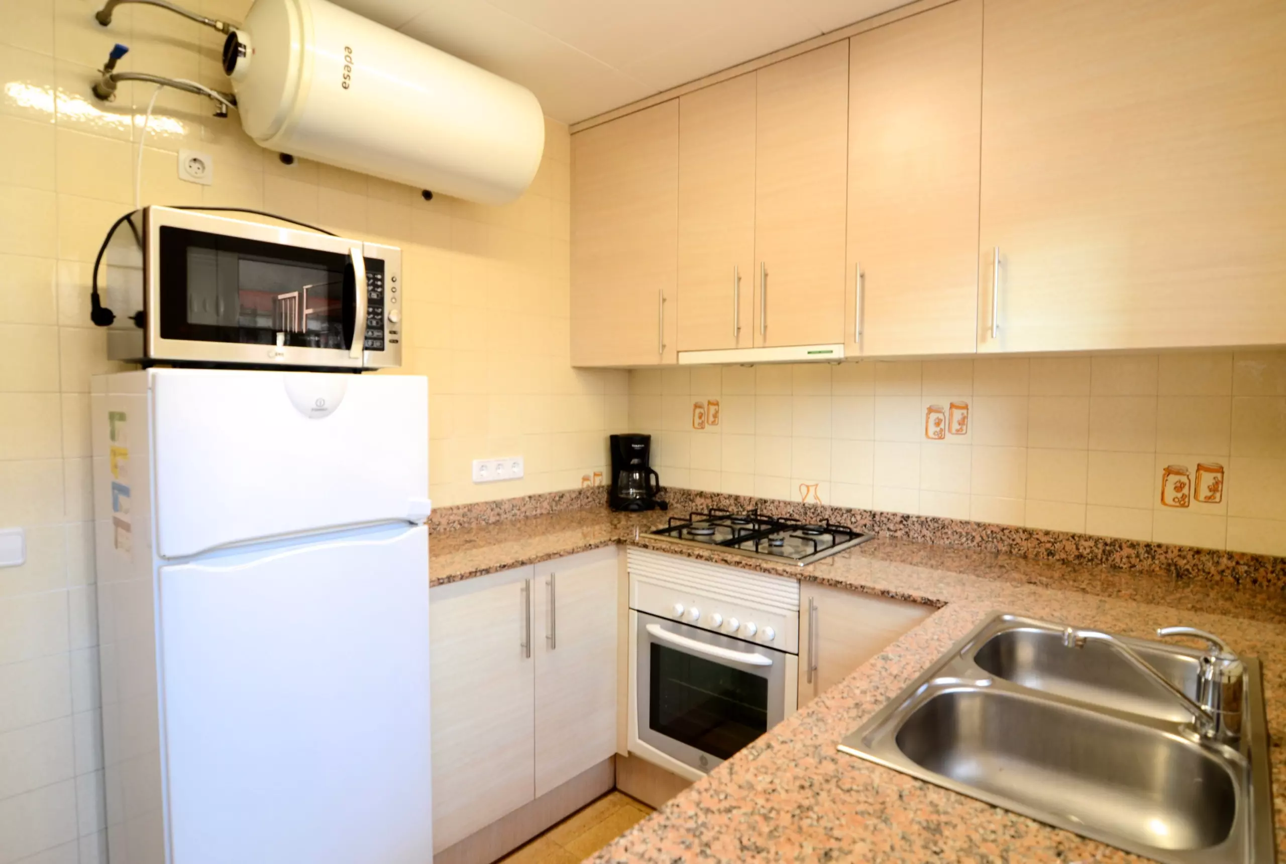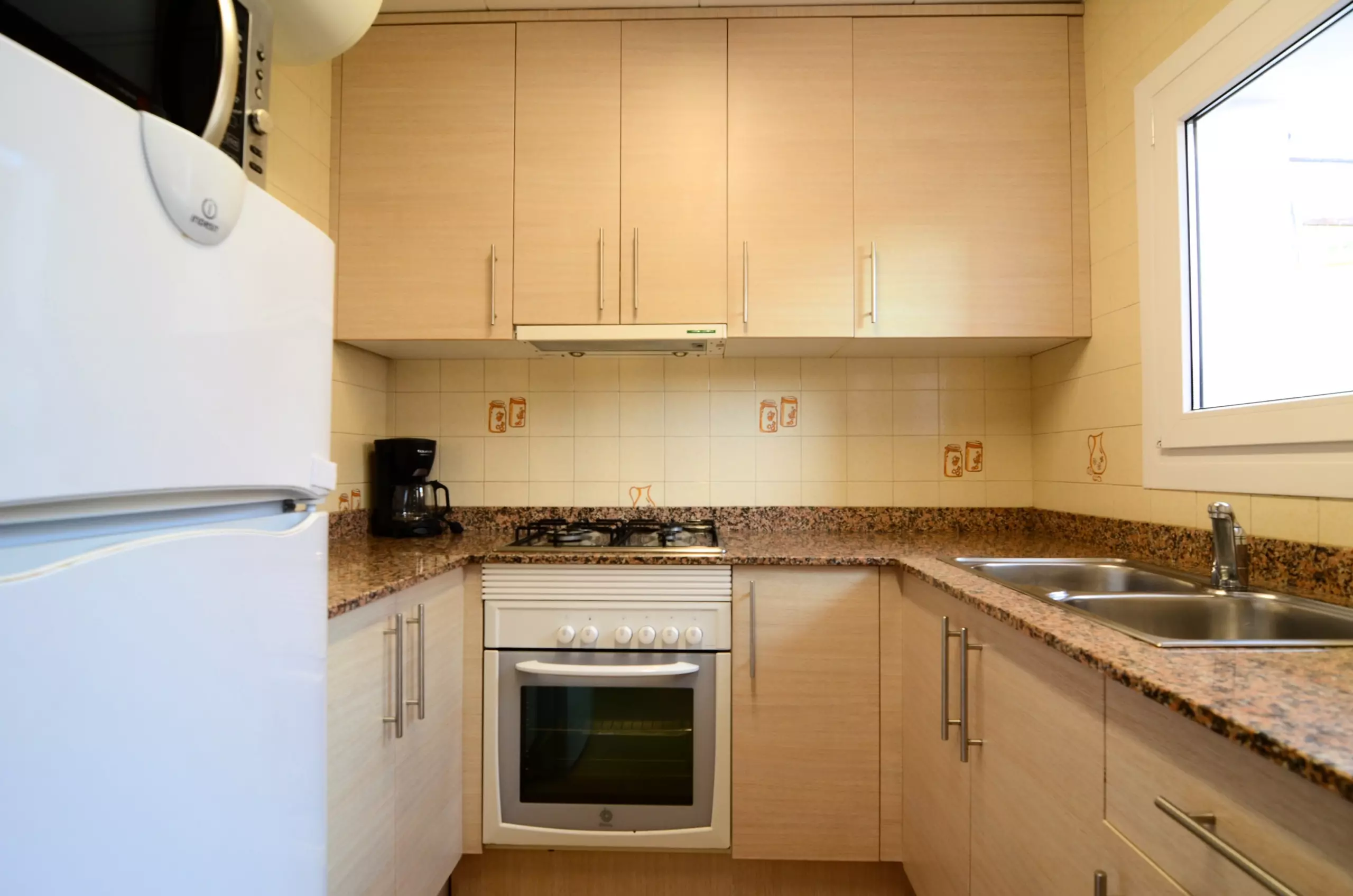 La cuisine, équipée d'équipements modernes, dispose également d'un petit balcon extérieur pour plus de commodité. Cet appartement récemment rénové assure un espace de vie frais et moderne pour un séjour mémorable à l'Estartit.