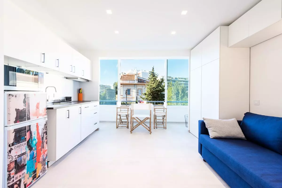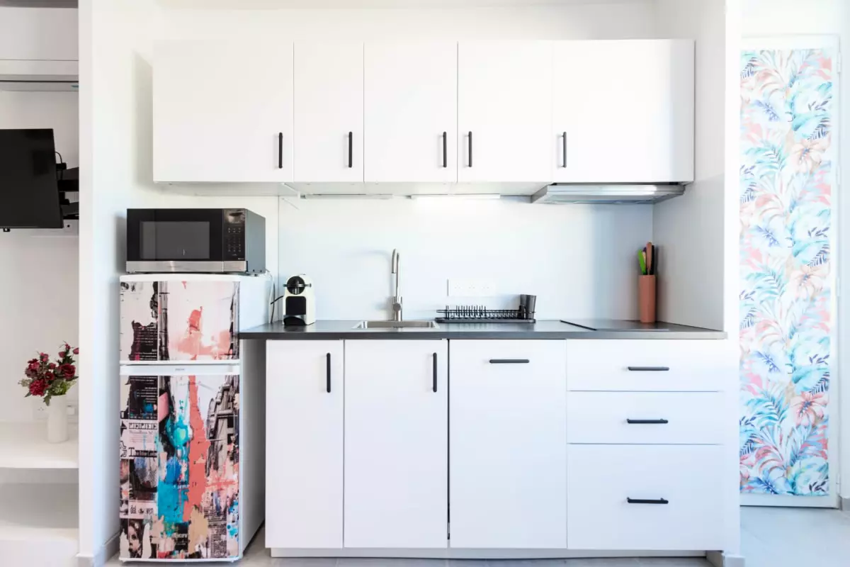 - En entrant, vous arrivez dans un salon avec un canapé-lit (140x200cm), une smart TV, une table pour vos repas, et une cuisine ouverte équipée (plaques, réfrigérateur, micro-ondes, lave-vaisselle, - cafetière…)