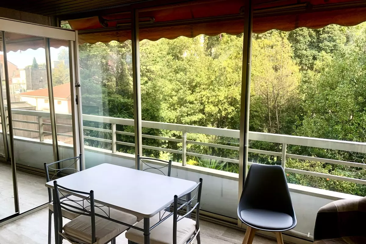 Loggia accessible depuis le salon offrant une vue dégagée sur un parc arboré sans vis-à-vis