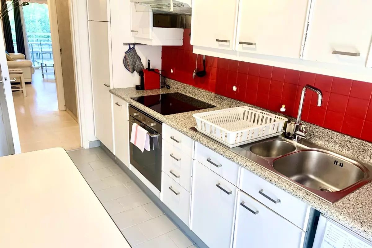 Cuisine indépendante toute équipée (frigidaire, lave-linge, micro-onde, four, machine à café, bouilloire, ustensiles de cuisine), accès balcon