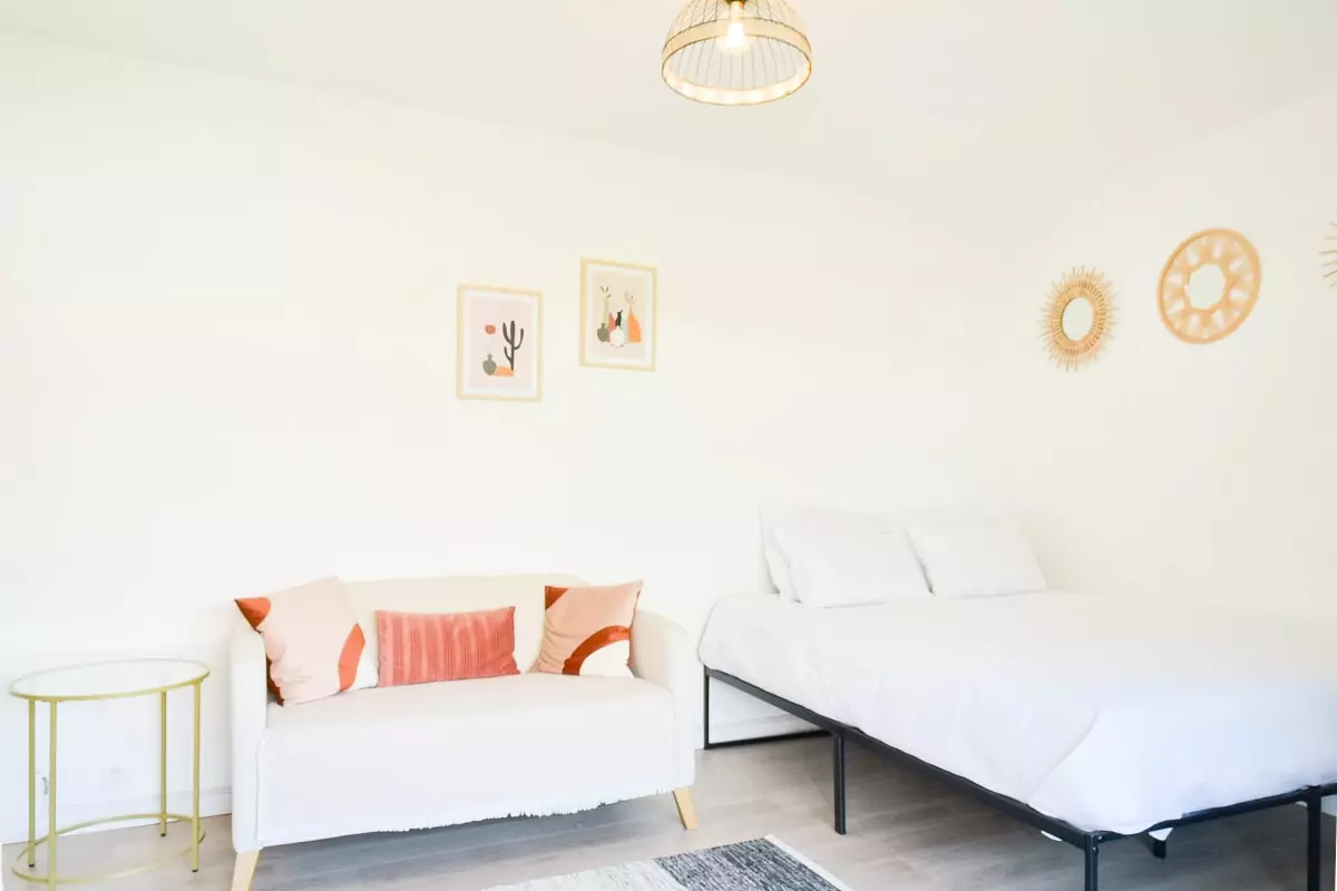 - Pièce à vivre avec espace TV et canapé, un lit queen size et un accès à une grande terrasse.